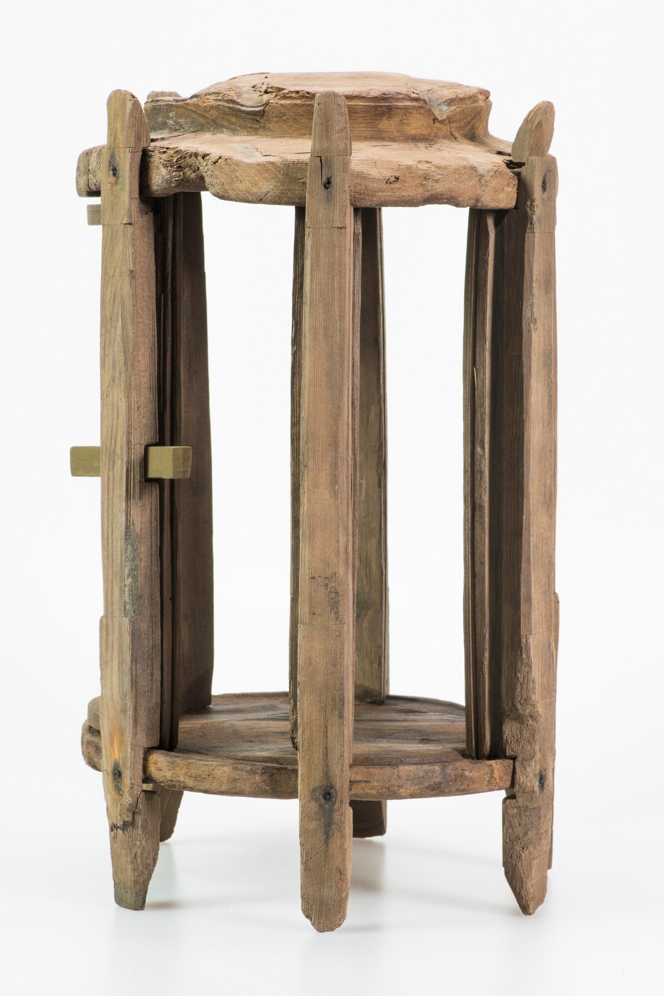 Lantaarn; ronde bodem, zes poten en zes spijlen, een deurtje bestaande uit twee spijlen en aangevulde onder- en bovenkant, aangevulde grendel, ronde bovenkant met ronde opening in het midden; twee schroeiplekken op de bodem; kleine spijkergaatjes (?) op de schroeiplekken
