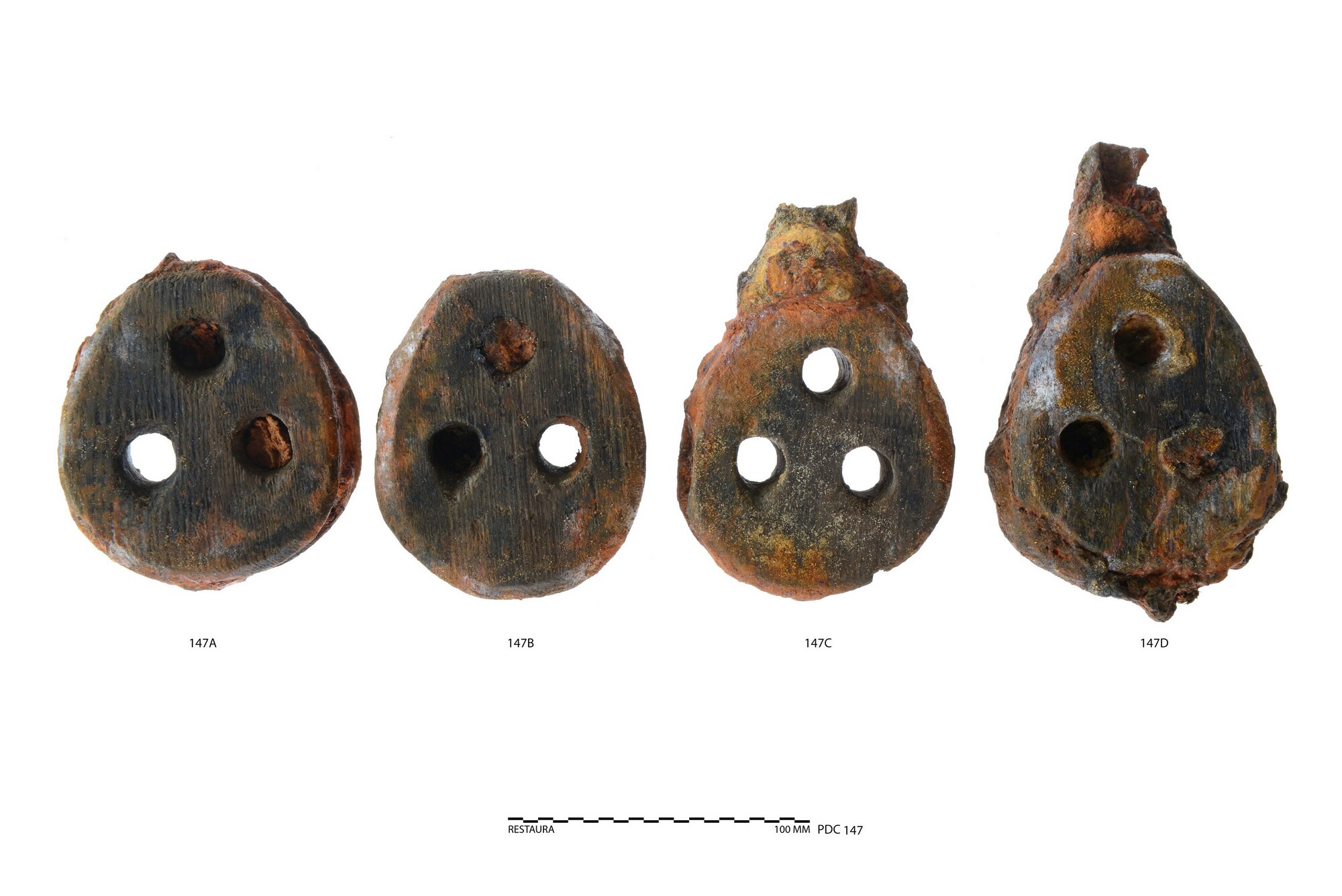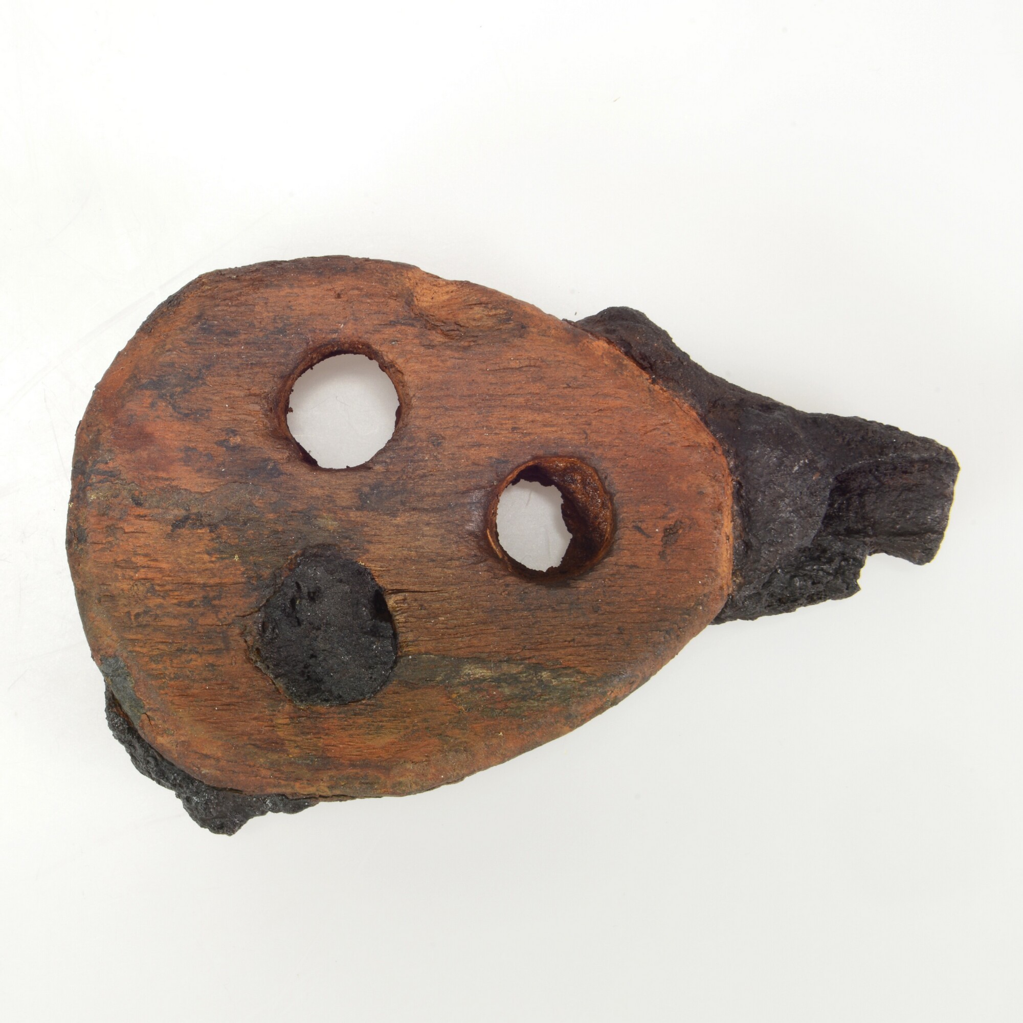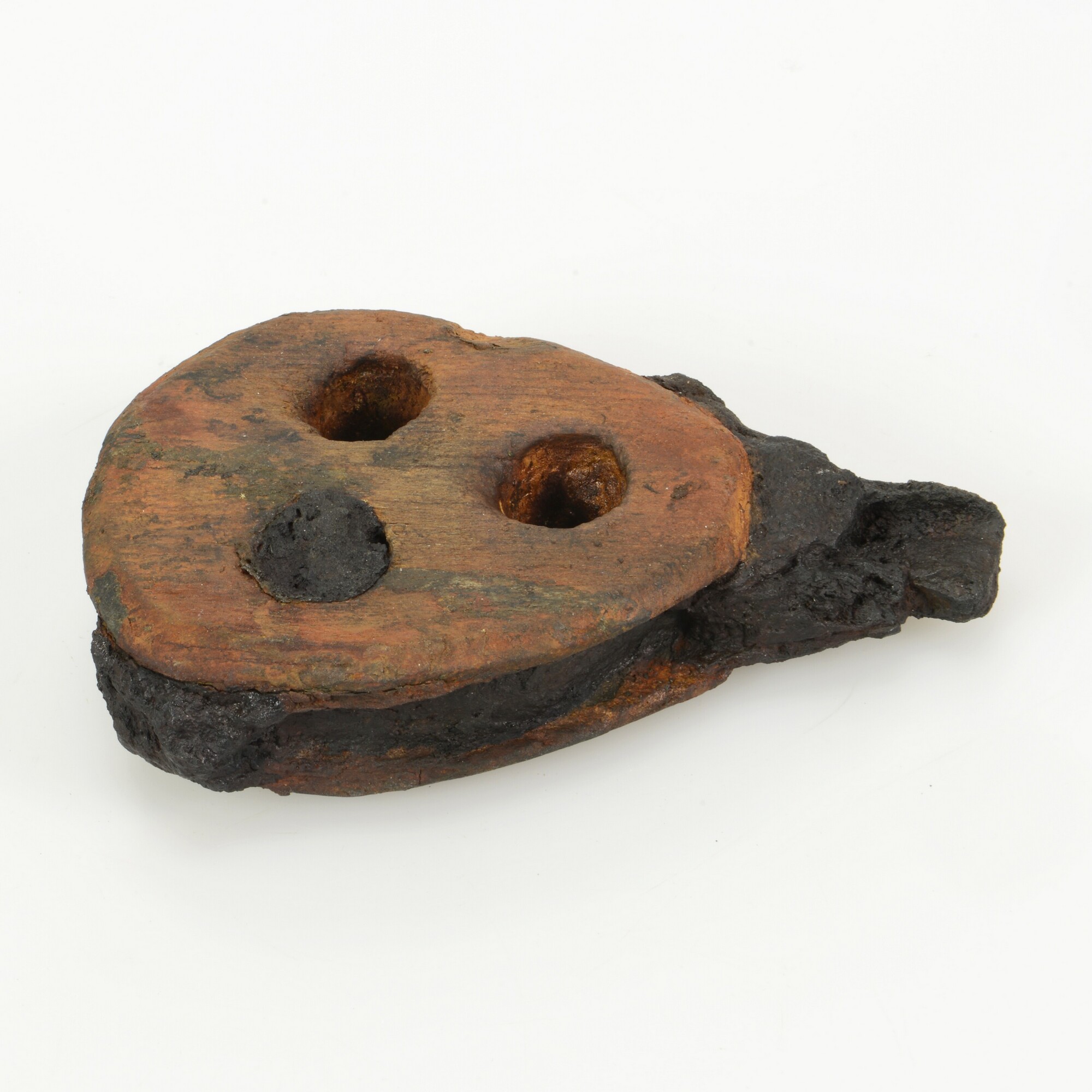 Jufferblok; (resten) touw in twee van de gaten en in de groef, overdekt met een laagje ijzeroxide
