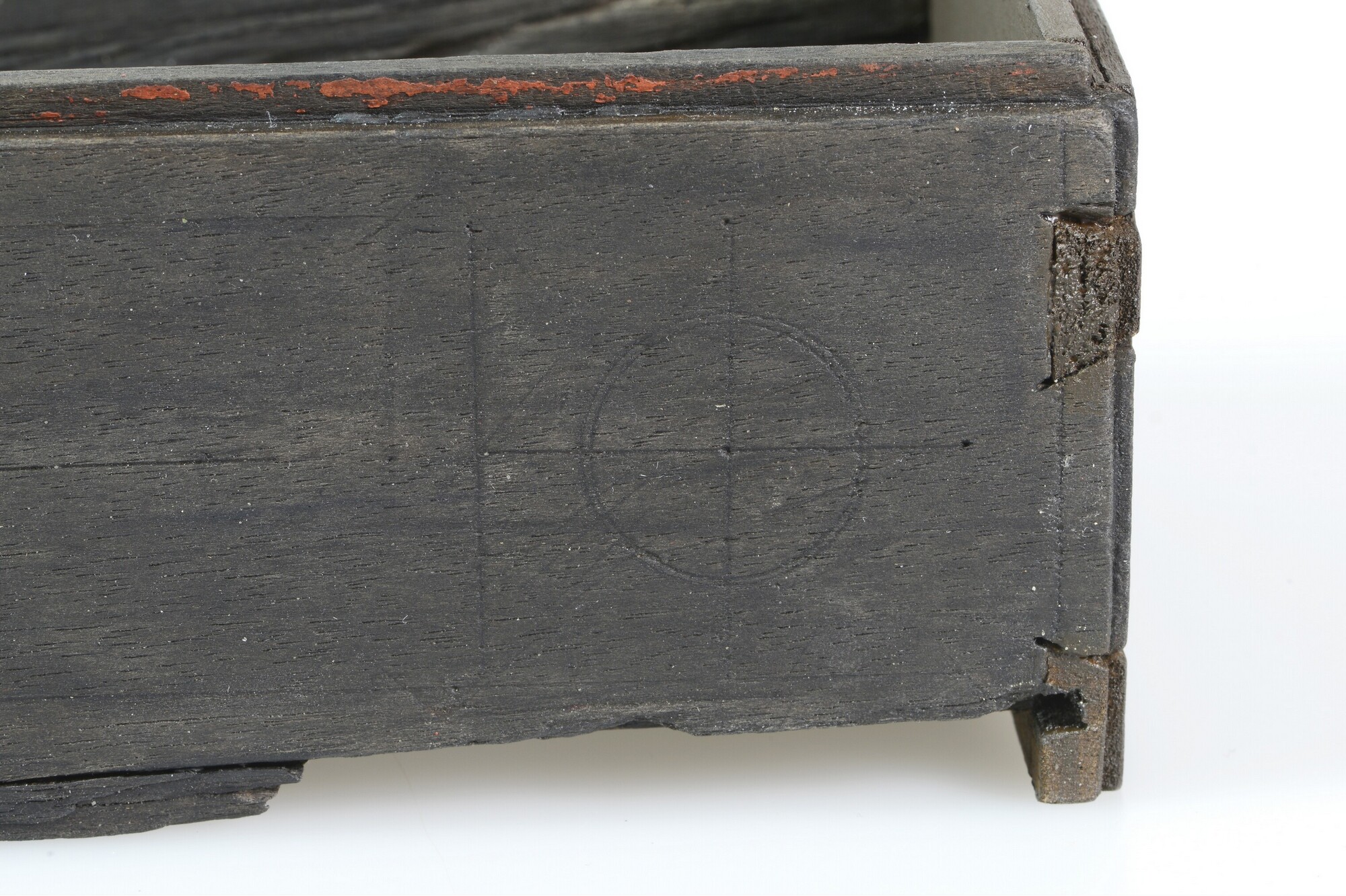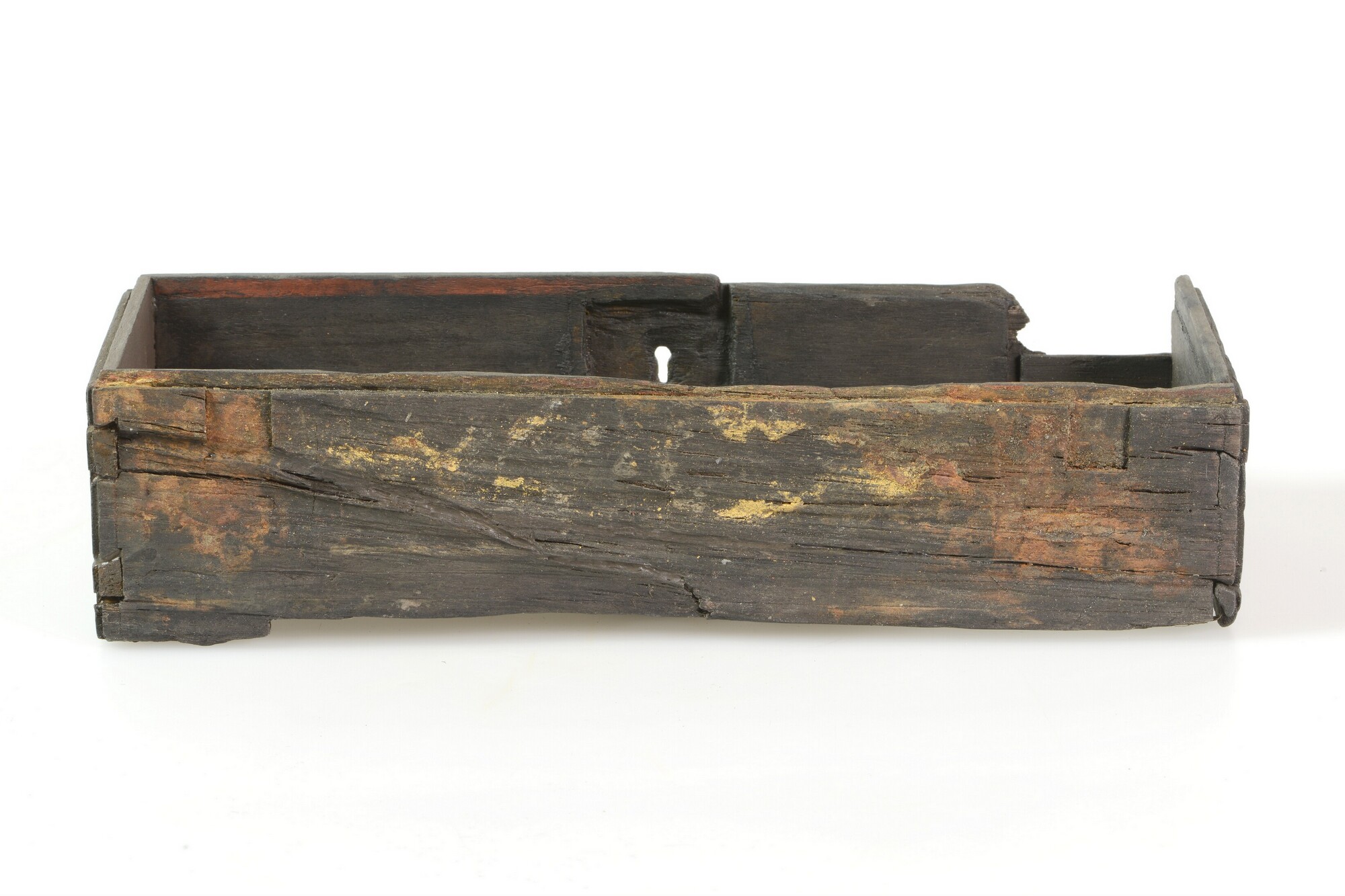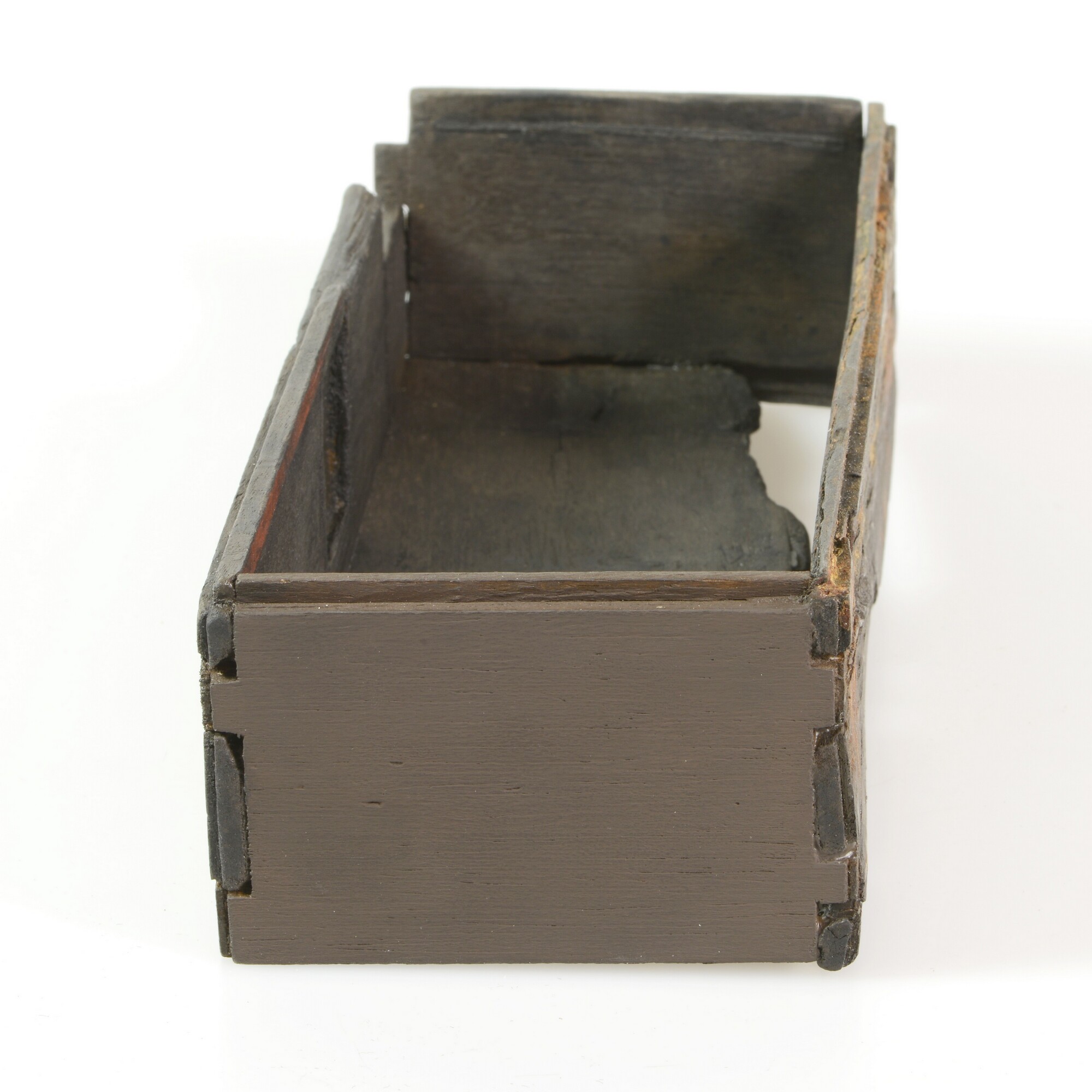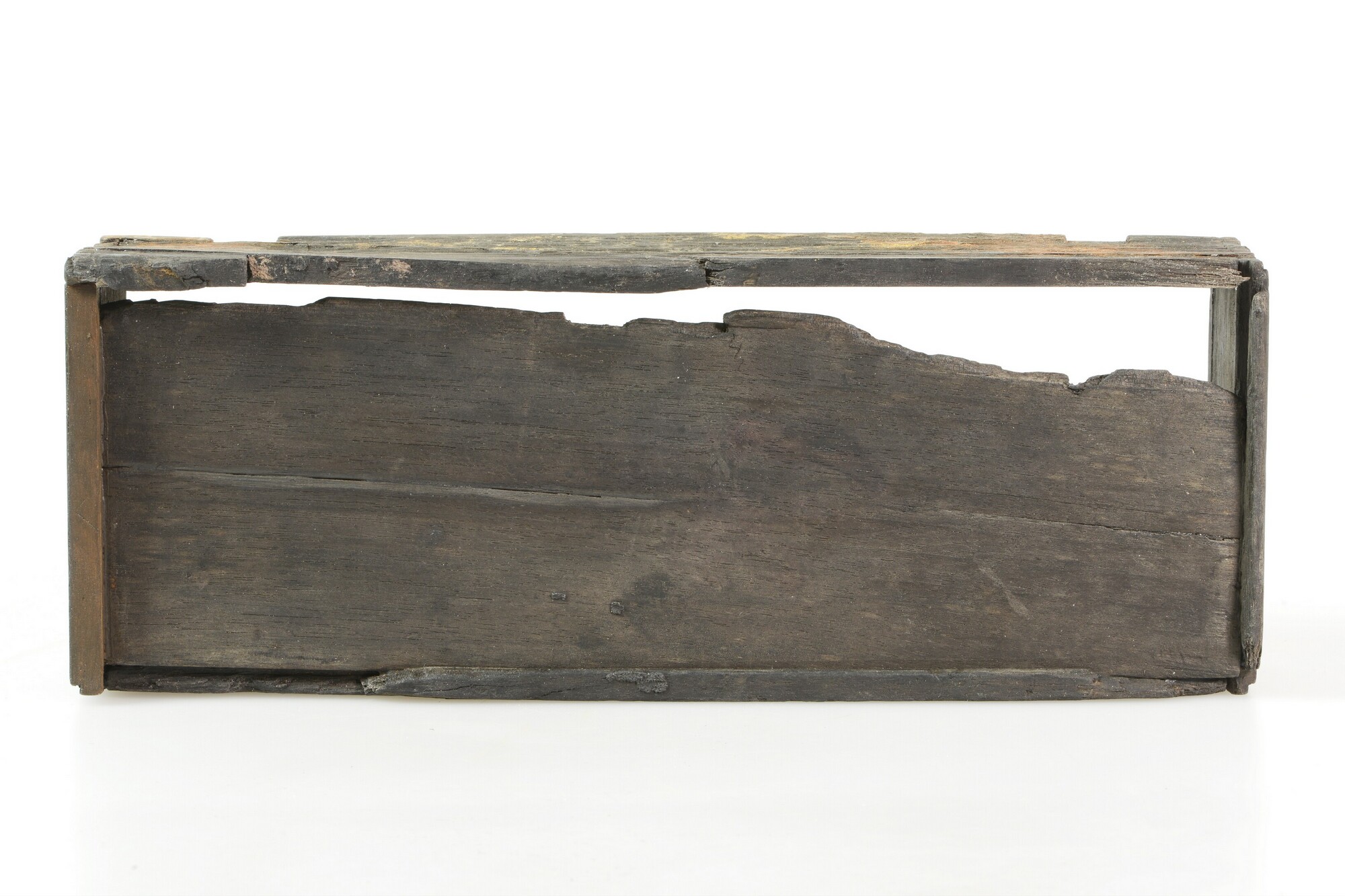 Kist; schrijfdoos?; sleutelgat aan de voorkant; versiering van ingekraste lijnen, waarop oorspronkelijk inlegwerk was bevestigd; resten van goudverf op de achterkant; resten van rode verf langs de bovenrand; twee verdiepingen in de achterkant waarin ijzeren scharnieren hebben gezeten; verticale groef aan de binnenkant voor een inzetplankje; de rechter zijkant is aangevuld; fragment met zilvercorrosie van ...