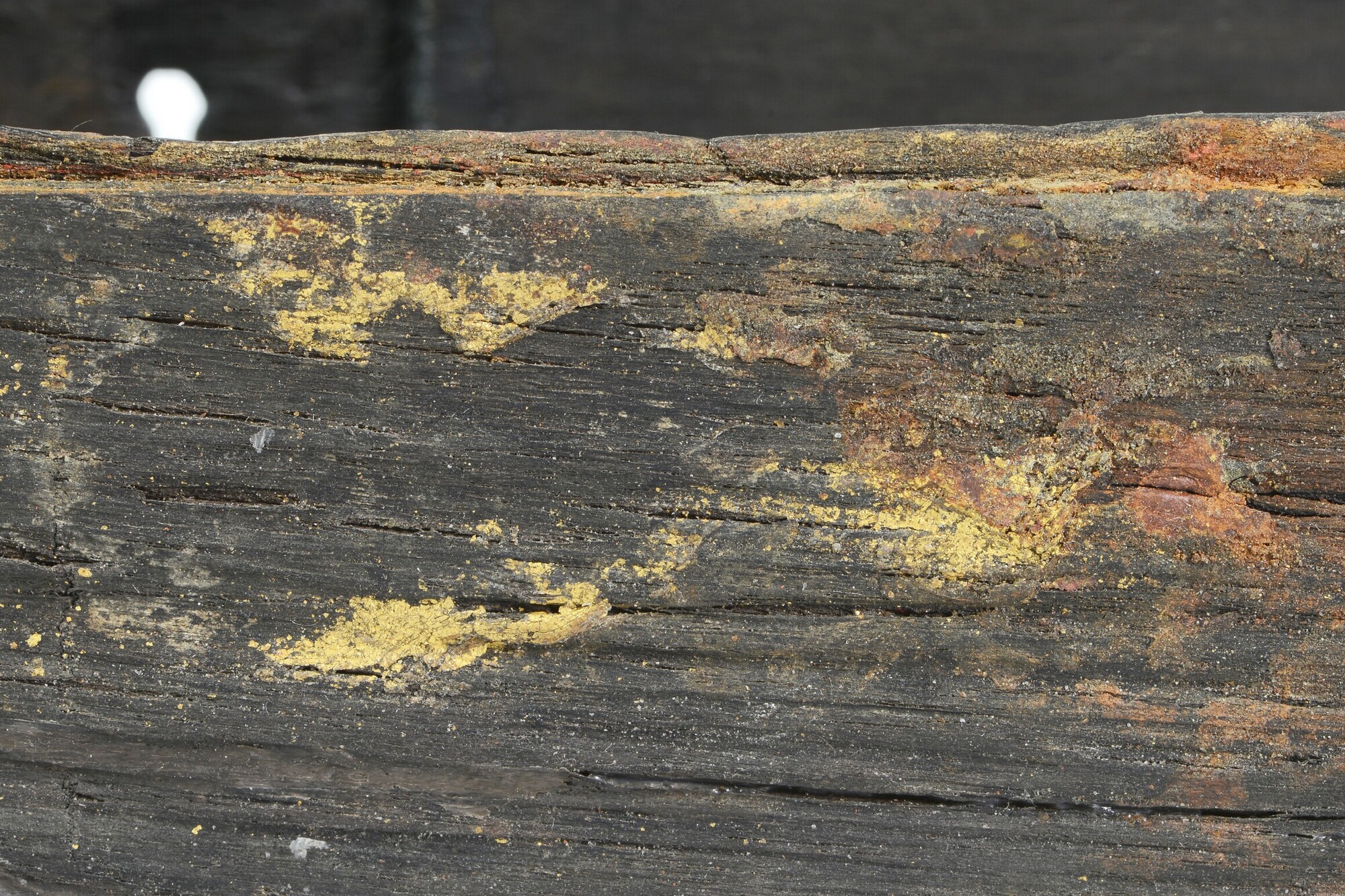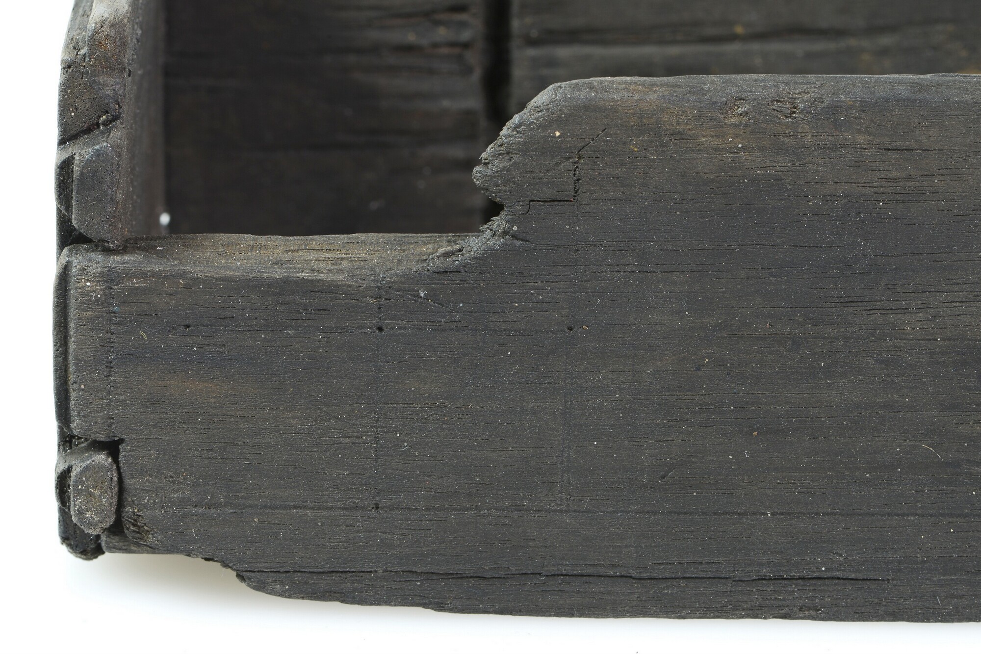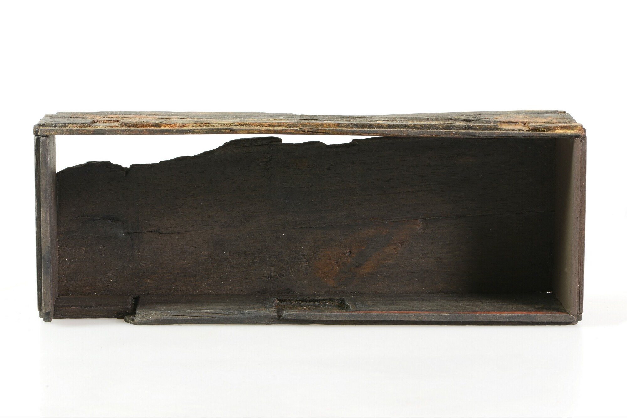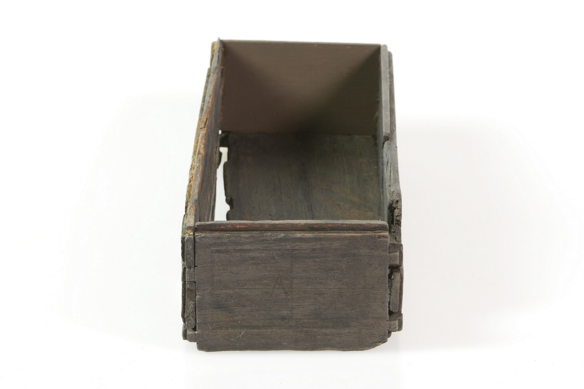 Kist; schrijfdoos?; sleutelgat aan de voorkant; versiering van ingekraste lijnen, waarop oorspronkelijk inlegwerk was bevestigd; resten van goudverf op de achterkant; resten van rode verf langs de bovenrand; twee verdiepingen in de achterkant waarin ijzeren scharnieren hebben gezeten; verticale groef aan de binnenkant voor een inzetplankje; de rechter zijkant is aangevuld; fragment met zilvercorrosie van ...
