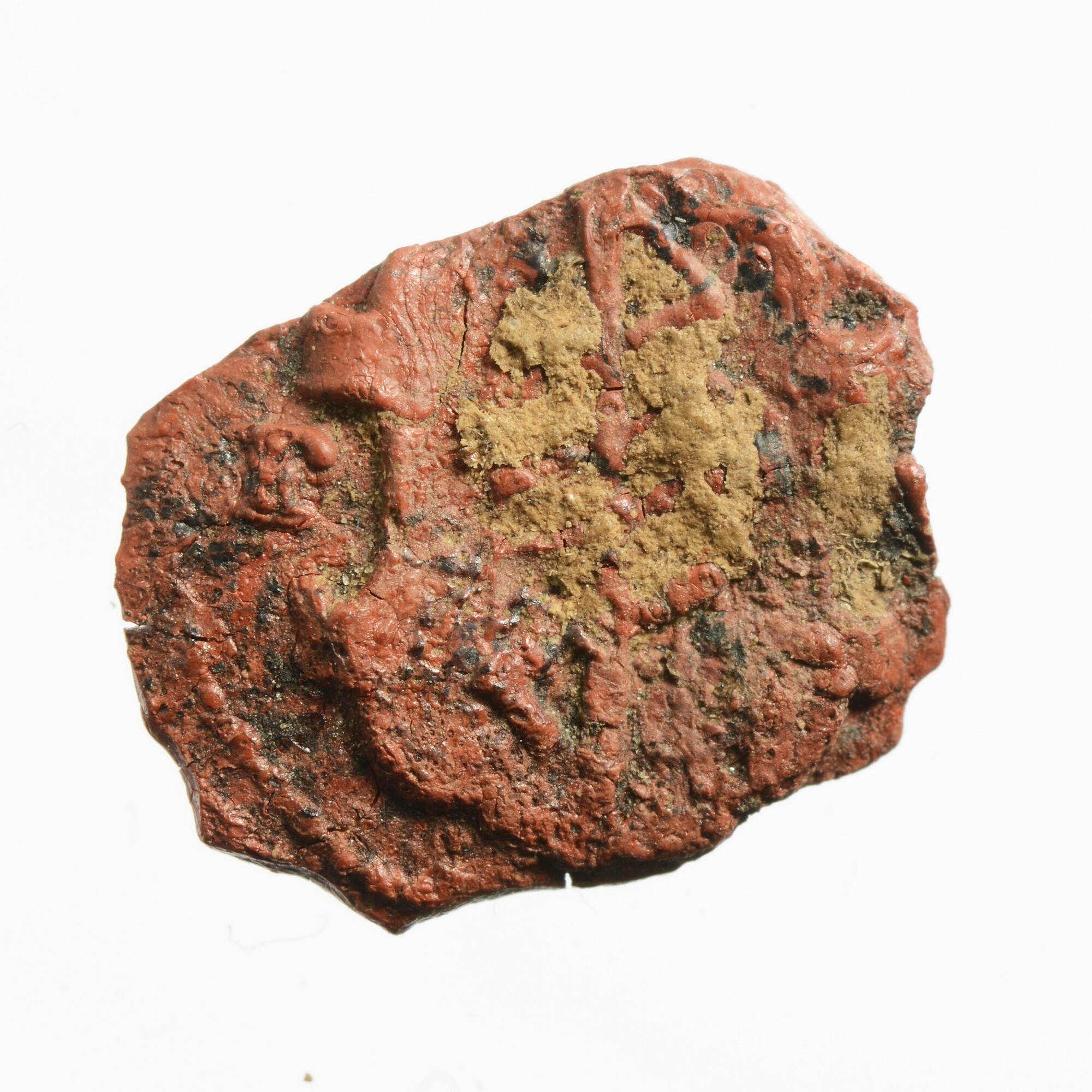 Lakzegel; fragment; wapenschild met huismerk; aan weerszijde initialen P en V, het geheel binnen een parelrand