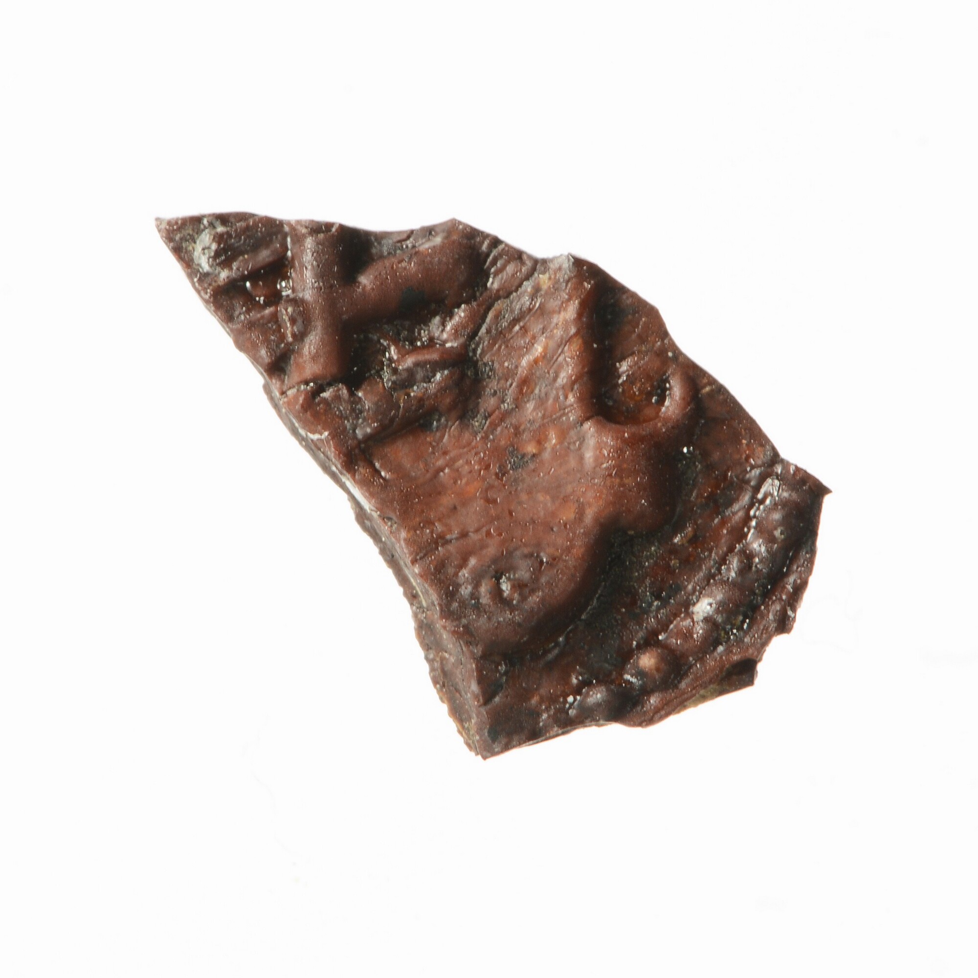 Lakzegel; fragment; wapenschild met huismerk; aan weerszijde initialen P en V, het geheel binnen een parelrand