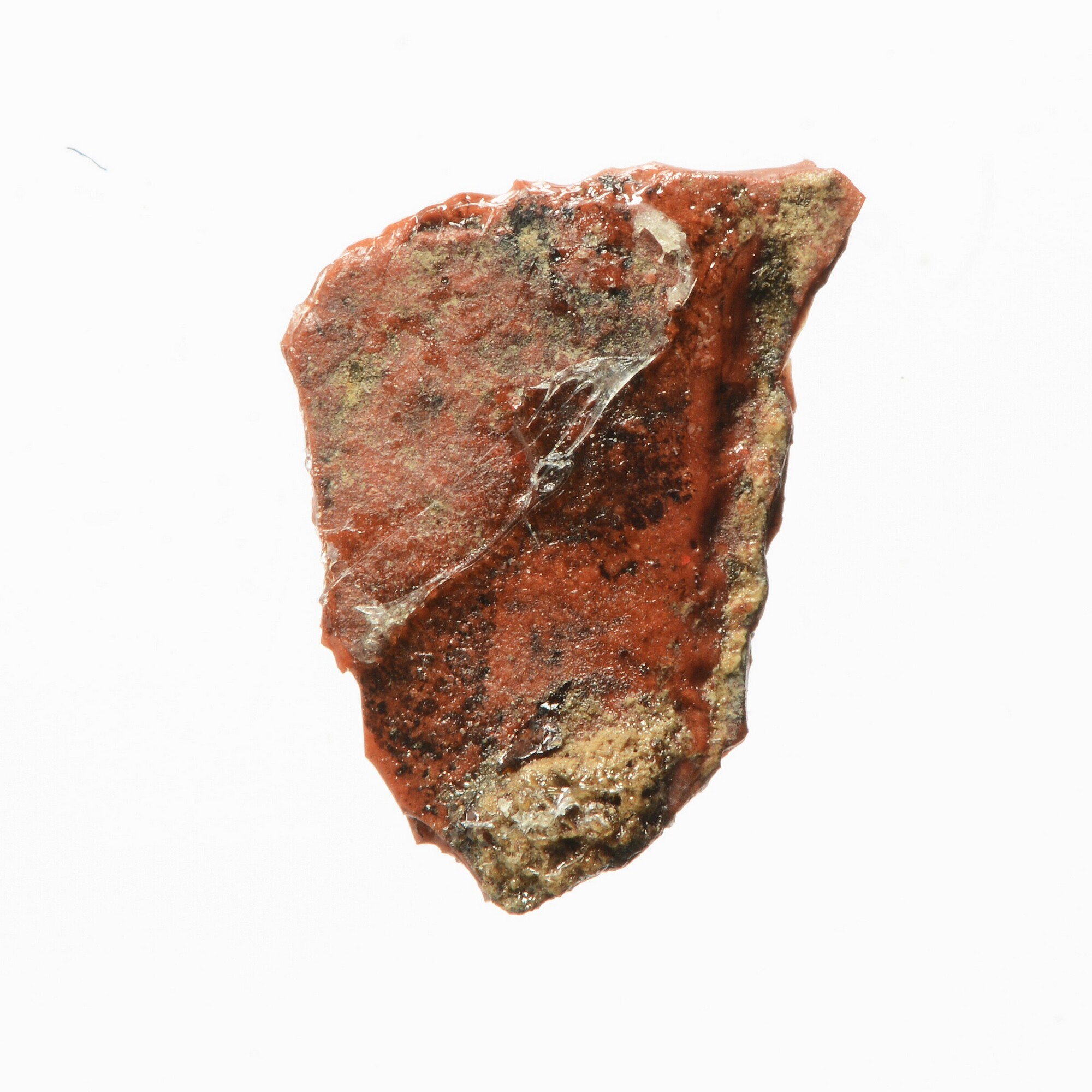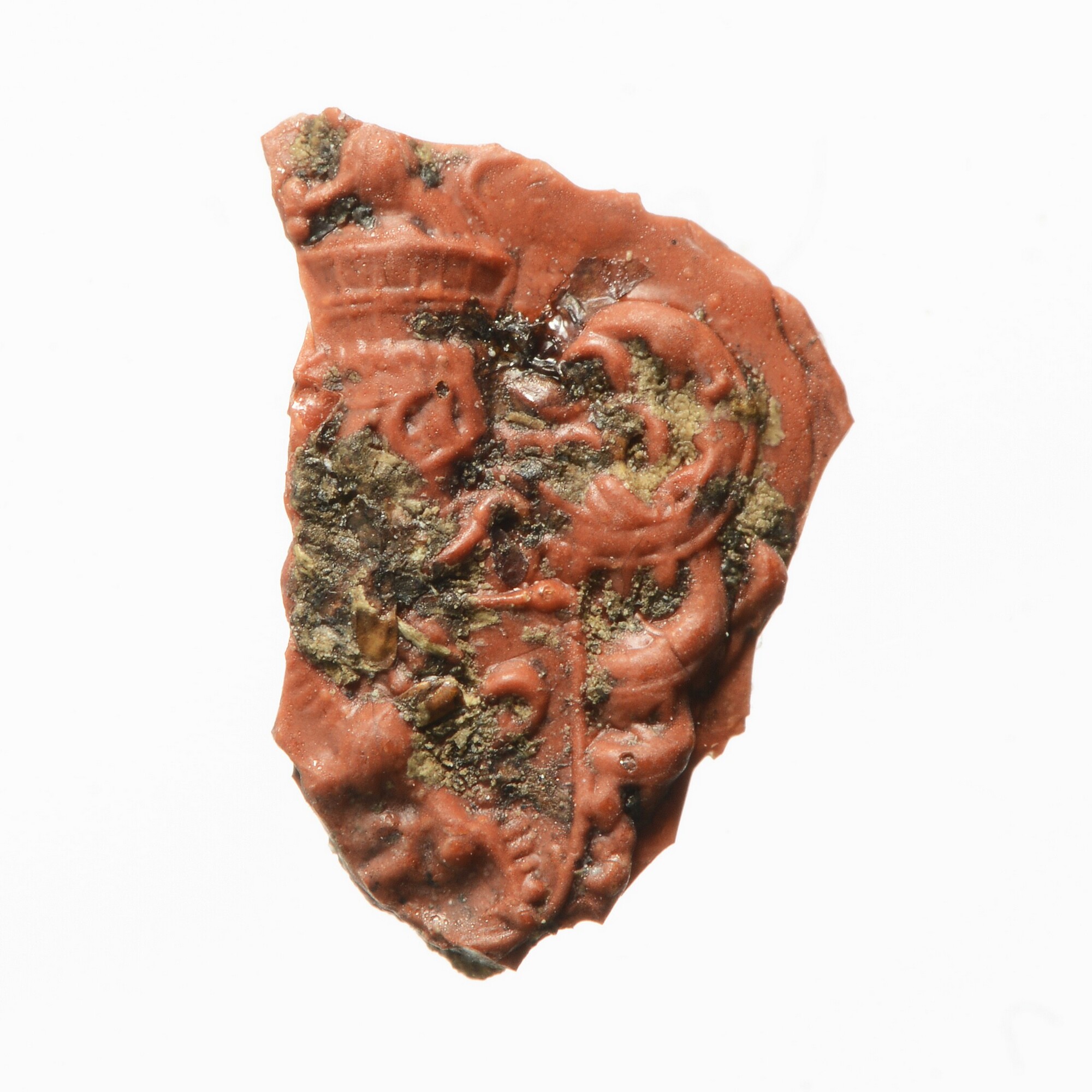 Lakzegel; fragment; wapenschild met klimmende leeuw, erboven een helm met krullen, op de helm een leeuw als helmteken