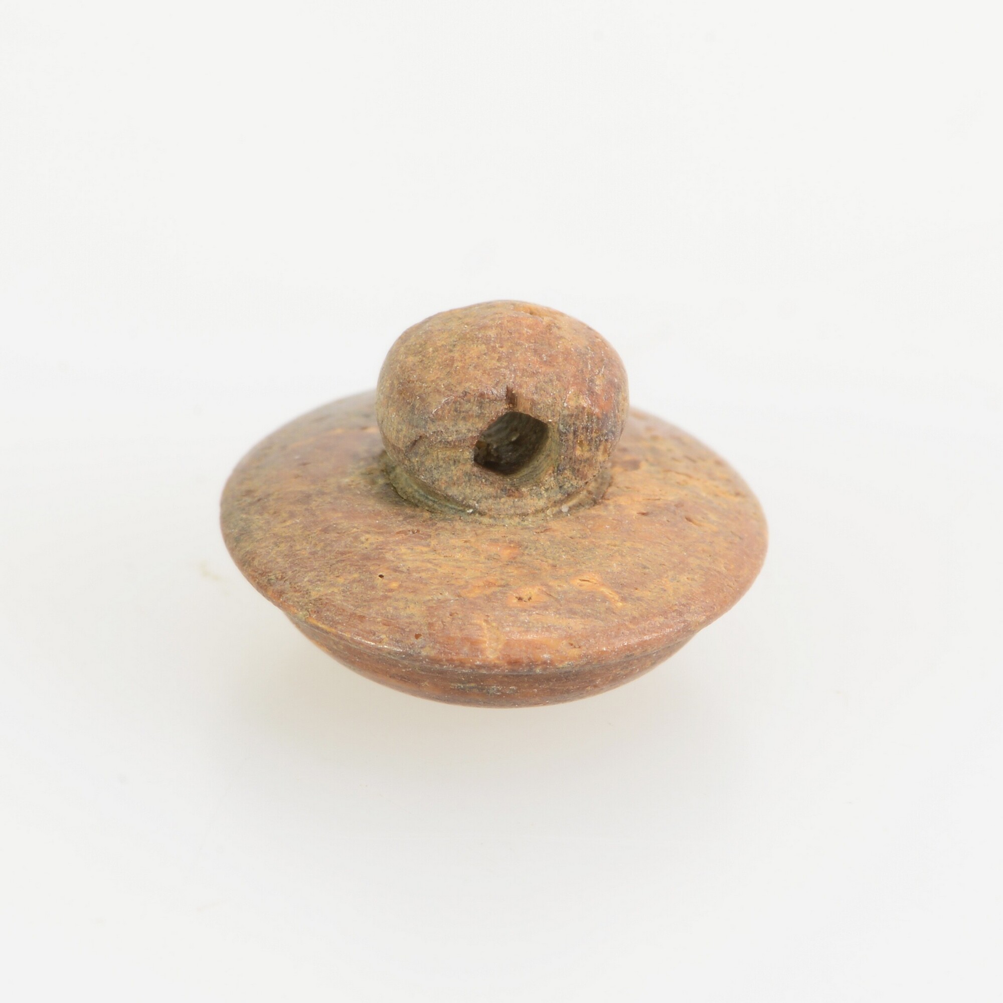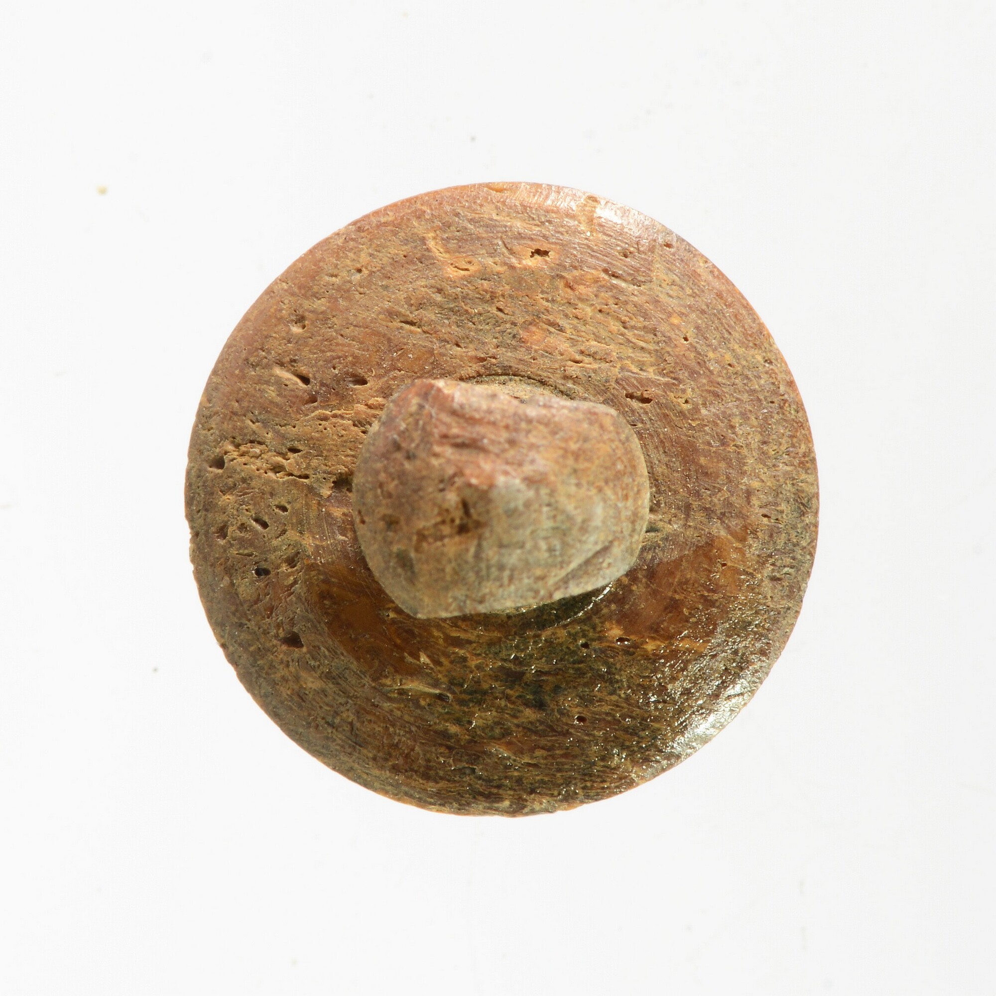 Knoop; dierlijk bot; rond, gebolde voorzijde met iets uitstekende rand, achterzijde met opstaand oog