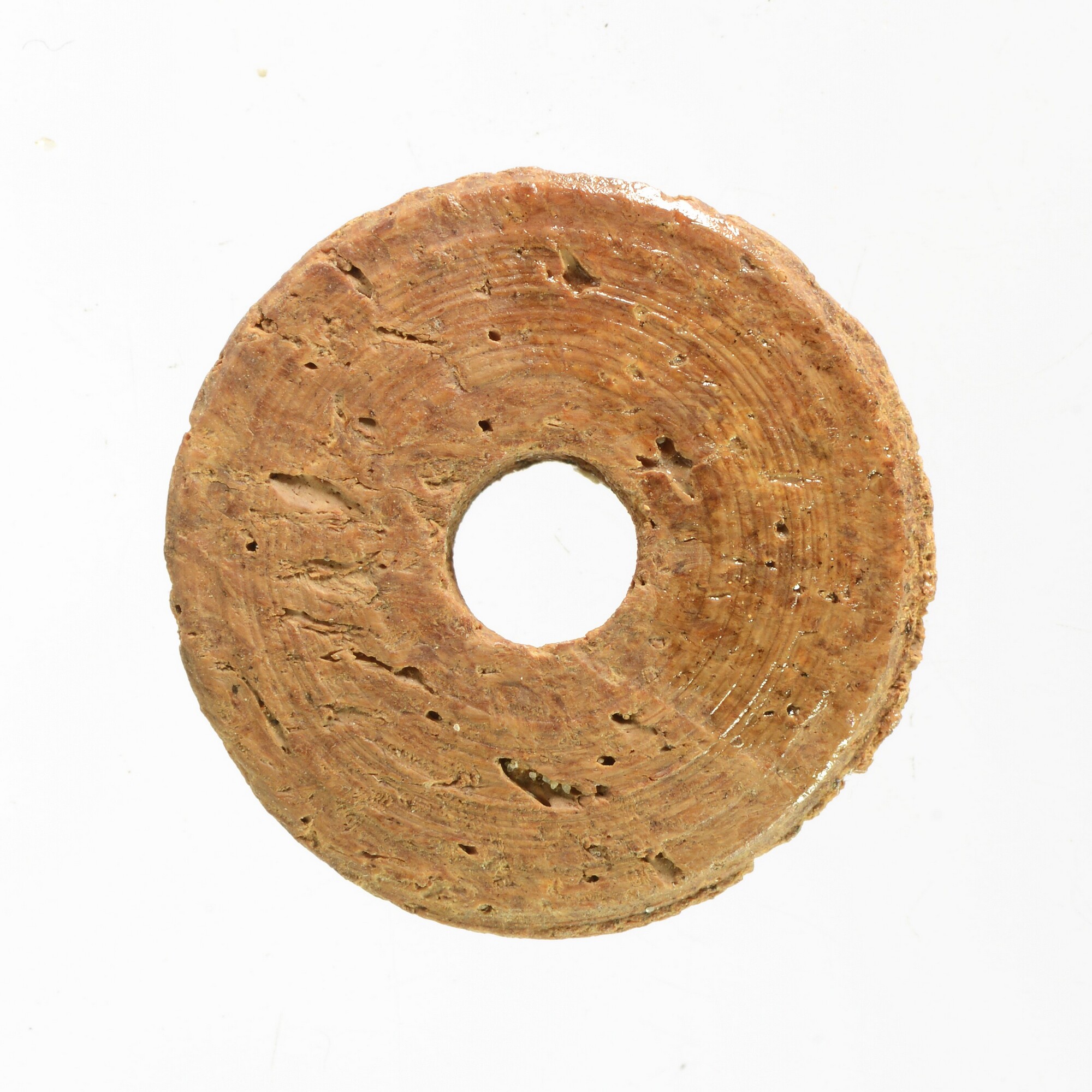 Knoop; dierlijk bot; rond, vrijwel plat schijfje met gat in het midden