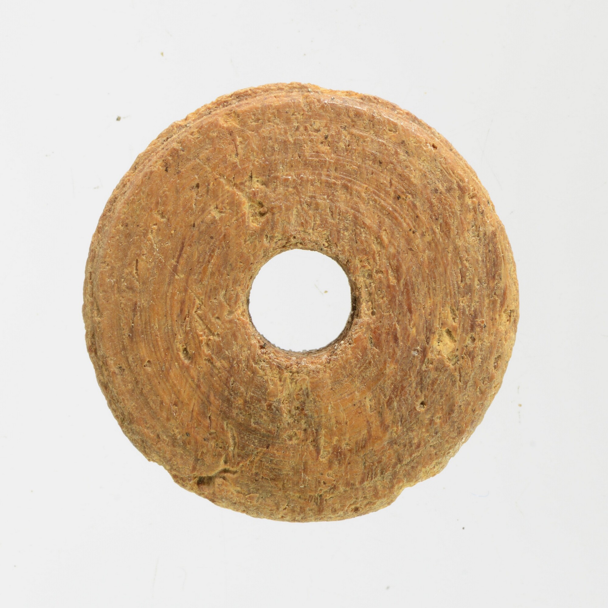 Knoop; dierlijk bot; rond, vrijwel plat schijfje met gat in het midden