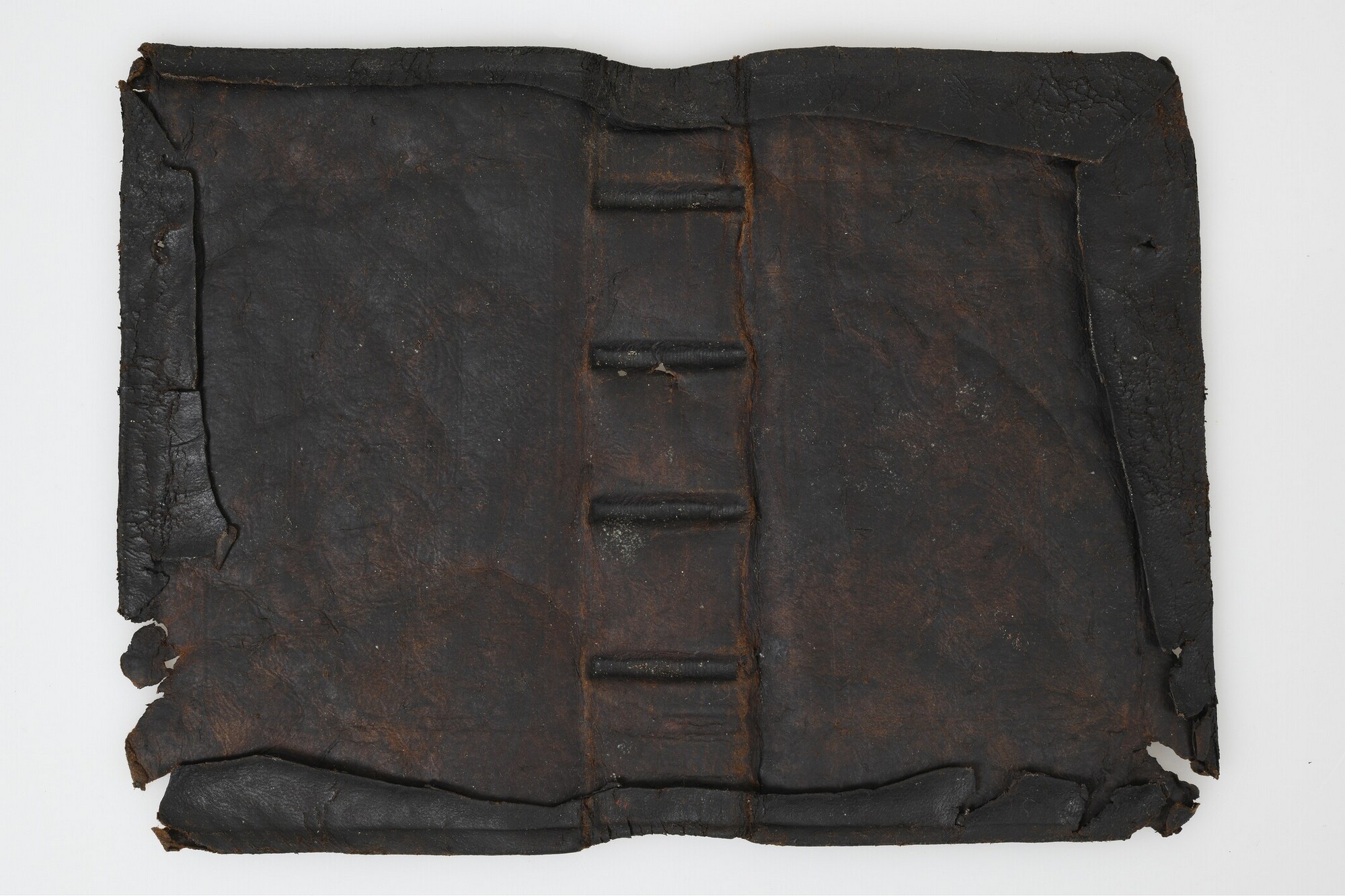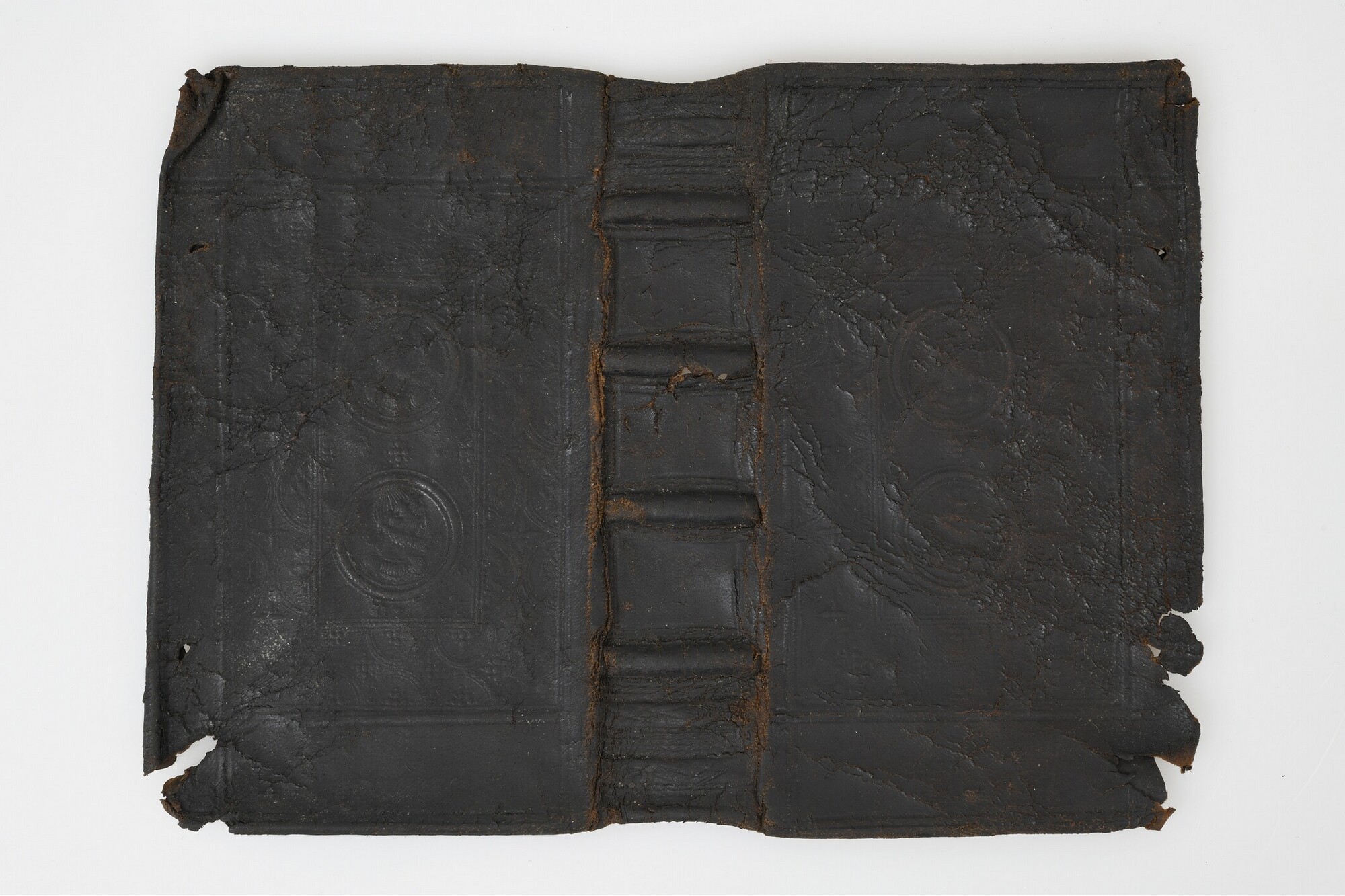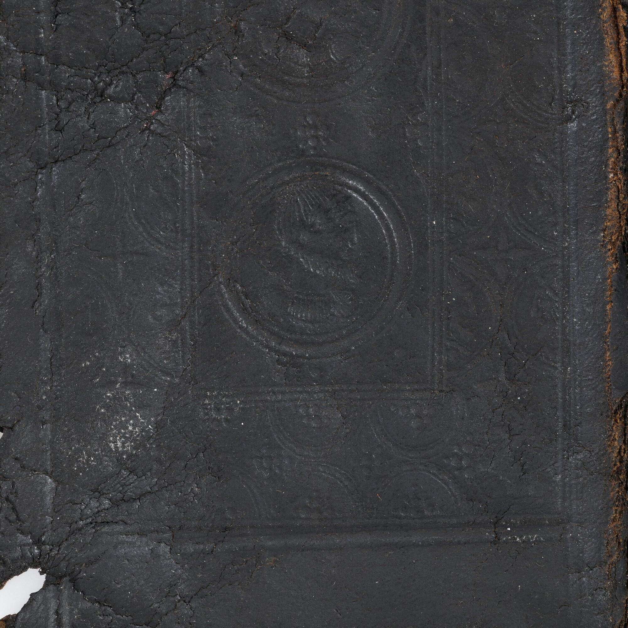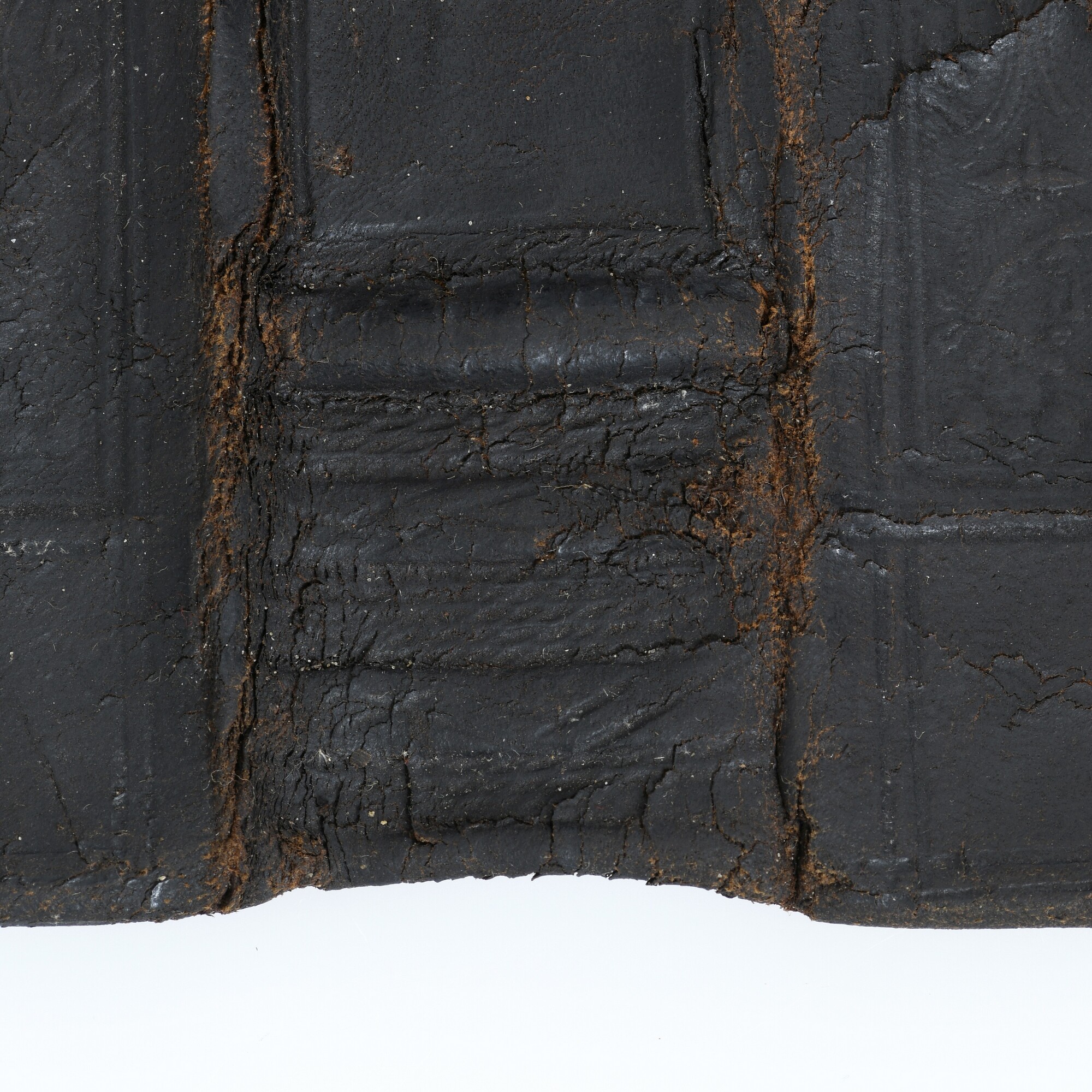 Leren bekleding van een boekband. Deze band heeft op het voorplat van inv.nr. 6241-019 een "spookafdruk" achtergelaten. Ze stonden of lagen ondersteboven t.o.v. elkaar; wel rug bij rug.