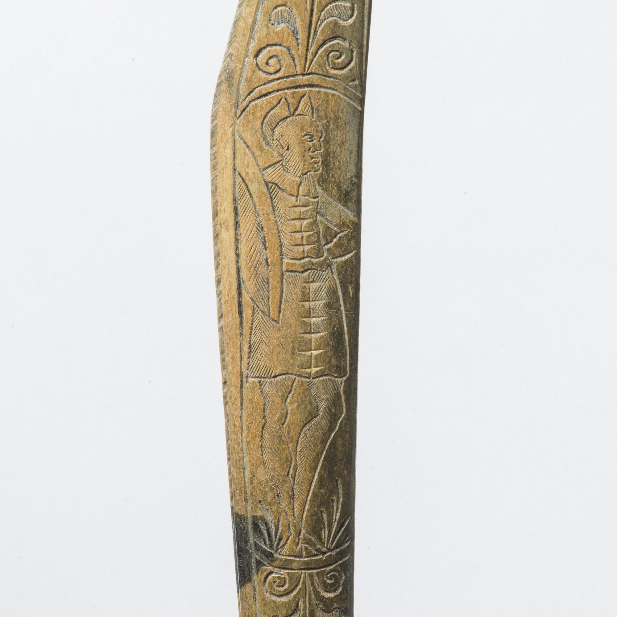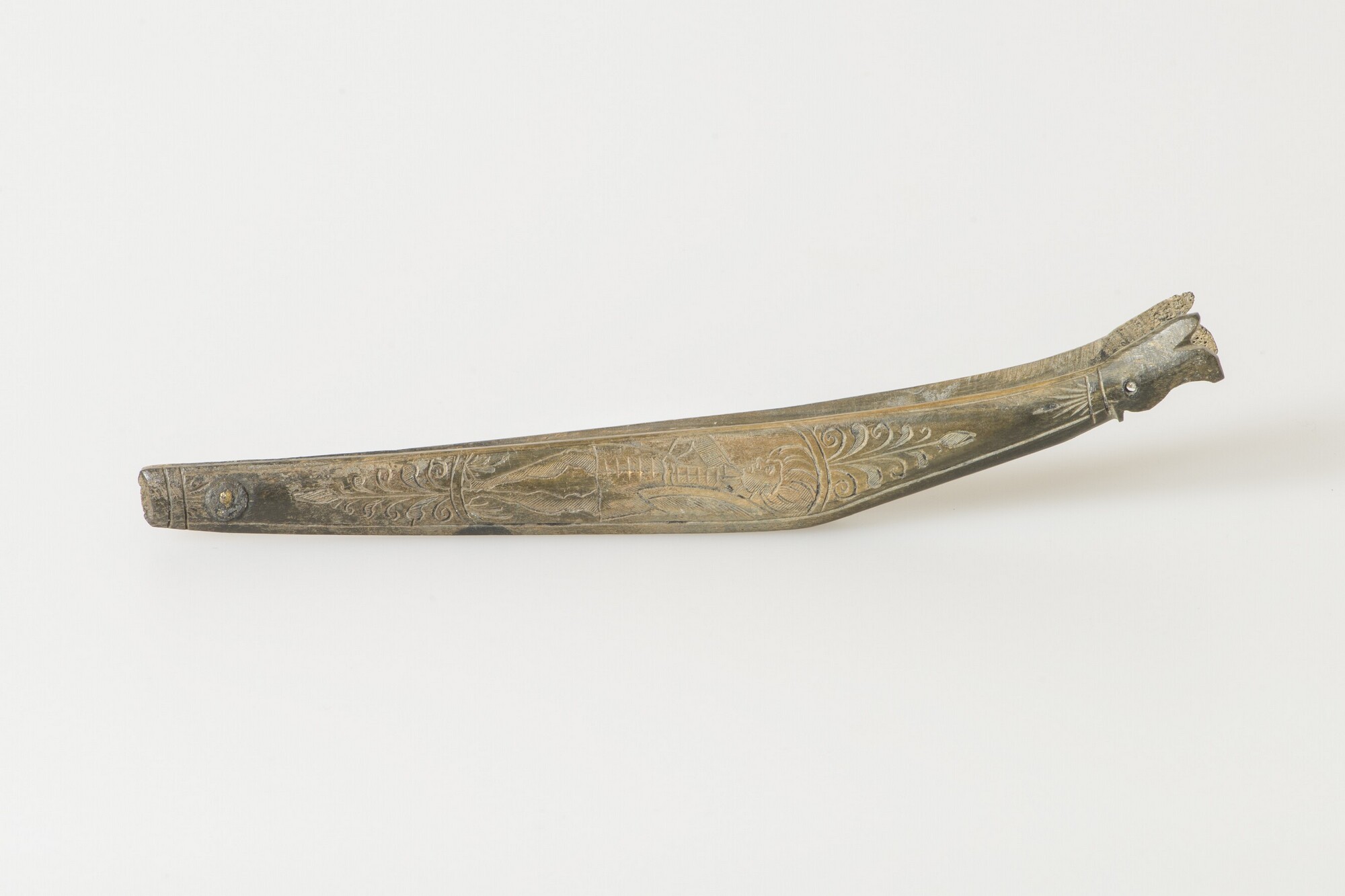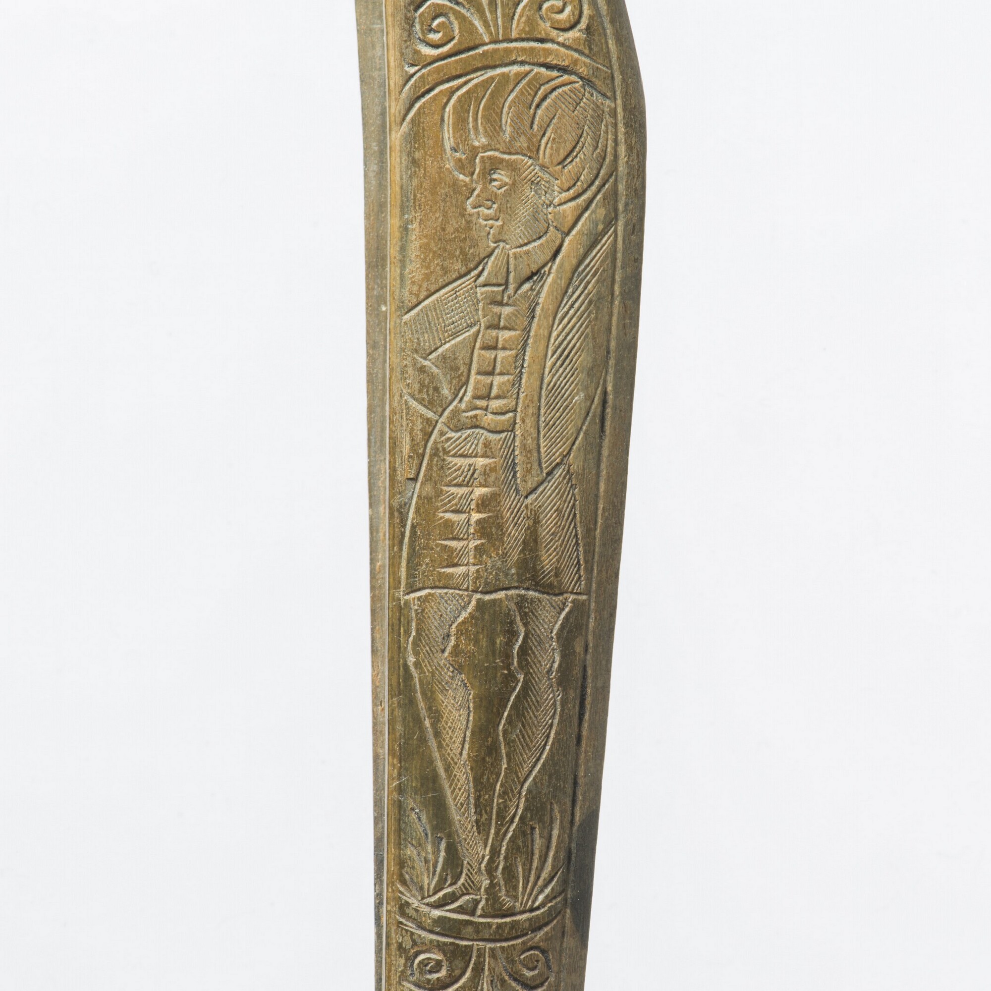 Scheermes; heft; bevestigingsnagel van koperlegering; resten van ijzerroest van het lemmet; gegraveerde versiering: voorzijde man met tulband en schild, keerzijde: man met puntmuts en schild