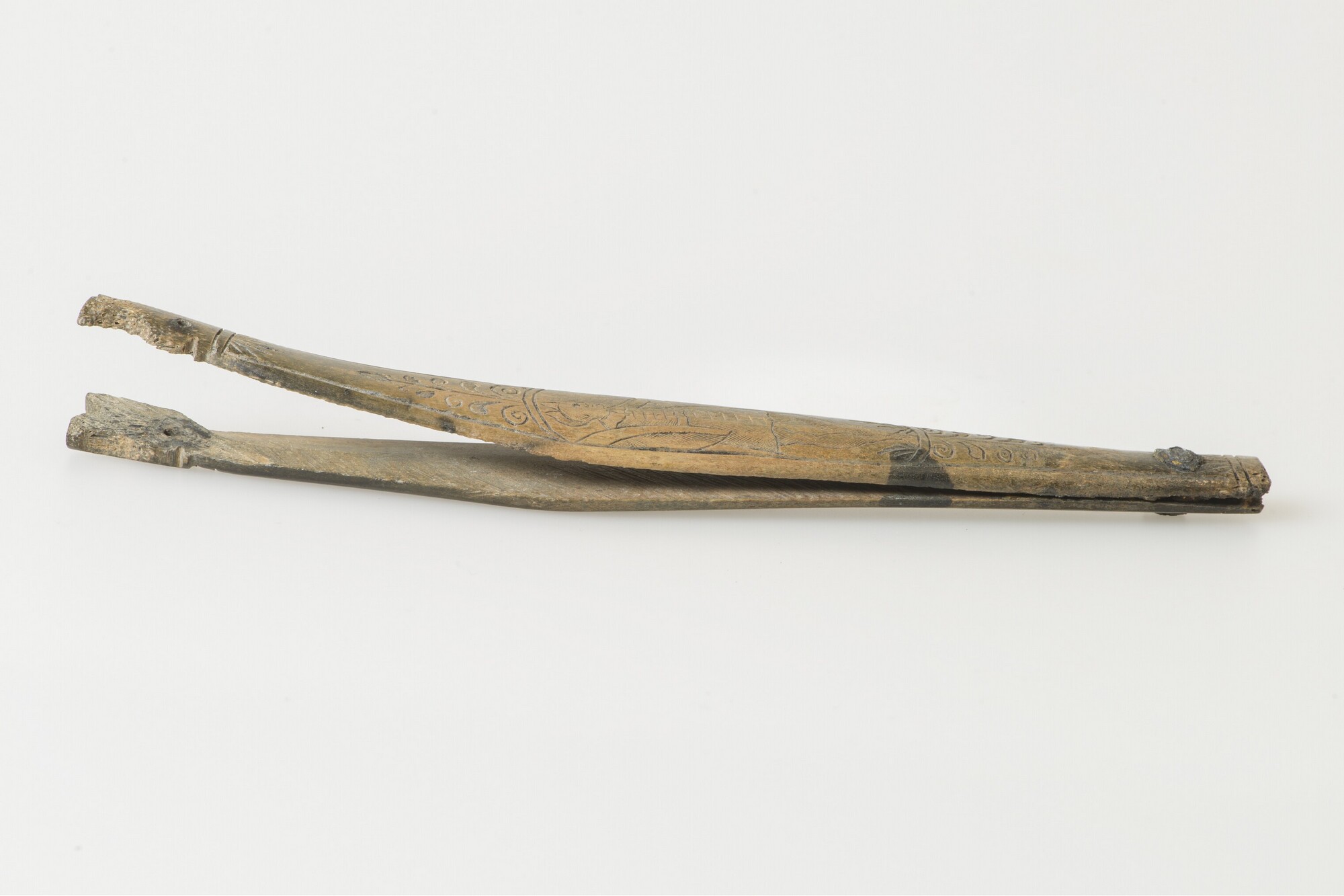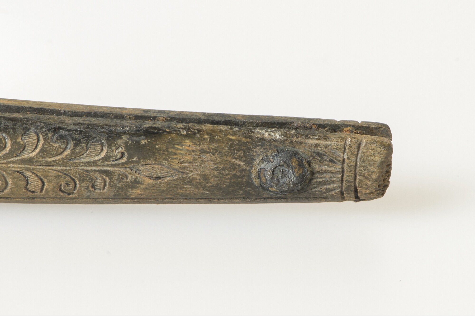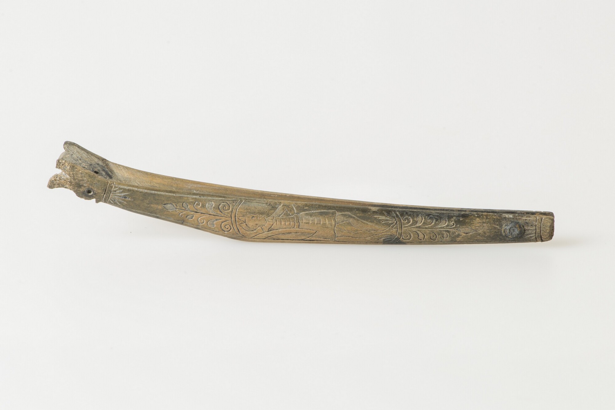 Scheermes; heft; bevestigingsnagel van koperlegering; resten van ijzerroest van het lemmet; gegraveerde versiering: voorzijde man met tulband en schild, keerzijde: man met puntmuts en schild