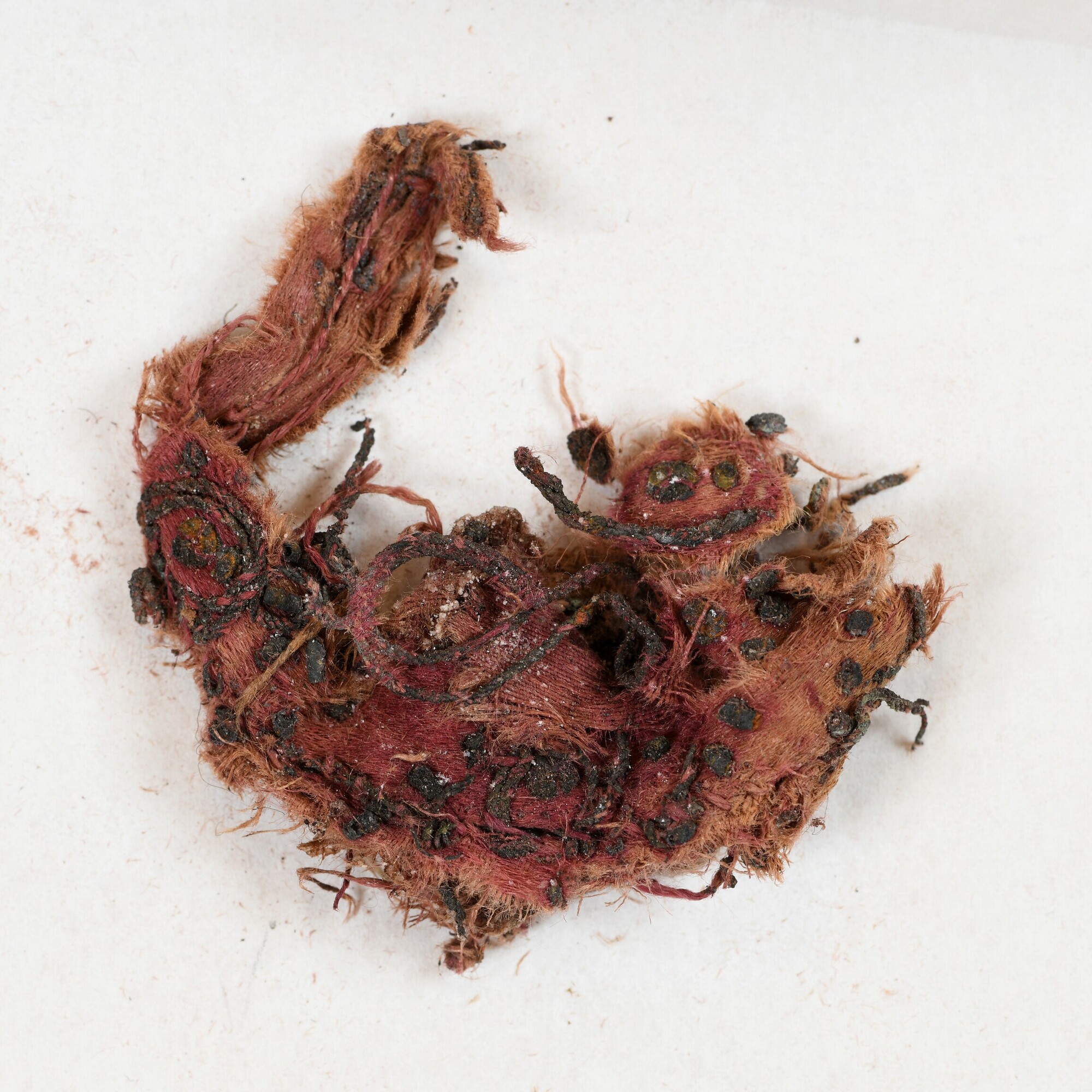 Fragmenten van ooit geweven stof met metaaldraad borduursel; afdruk ervan in kraag 6263-117 en 6333-36