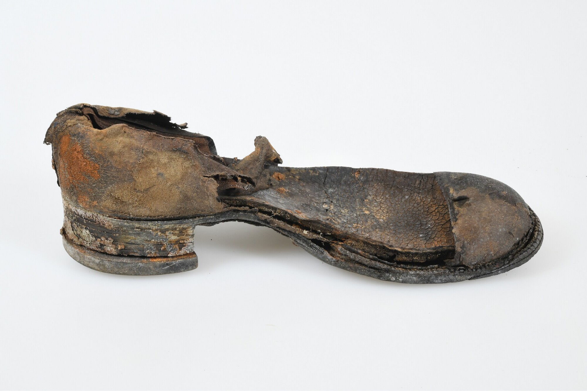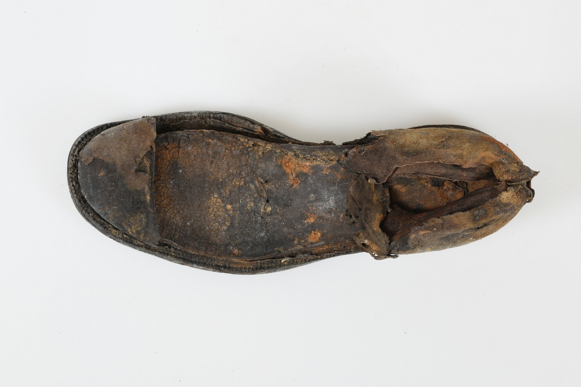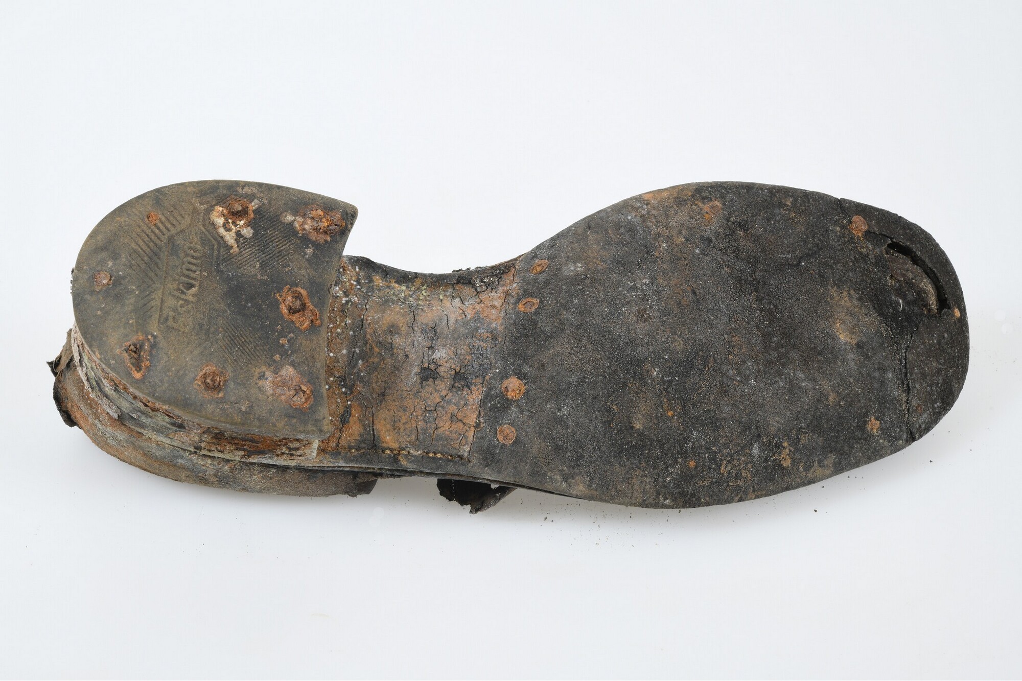 Schoen; links; leren schoen met rubberen zool en ijzeren spijkers; maat 42; merk Eskimo; stempel in de binnenzool: "30 1/2".