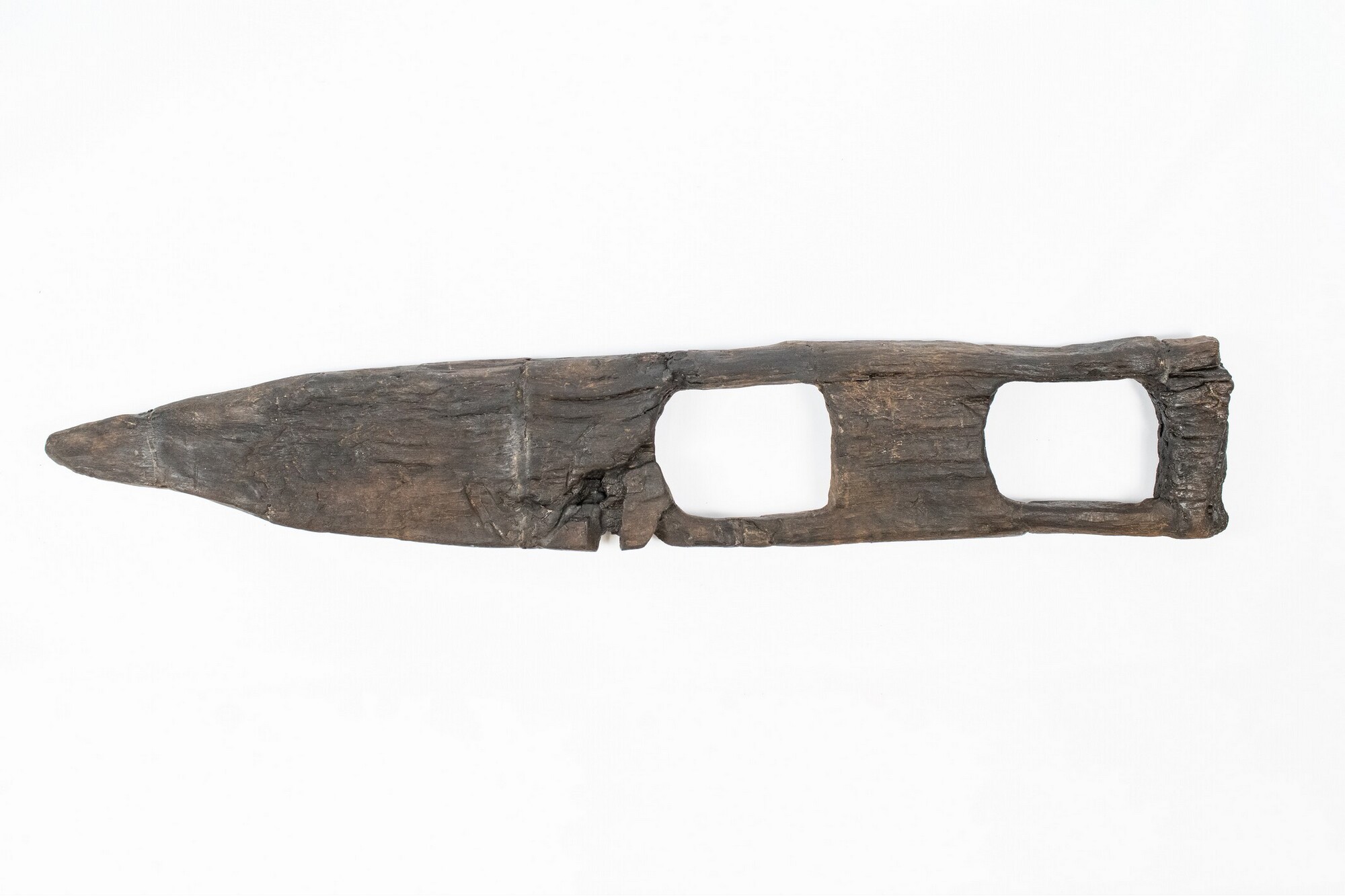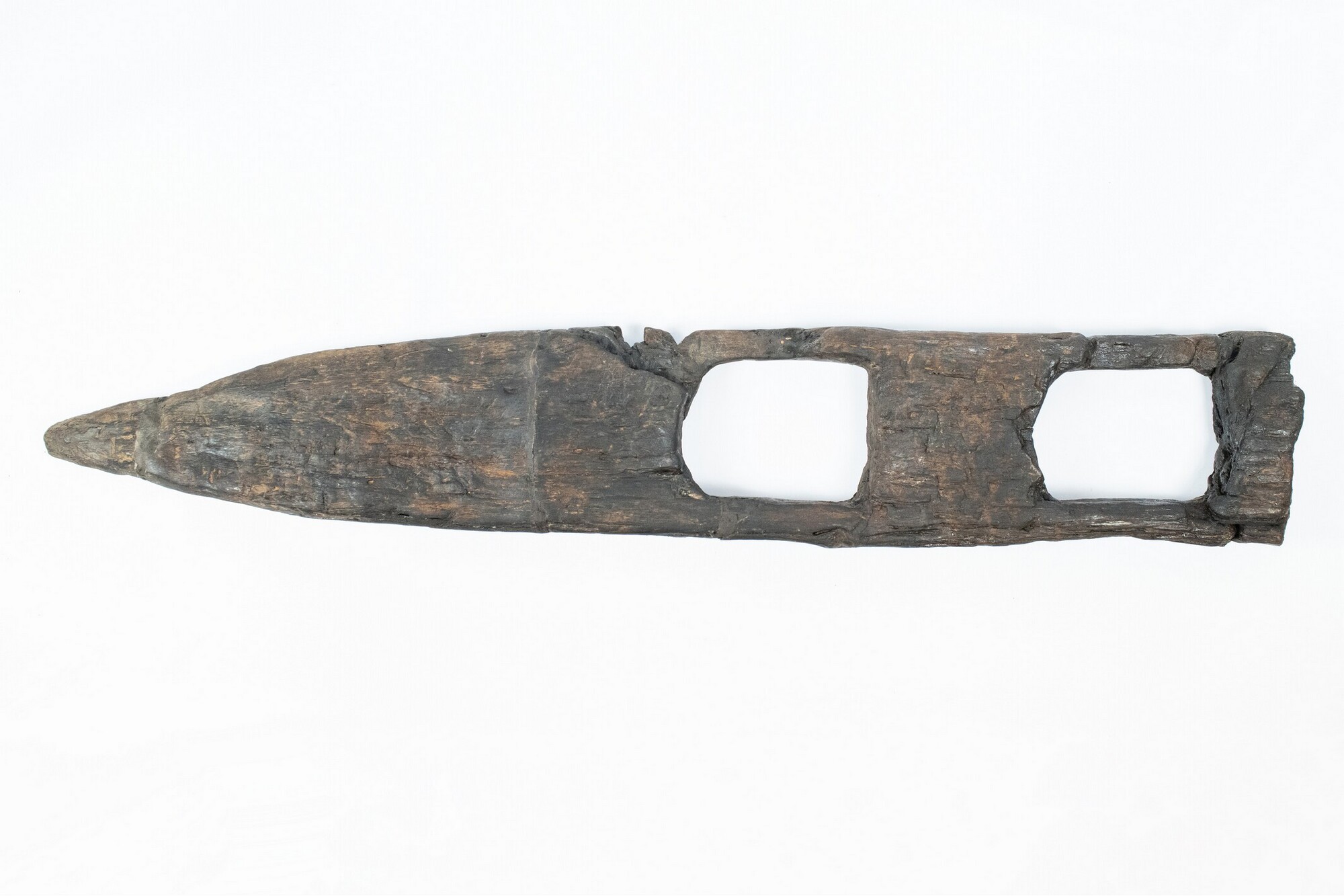 Plankladder; onderkant toegespitst; bovenkant min of meer recht (afgebroken?); twee rechthoekige trapgaten; trapgaten zijn mogelijk versleten door gebruik van de ladder