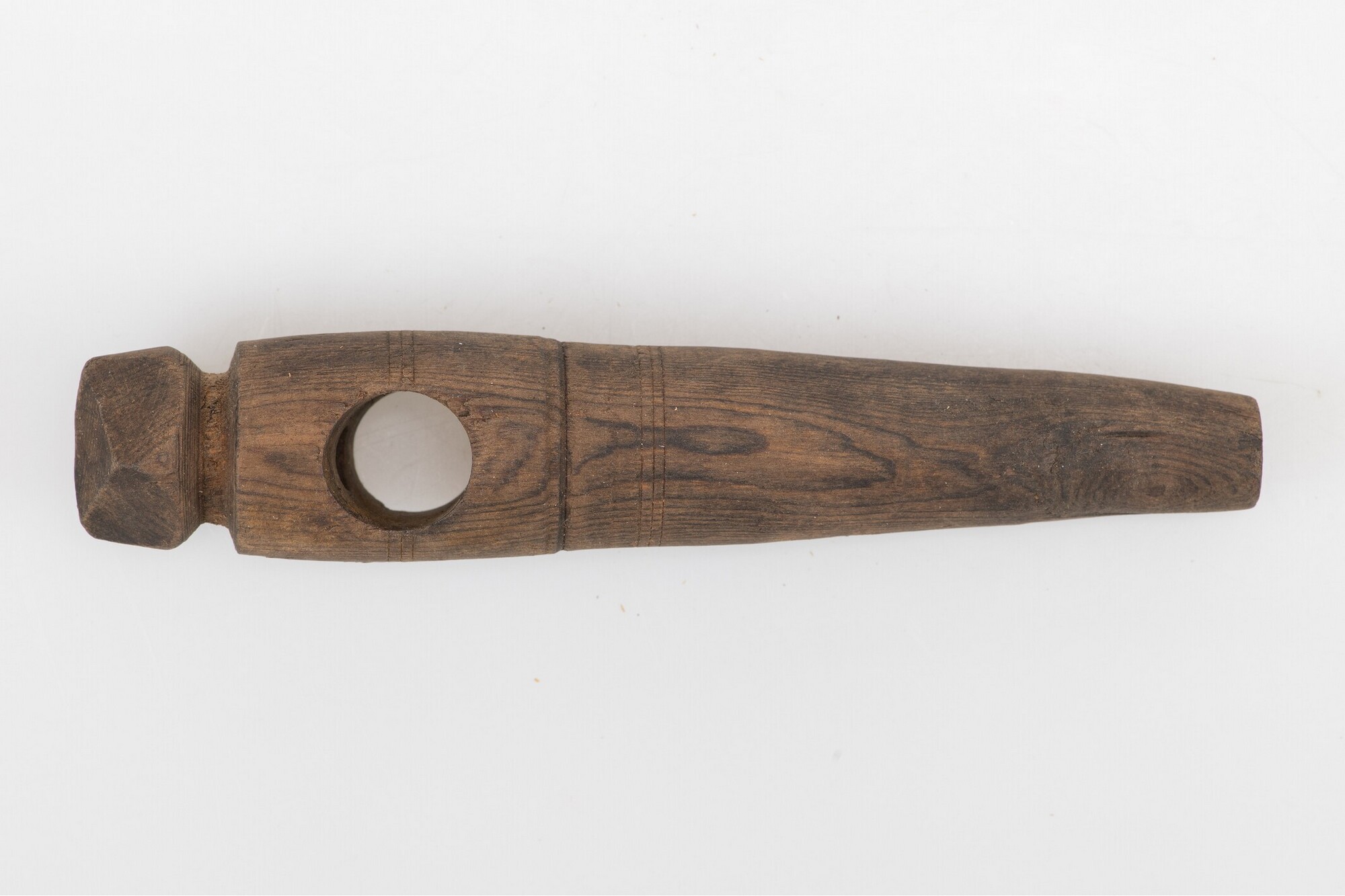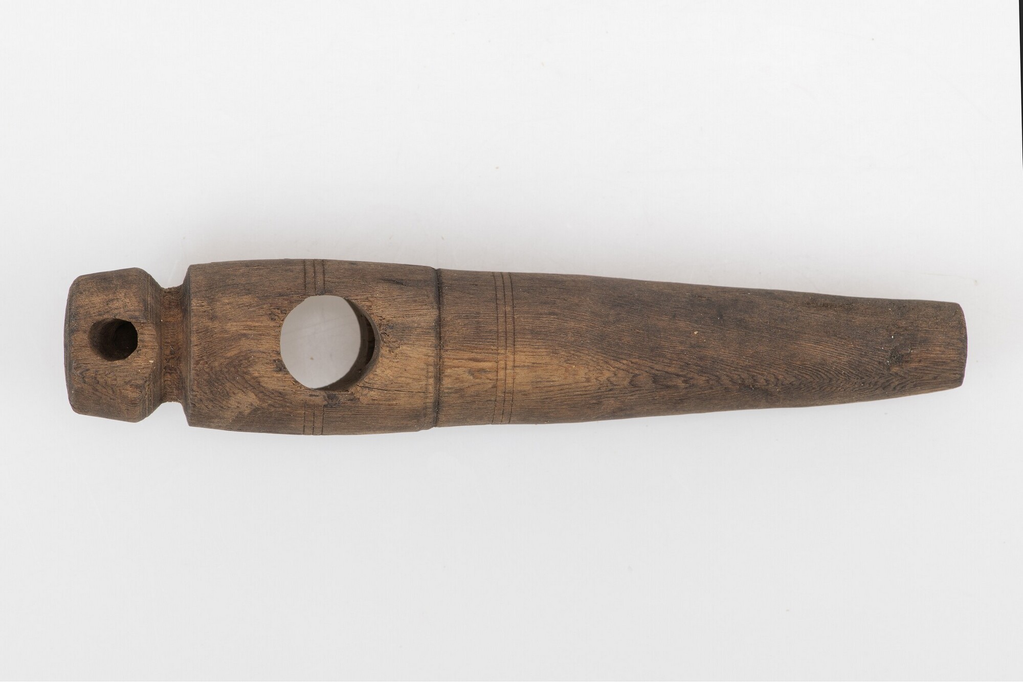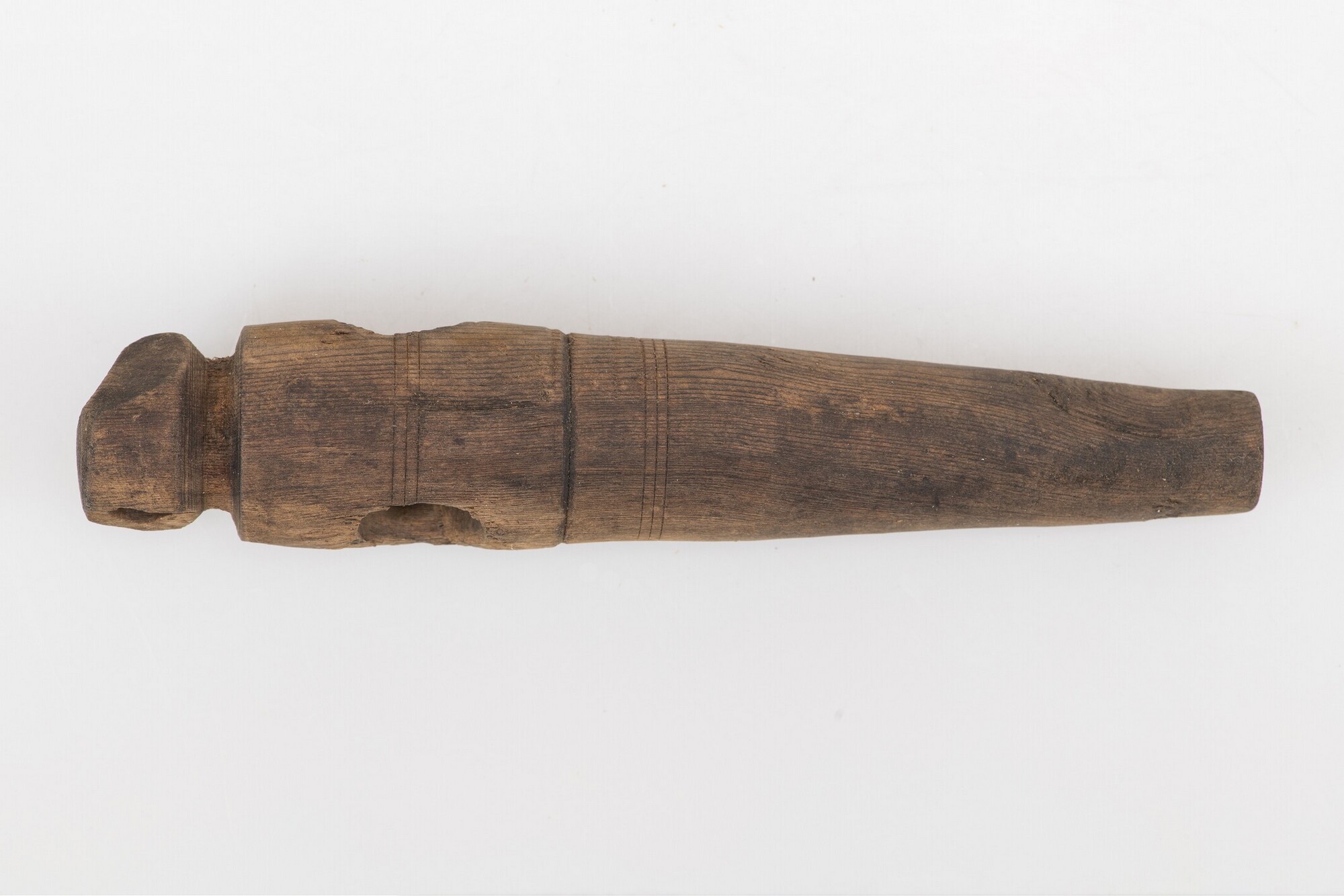Tapkraan; taps toelopende buis waarin de massieve staaf met handgreep past; versierd met tweemaal drie horizontale groeven; inscriptie aan de zijkant: '2 | 3/5'; inhoudsmaat van het vat waar de kraan in zat?