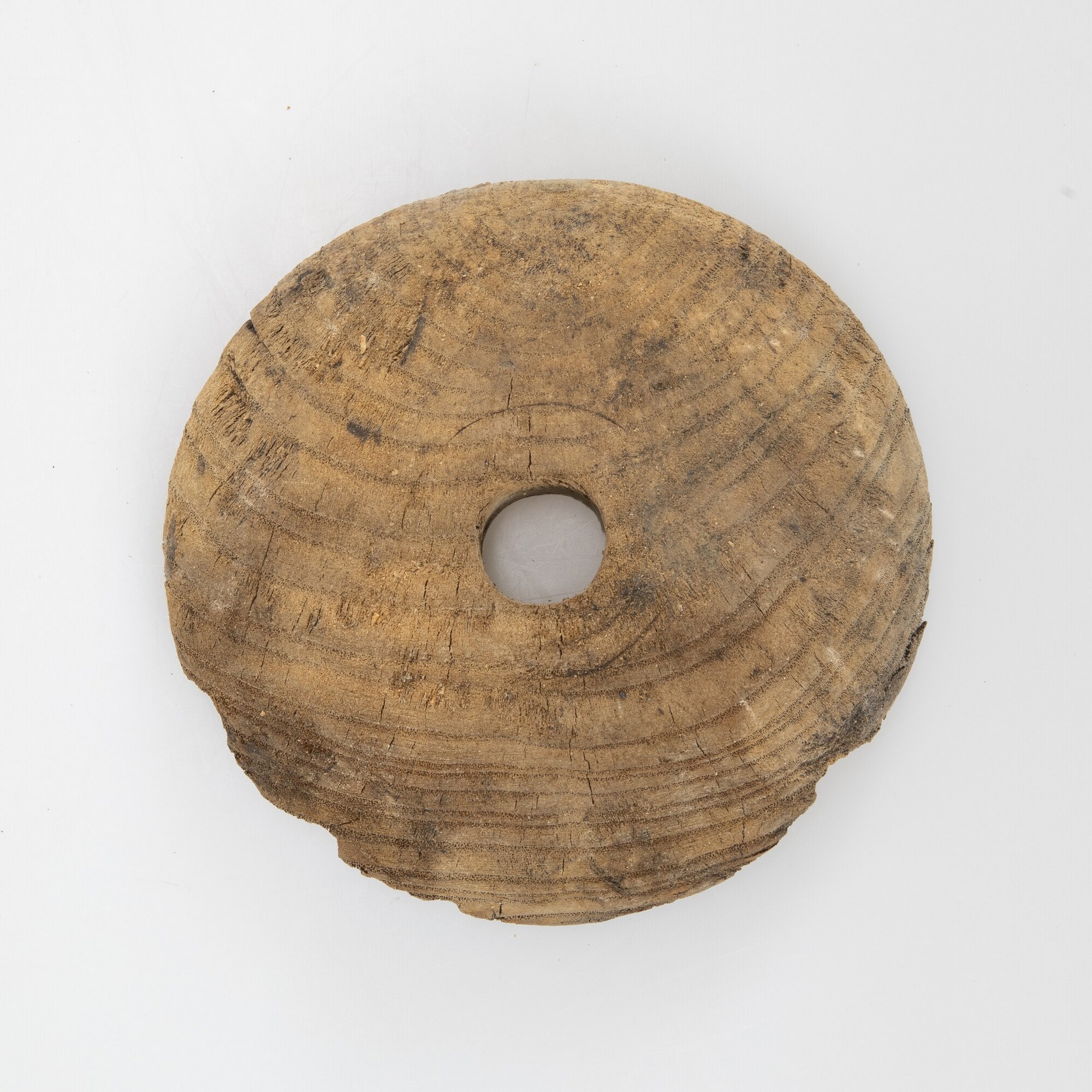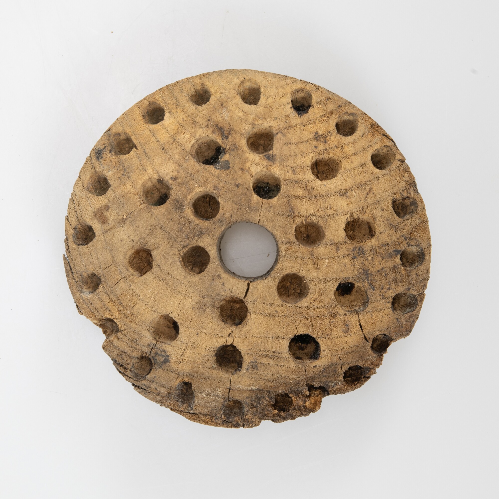 Borstel (onderdeel); ronde kop van een handborstel; borstelharen en steel ontbreken; resten teer in diverse gaten