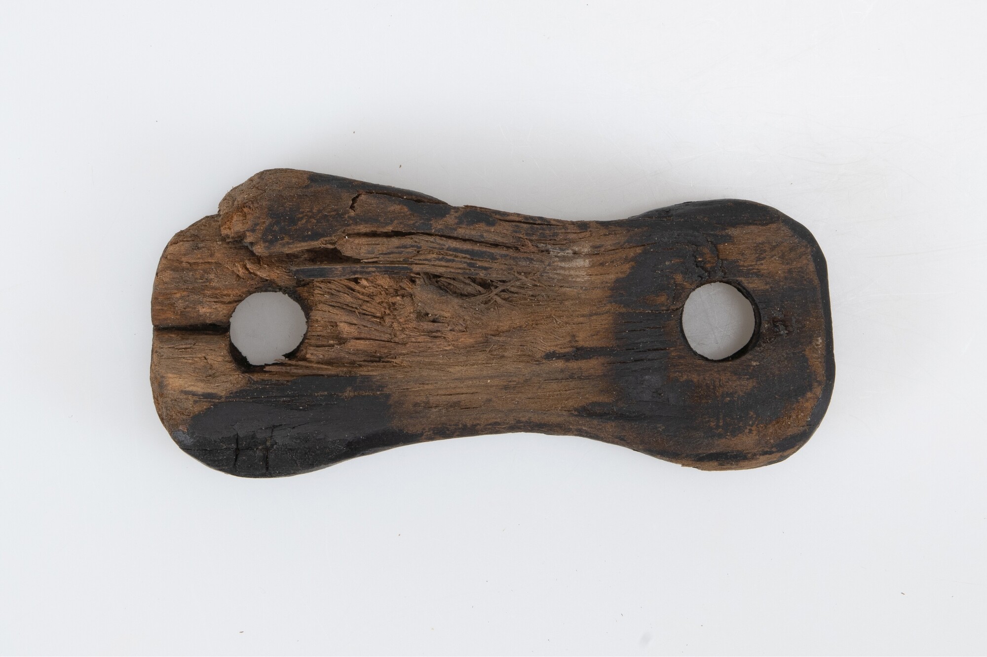 Scheepstuigage; vermoedelijk een touwgeleider; twee ronde gaten aan weerszijden