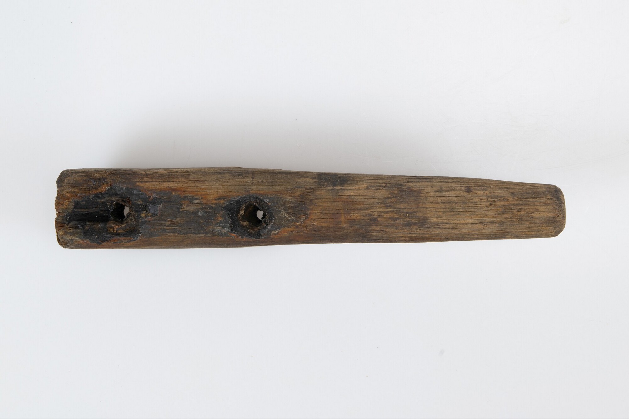 Klamp / kikker; twee gaten waarin smeedijzeren spijkers hebben gezeten