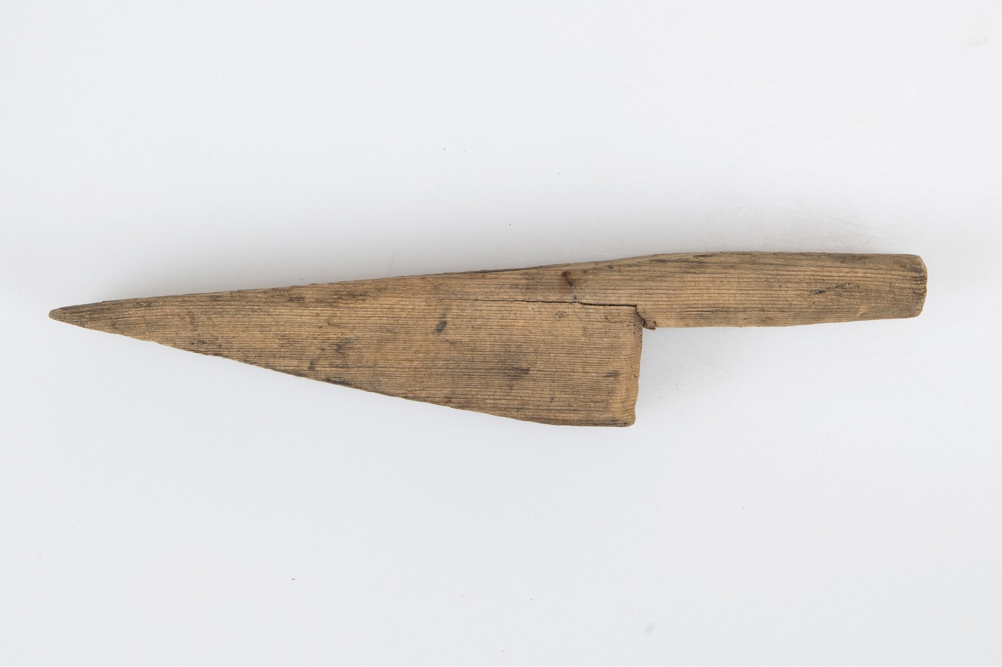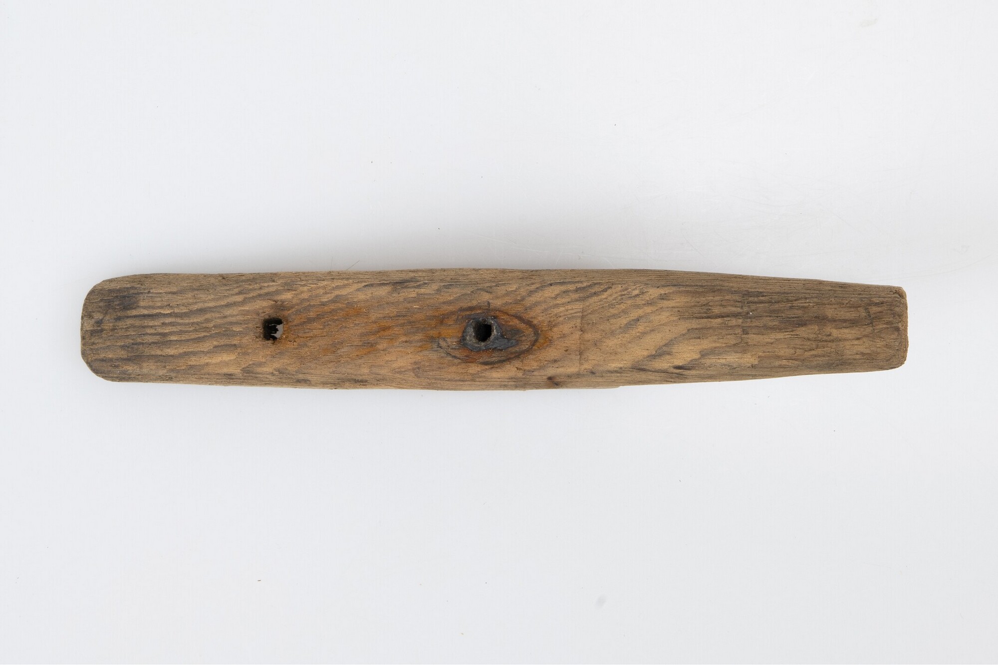 Klamp / kikker; twee gaten waarin smeedijzeren spijkers hebben gezeten; X gekerfd in onderzijde uitstekende deel
