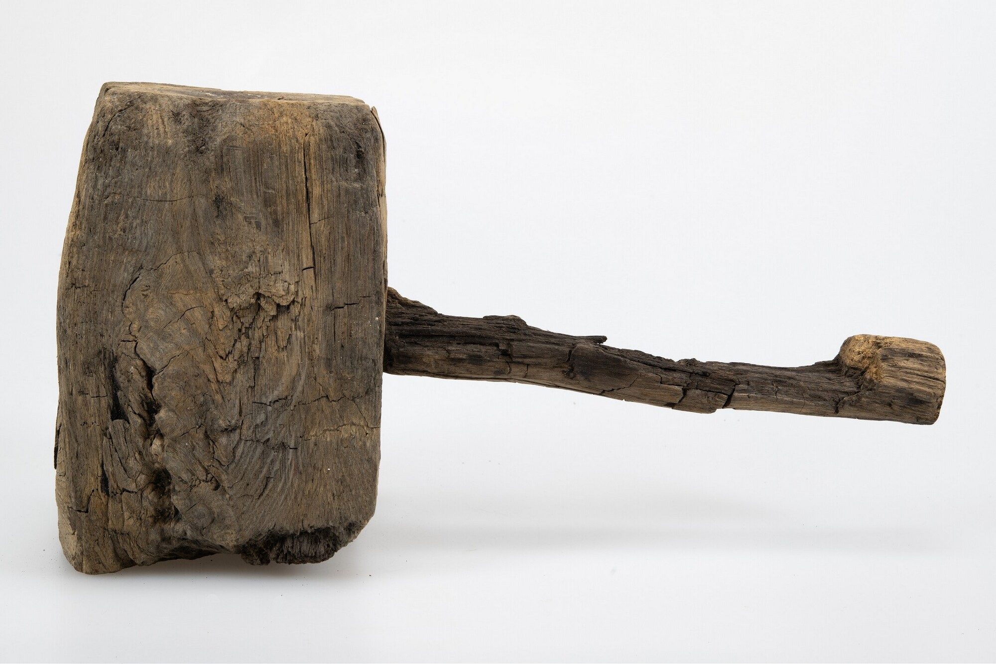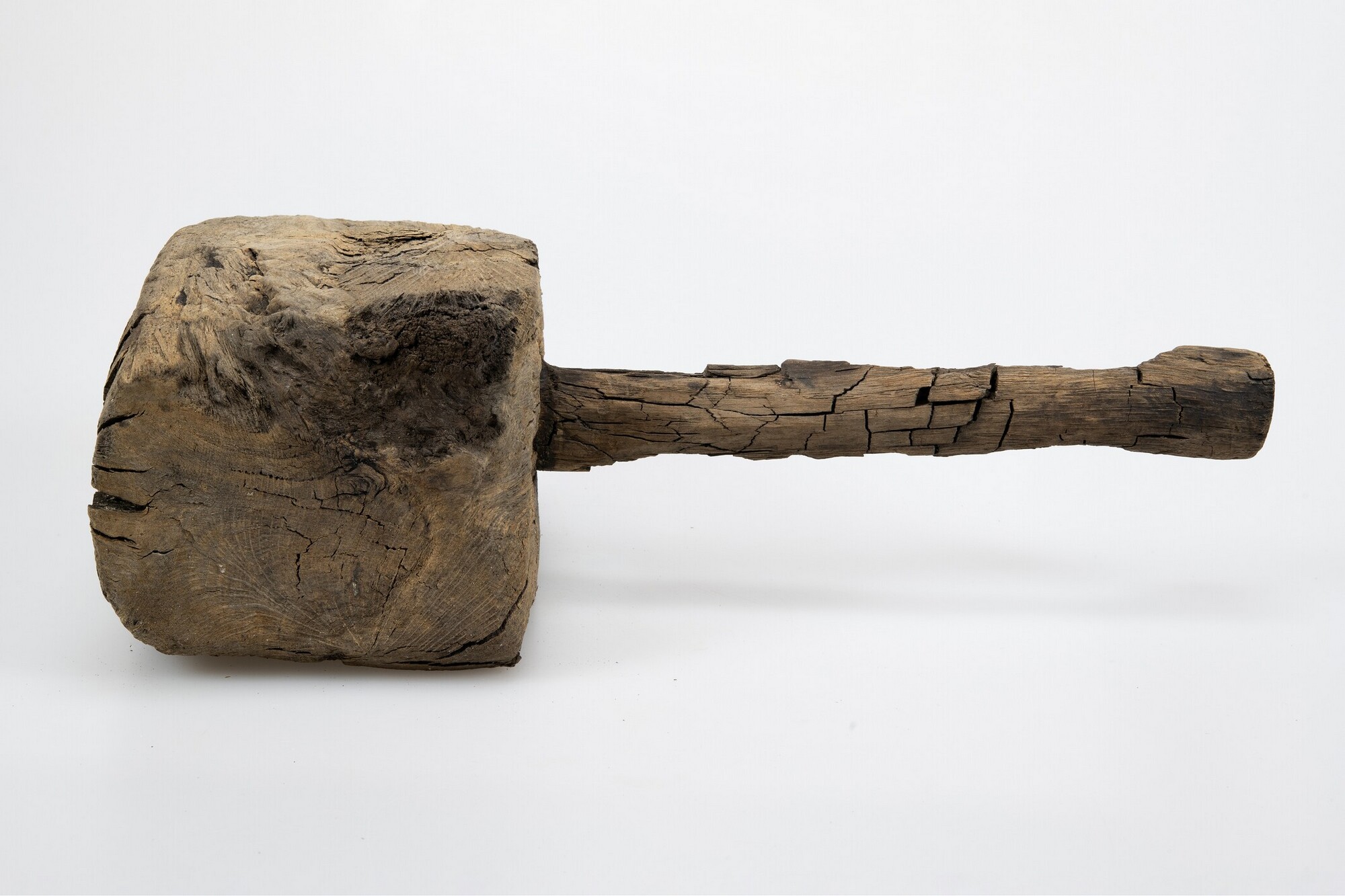 Hamer; ronde steel en rechthoekige kop met afgeschuinde hoeken; vermoedelijk een kuipershamer