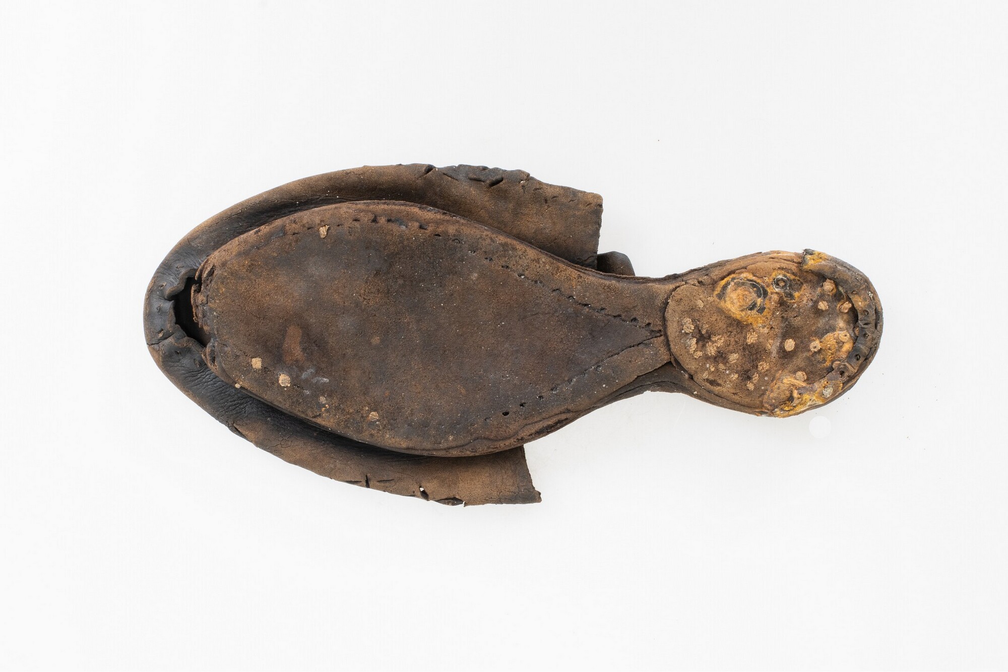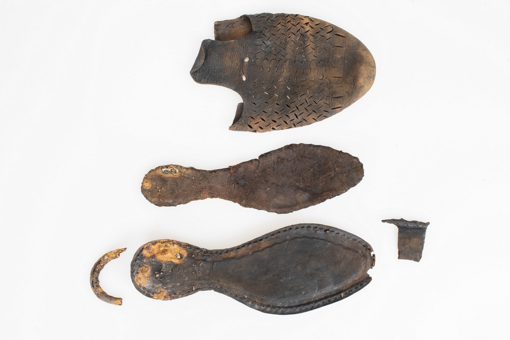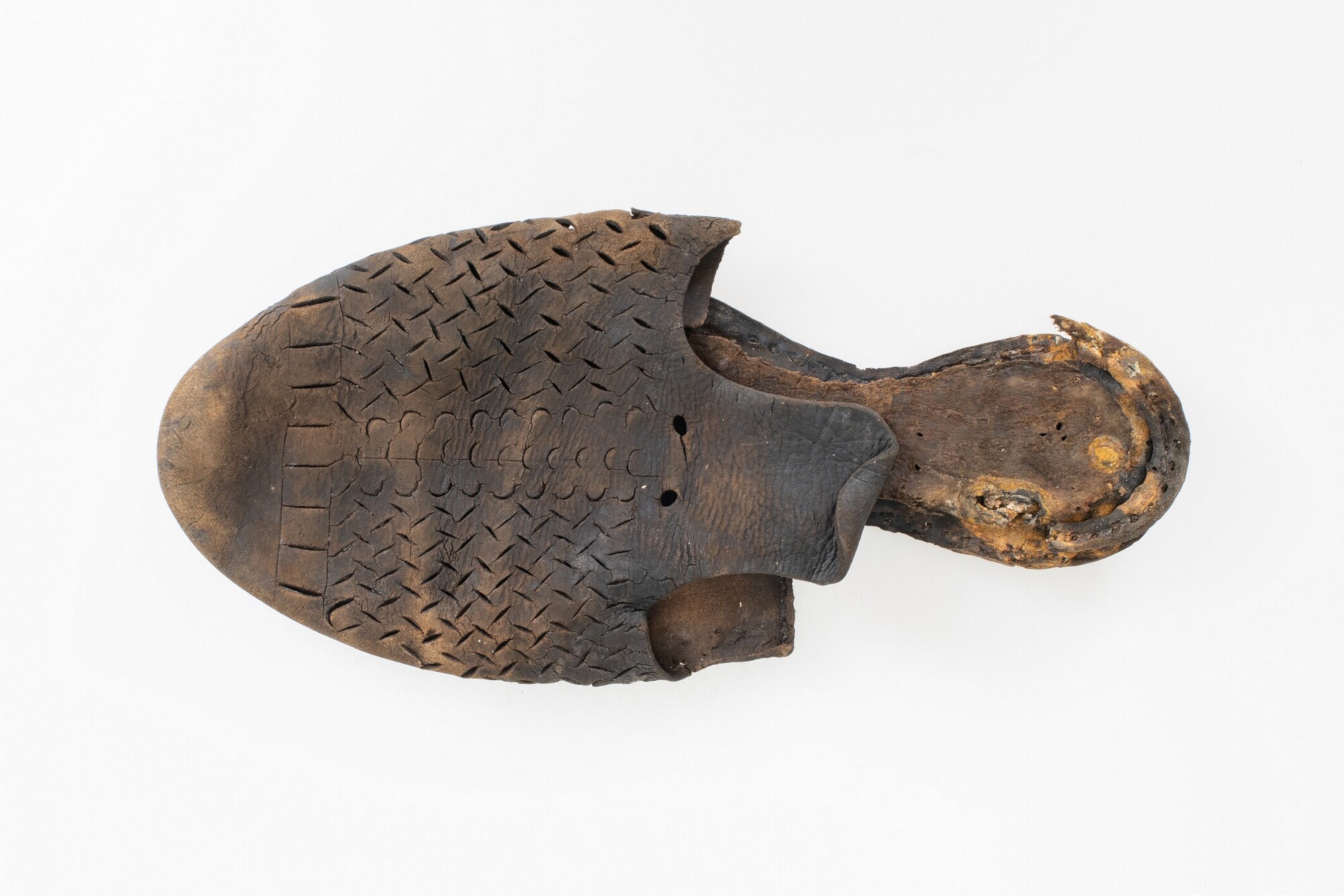 Schoen (incompleet); Goubitz type 130; twee schoenzolen en voorblad; langs de rand gestikt; houten pennen in de zool; voorblad versierd met geometrisch patroon van gekerfde lijnen en boogjes; twee vetergaten; schoenmaat 35