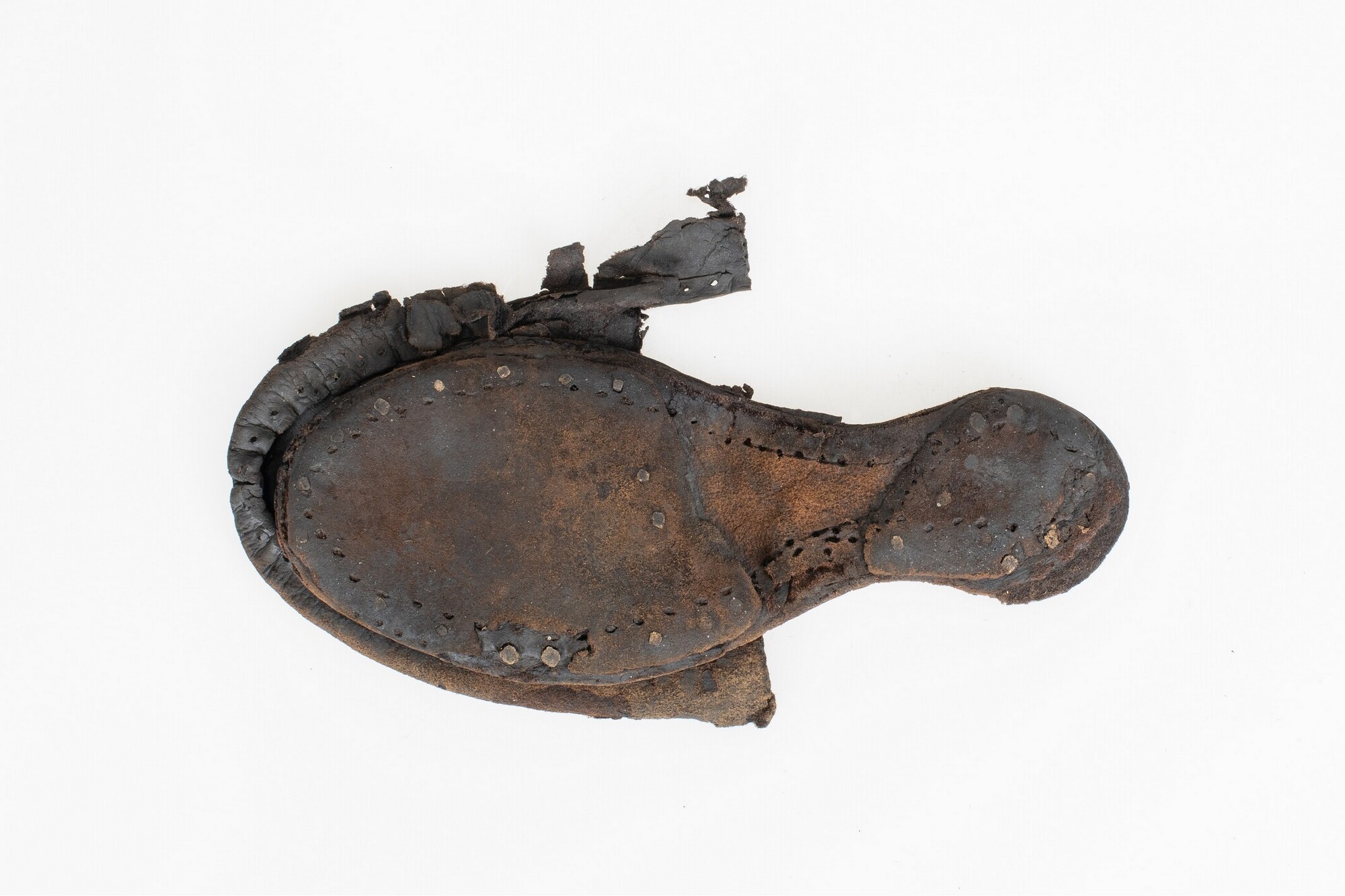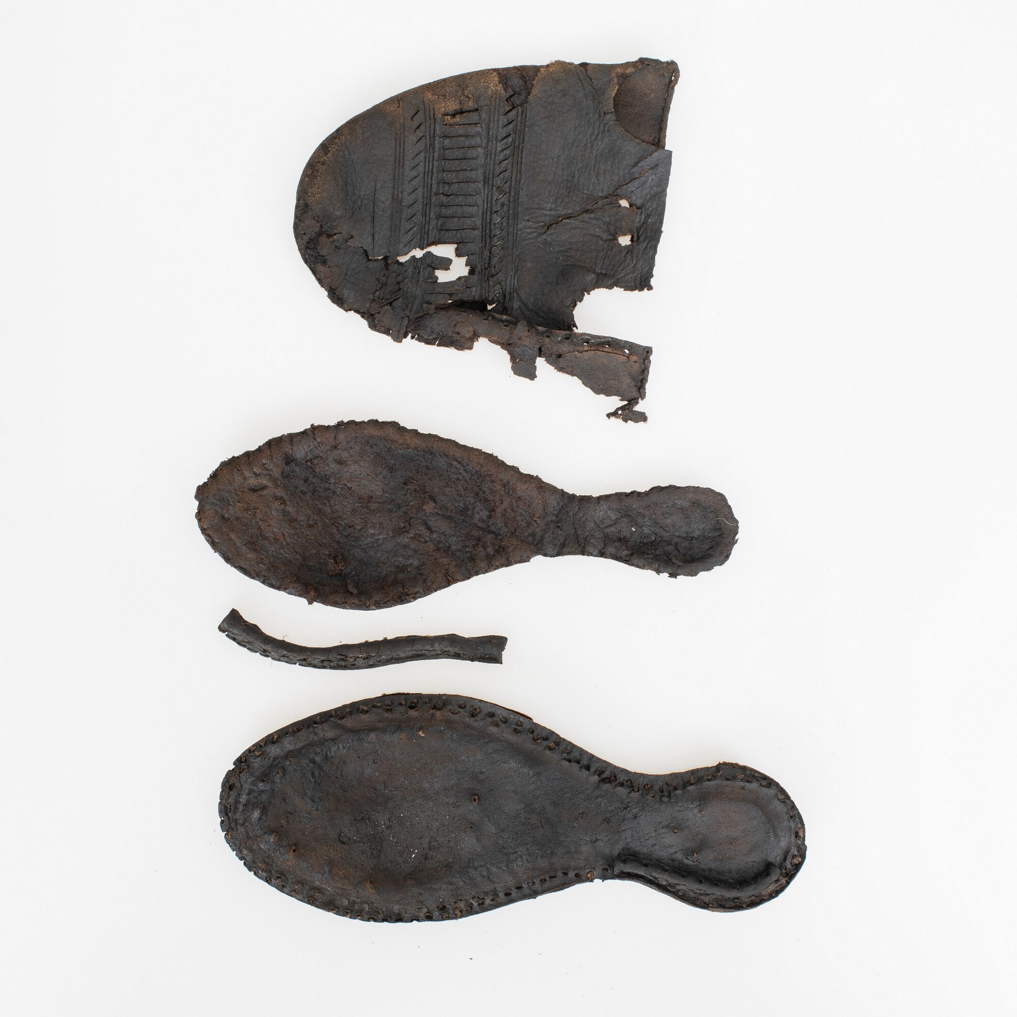 Schoen (incompleet); Goubitz type 130; twee schoenzolen en voorblad; langs de rand gestikt; houten pennen in de zool; voorblad versierd met geometrisch patroon van gekerfde lijnen; twee vetergaten; schoenmaat 33