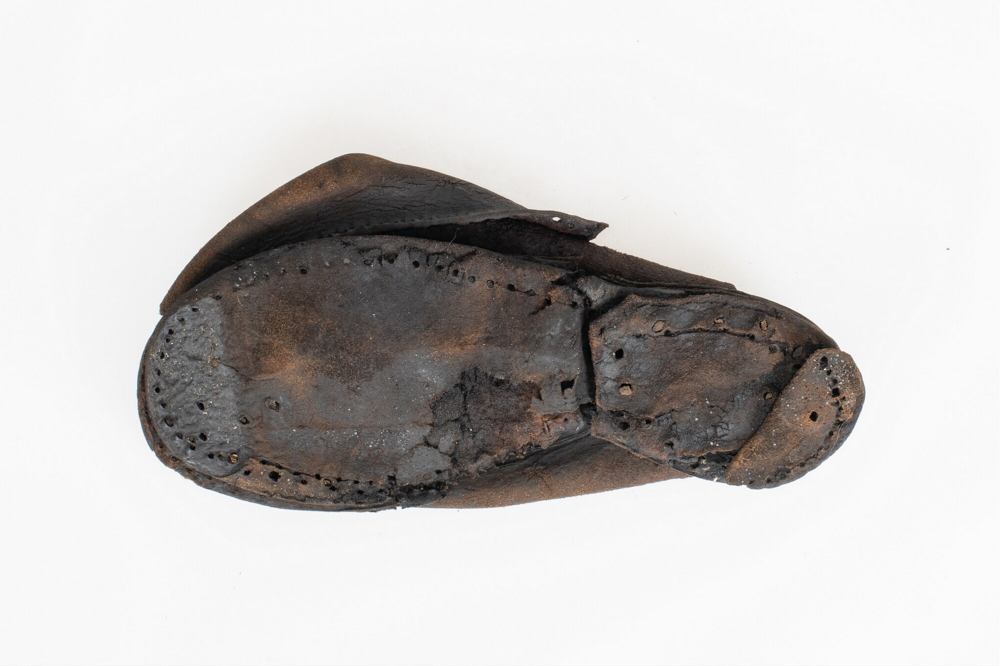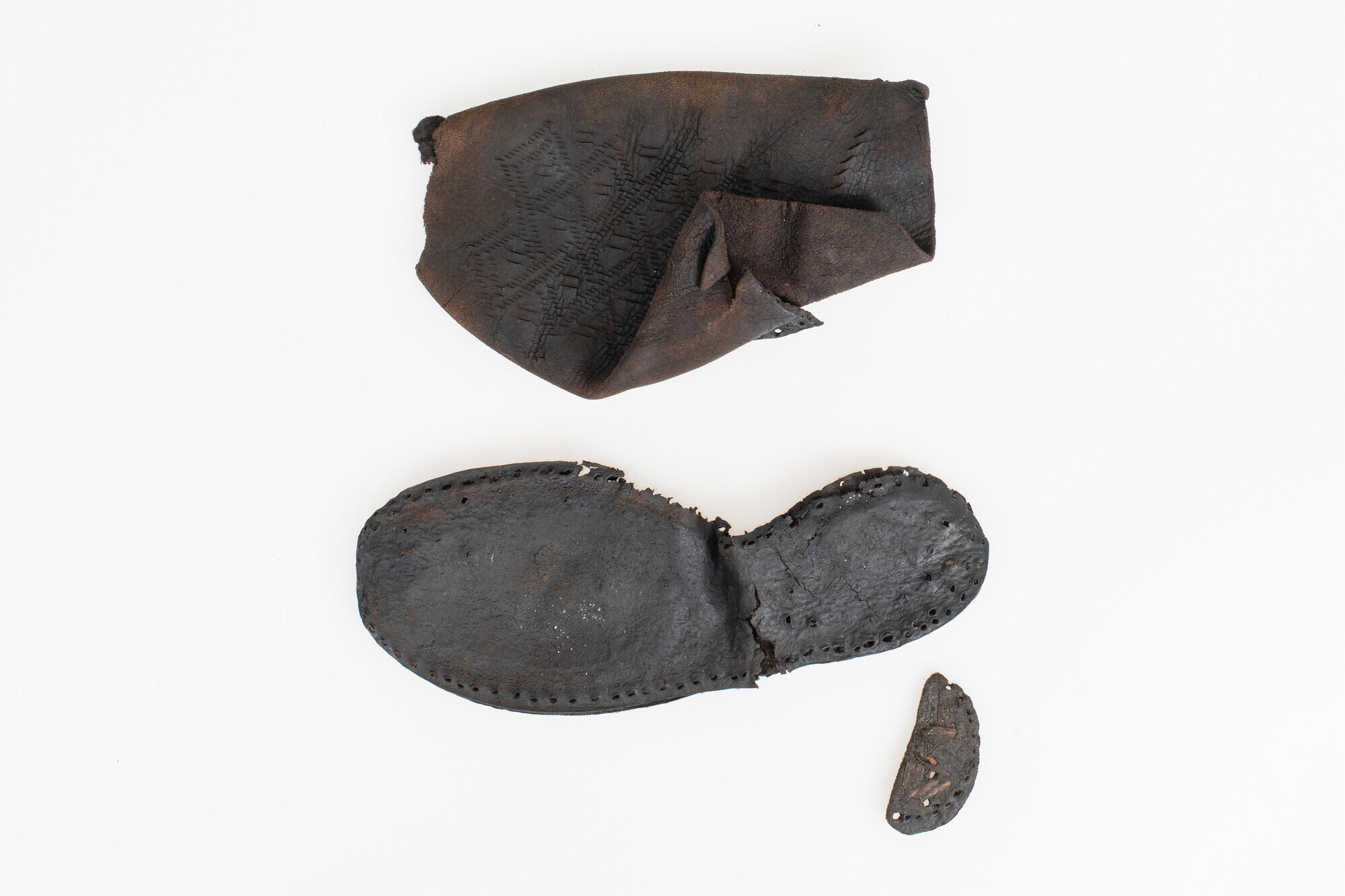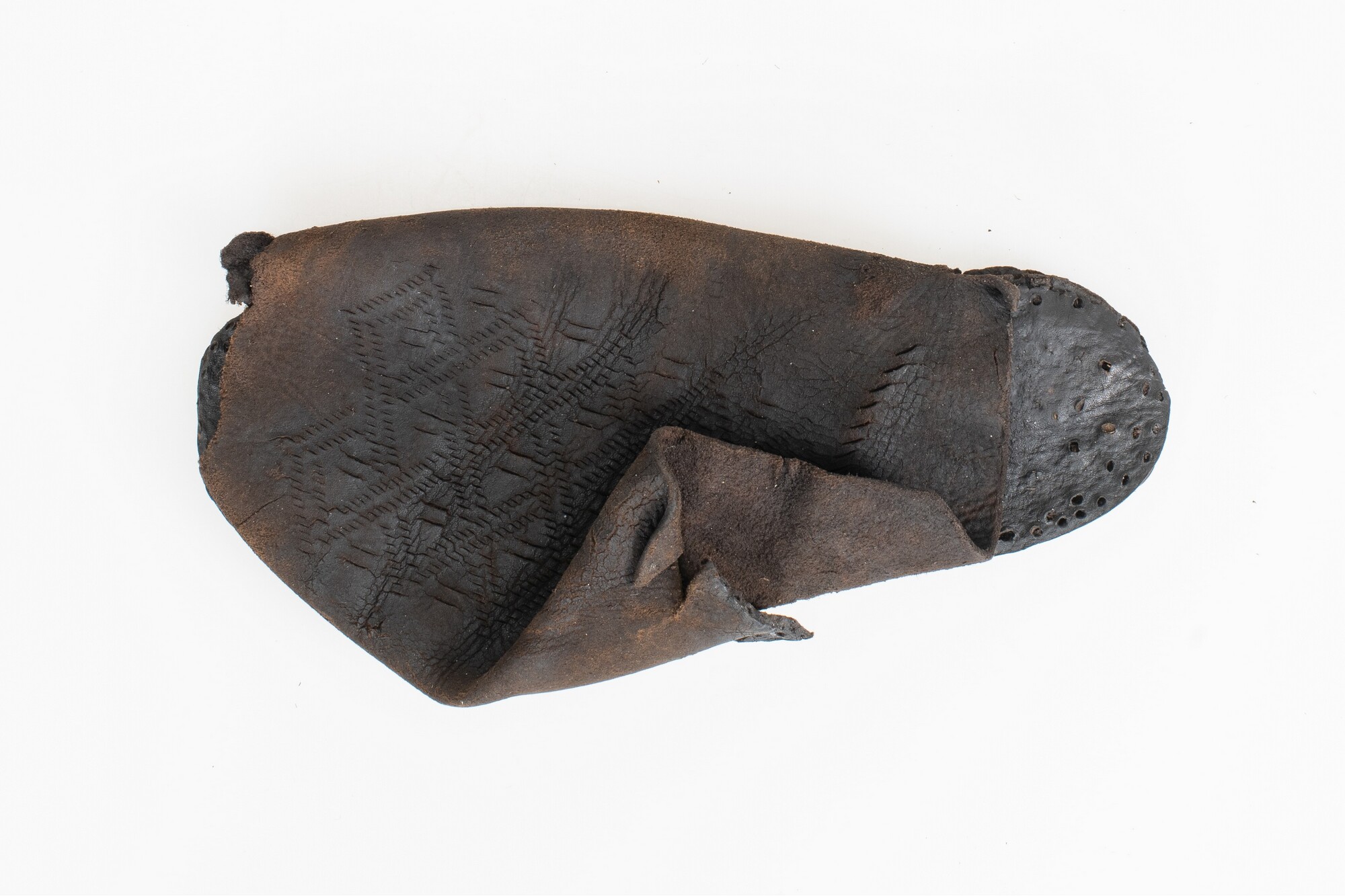 Schoen (incompleet); Goubitz type 90; schoenzool en voorblad; langs de rand gestikt; houten pennen in de zool; voorblad versierd met geometrisch patroon van gekerfde lijnen in ruitvormen; schoenmaat 33