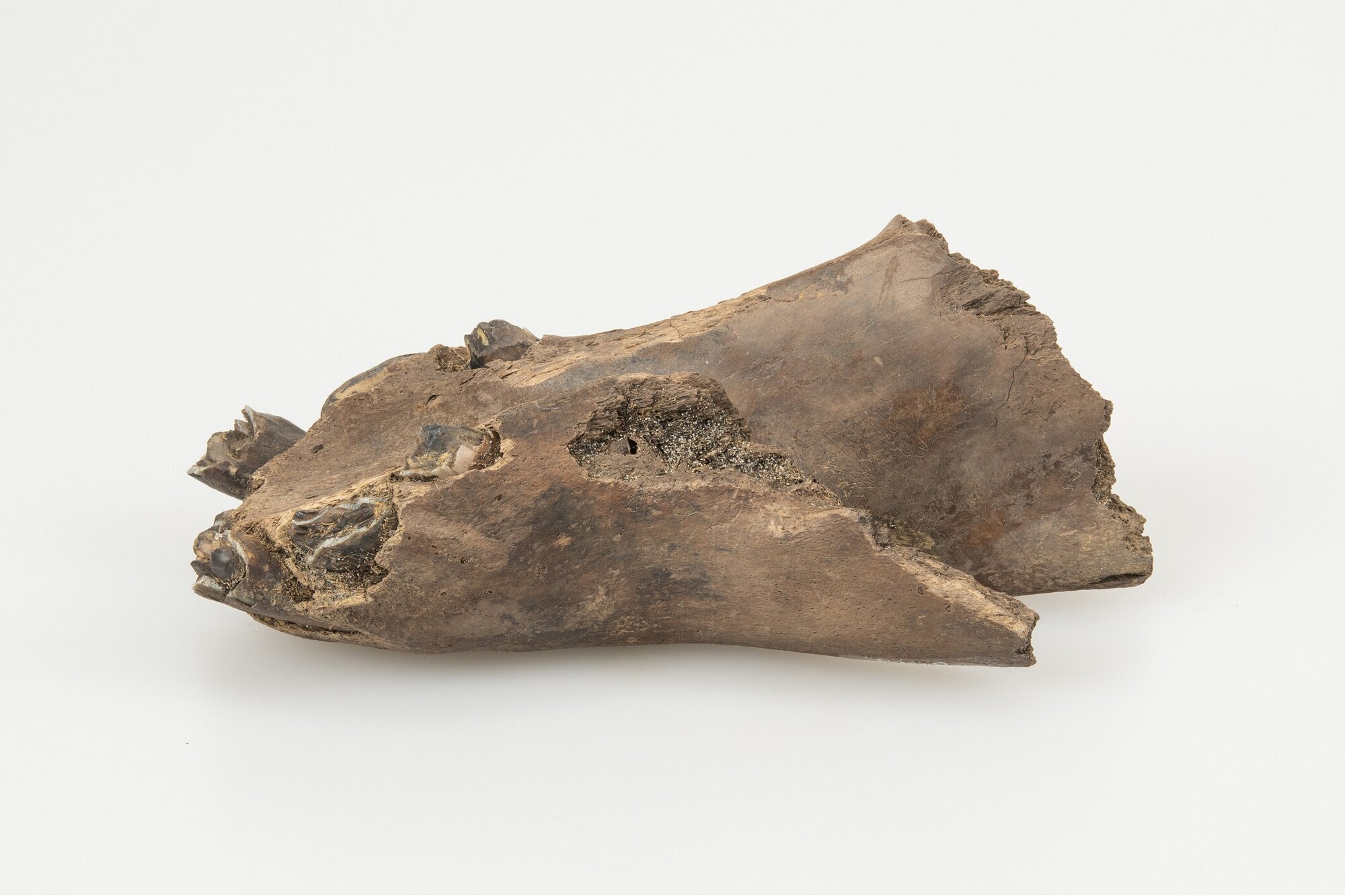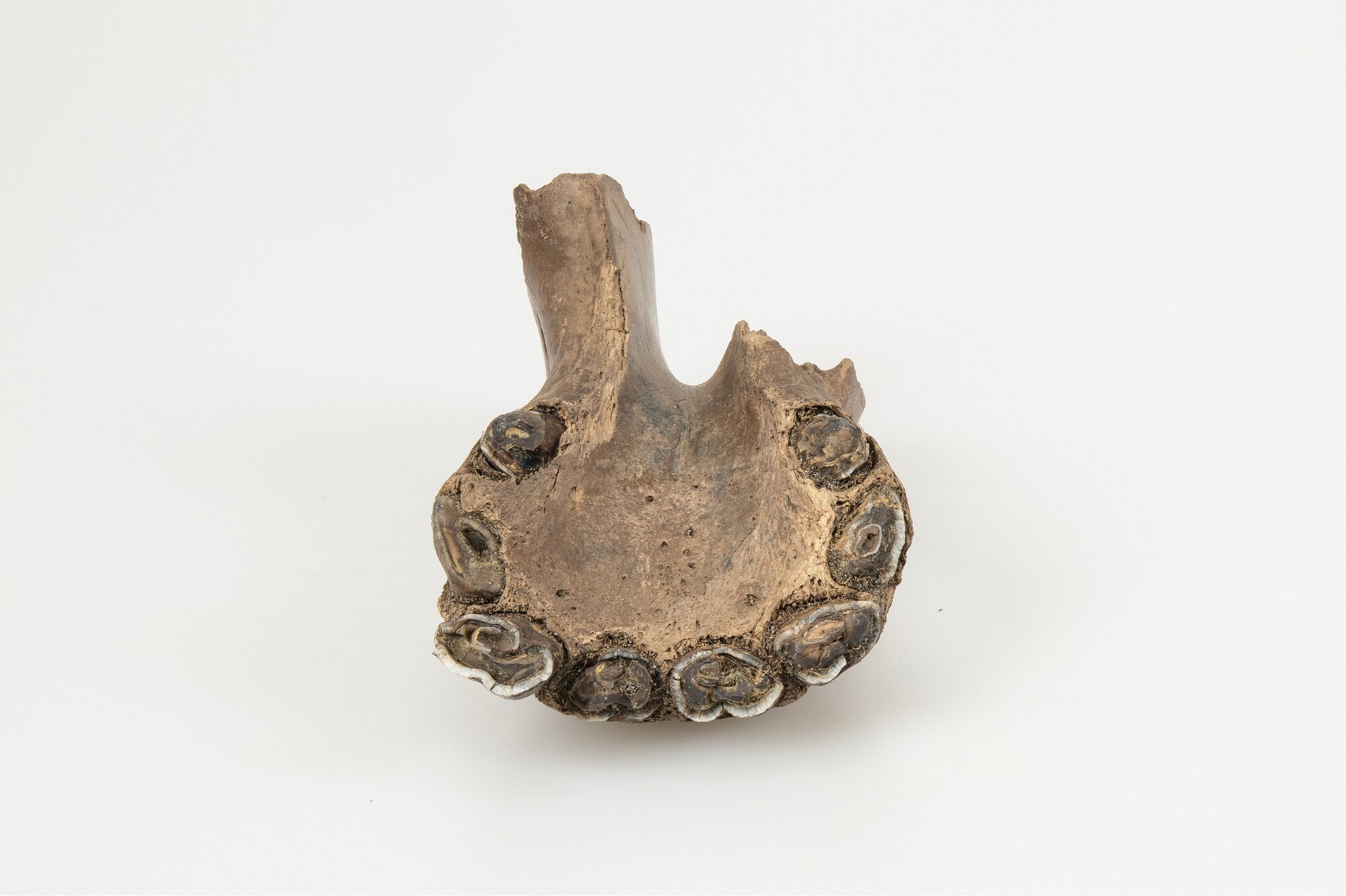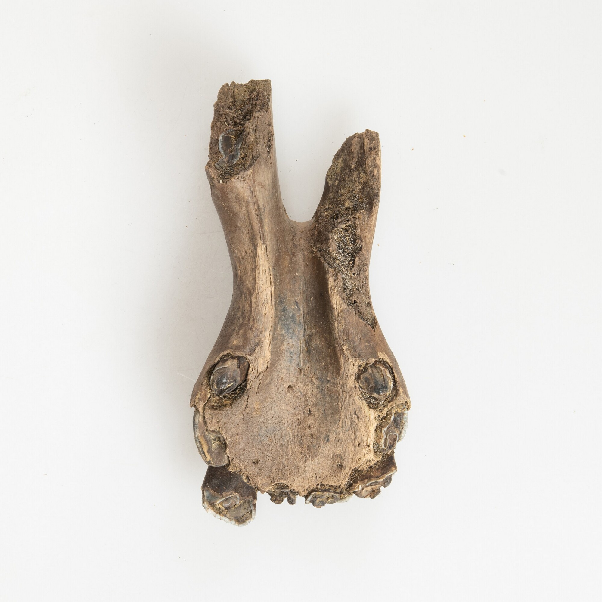 Onderkaak paard (Equus caballus); fragment; merrie; jonger dan 4 jaar, te zien aan de opkomende volwassen tanden