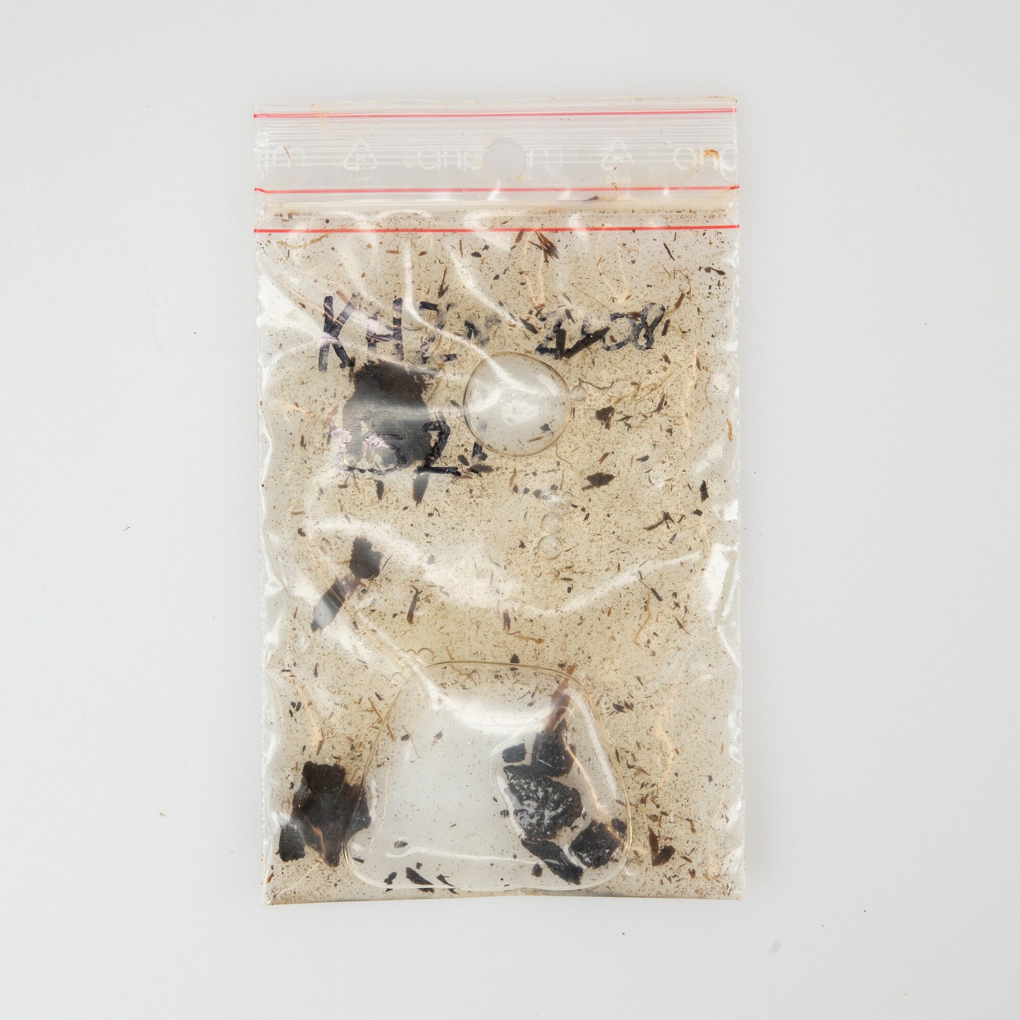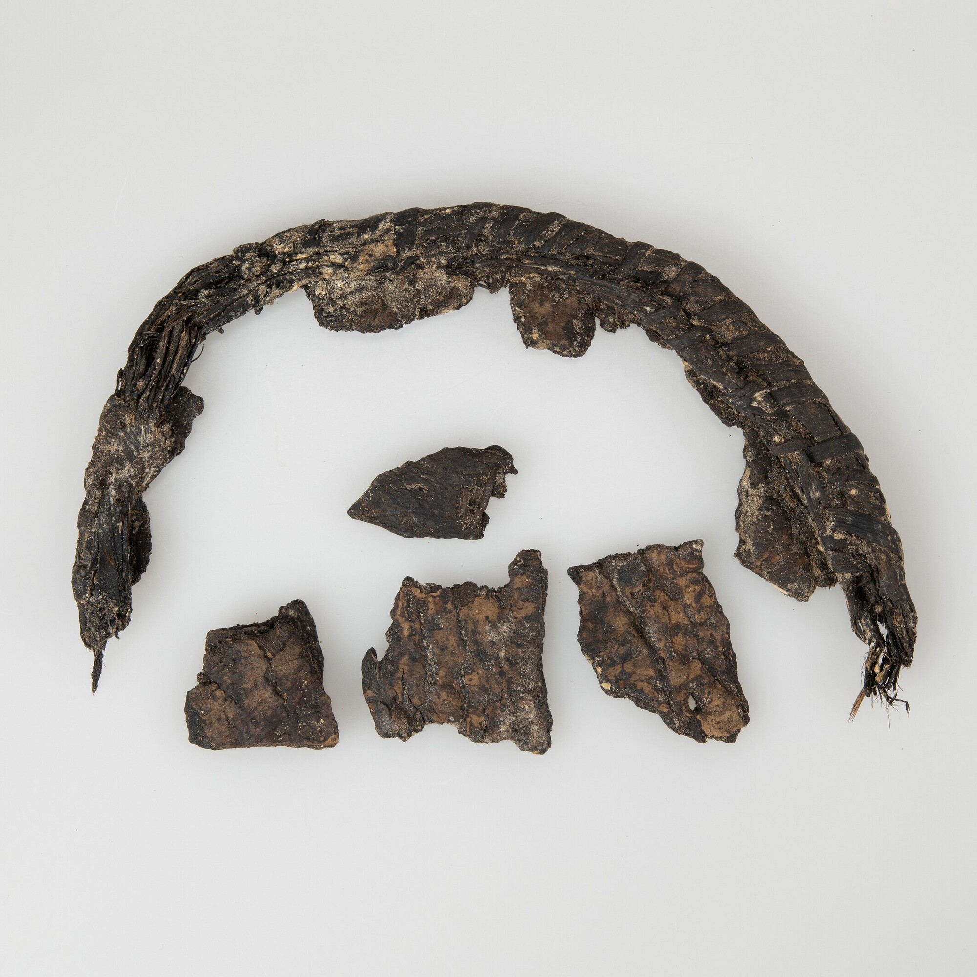 Deksel (waarschijnlijk); schijf van berkenbast met gevlochten vezels; fragment; het bestaat uit een strook berkenbast van 0,2 - 0,5 cm dik, waaraan langs de randen een opstaande rand van organische vezels is vastgezet; die rand bestaat uit twee vezelringen; de binnenste ring bestaat uit de omgeslagen randen van het bast die door vezelstrengen zijn omwikkeld; ...