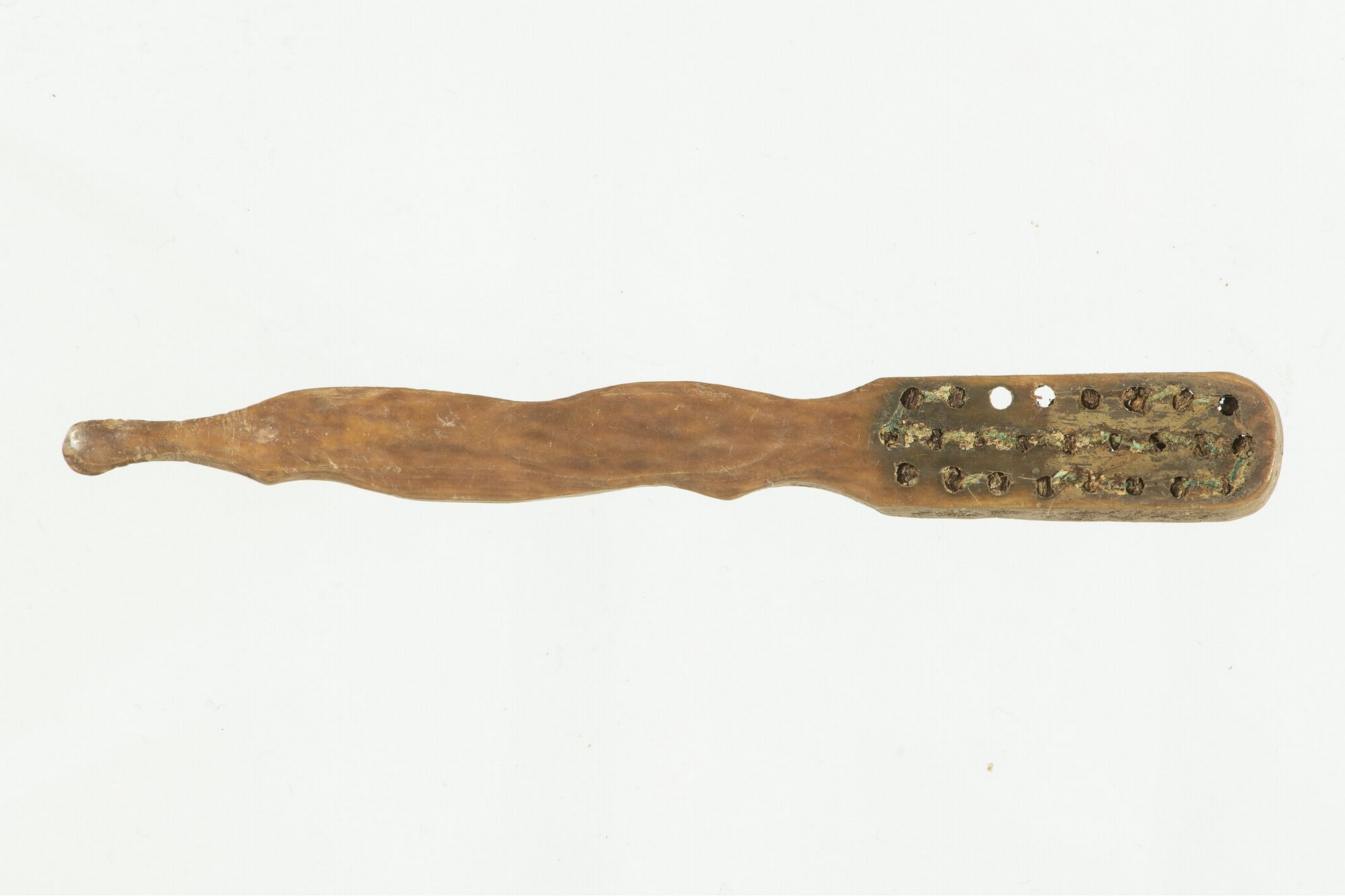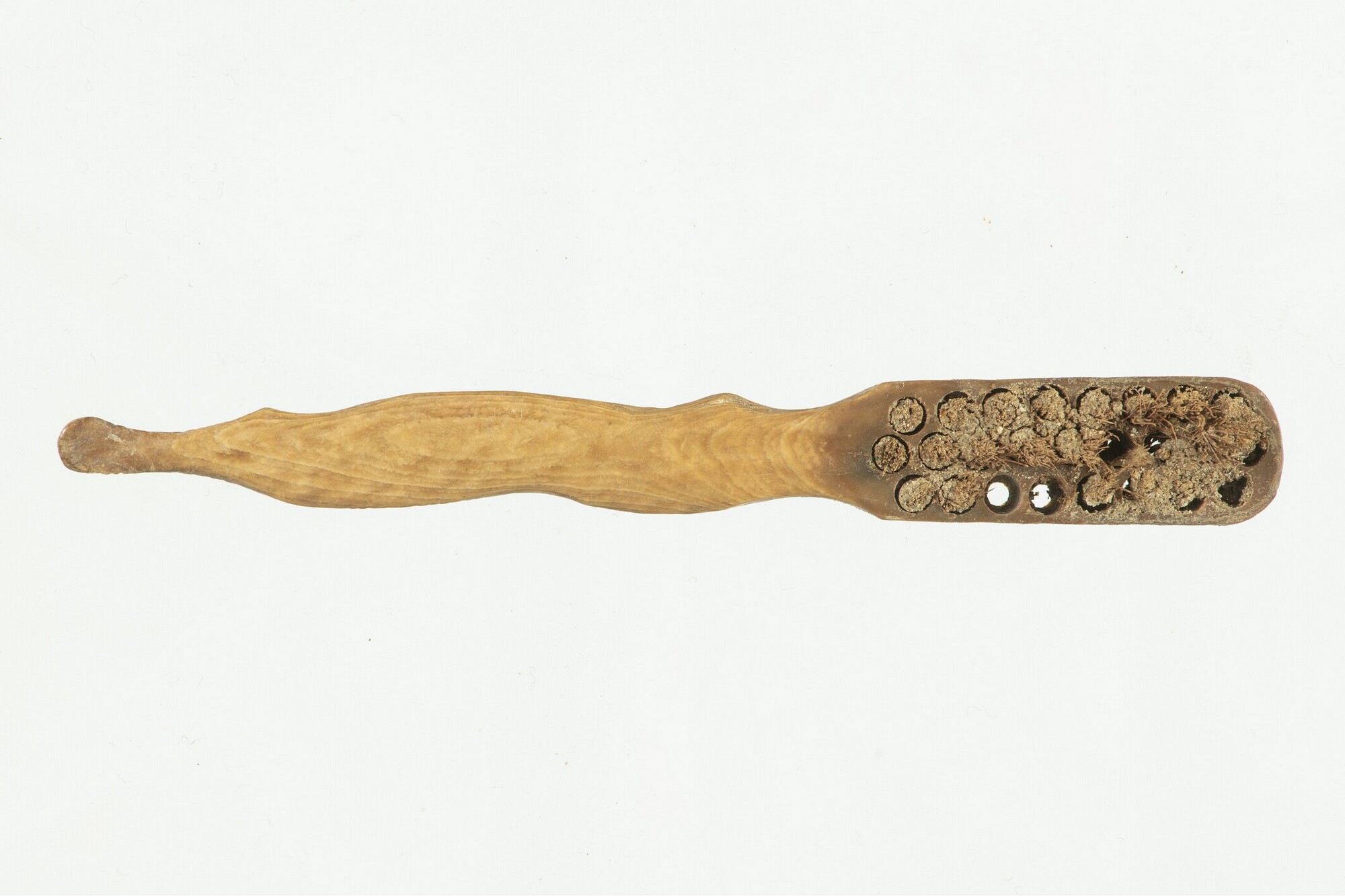 Tandenborstel; klein formaat reistandenborstel met oorlepel aan uiteinde handvat (secundair bewerkt?); kronkelend handvat; borstel van varkensharen, vastgezet met koperdraad