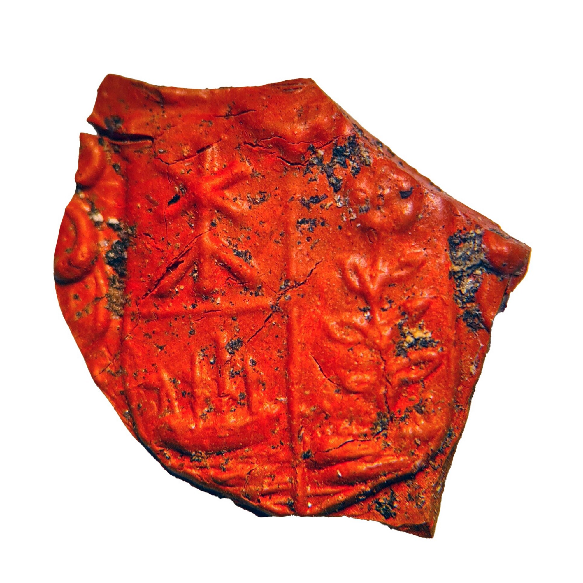 Lakzegel (fragment); wapenschild met drie vlakken: huismerk, schip (driemaster) en bloem