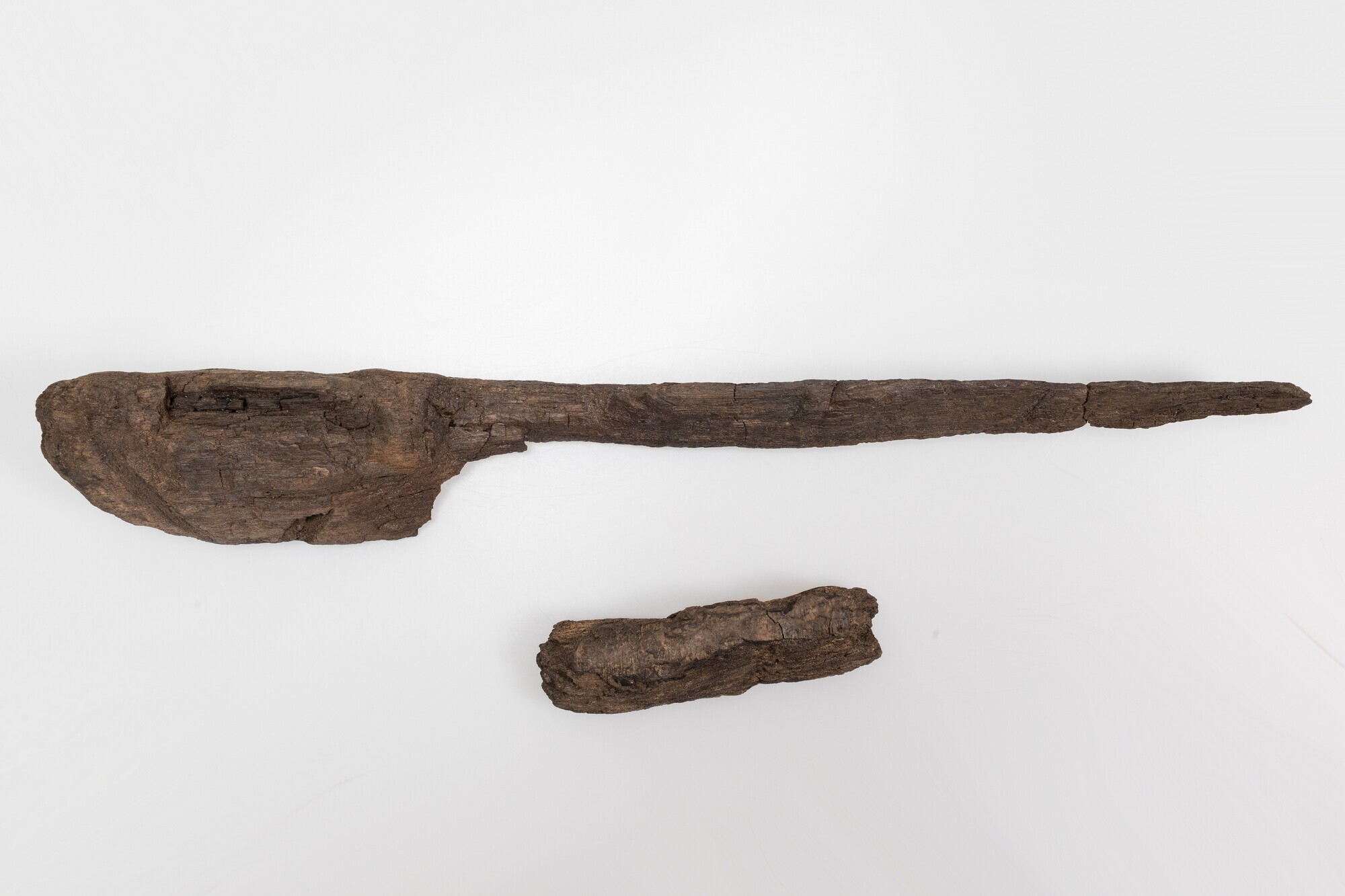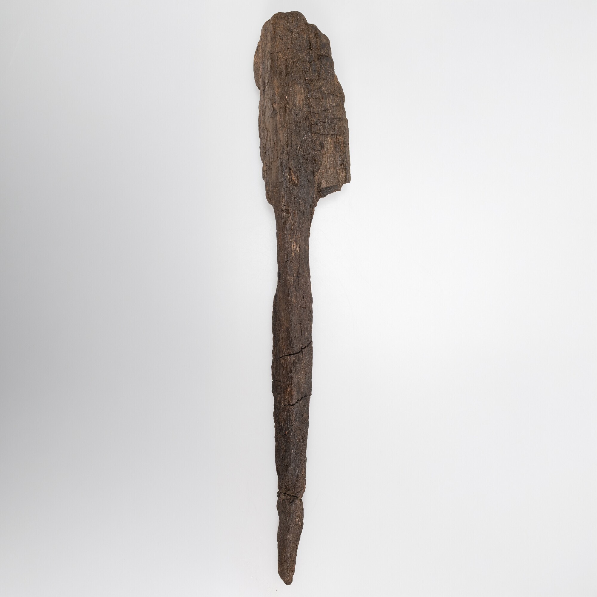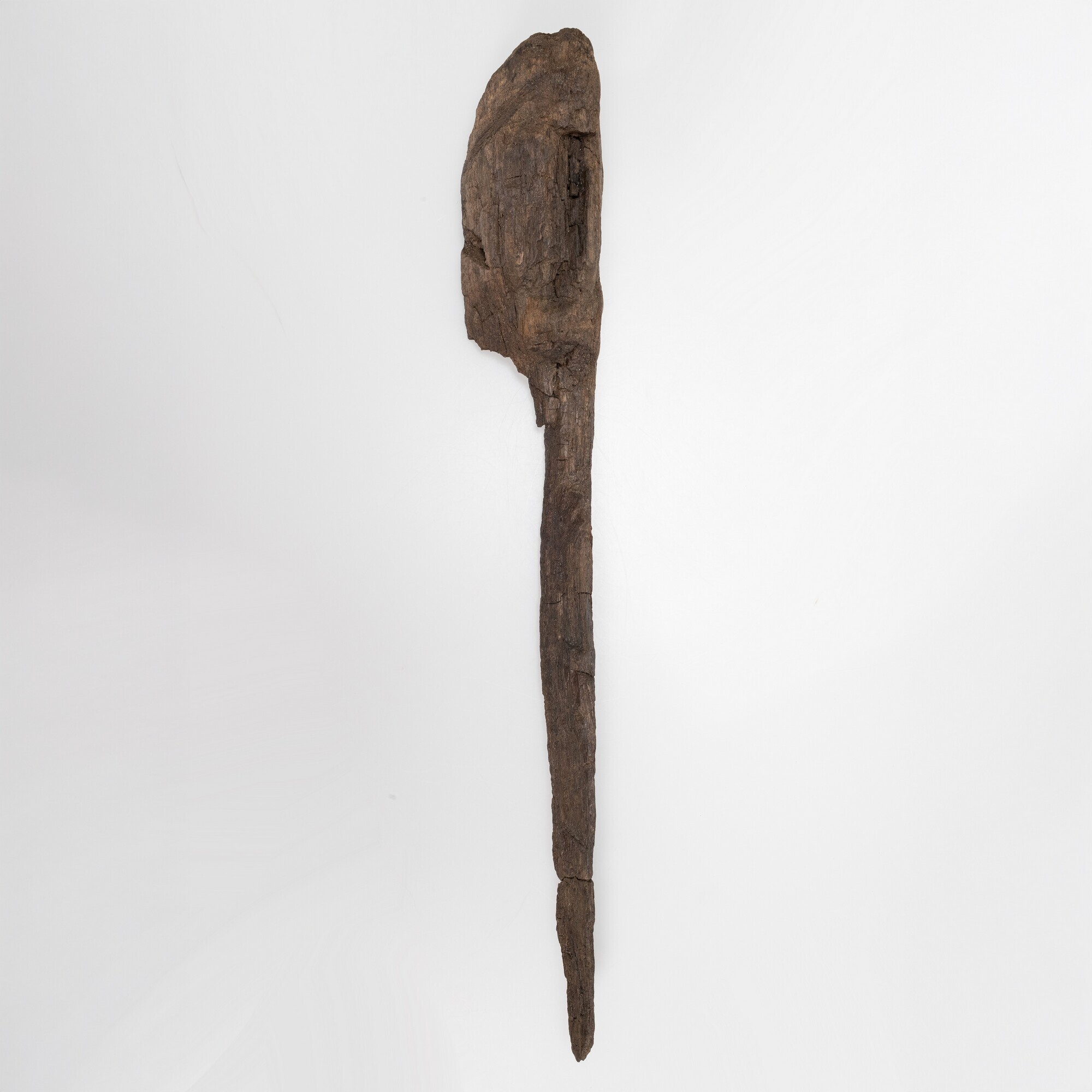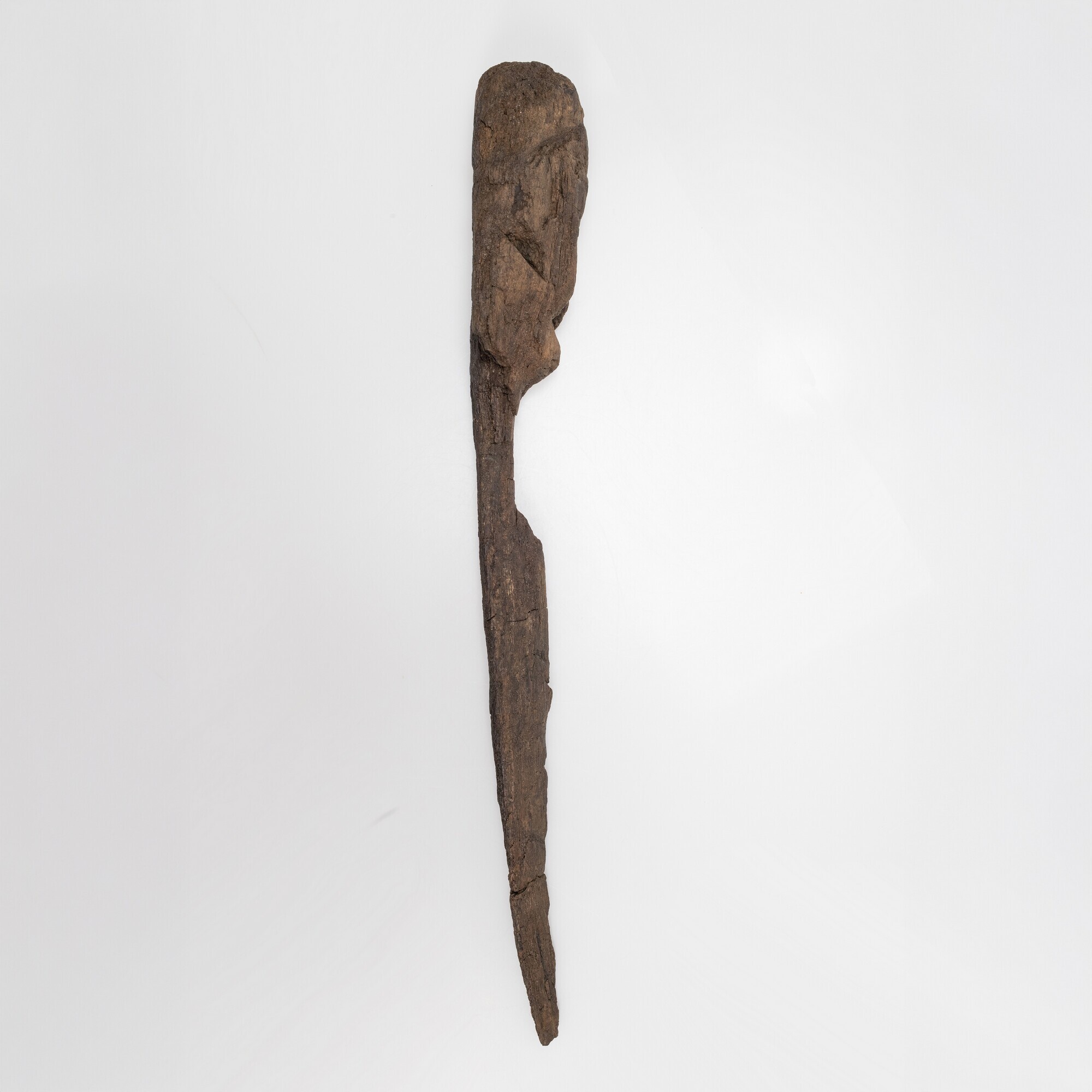 De helft van een antropomorfe figuur in de vorm van een hoofd op een steel met een vlakke achterzijde. Het geheel is uit één tak gesneden. Het hoofd is eivormig, met een lange rechte neus, een korte aanzet tot een wenkbrauwboog, een ovaal verdiept vlak rond oogkas en wang, volle lippen met neerwaarts gerichte mondhoeken ...
