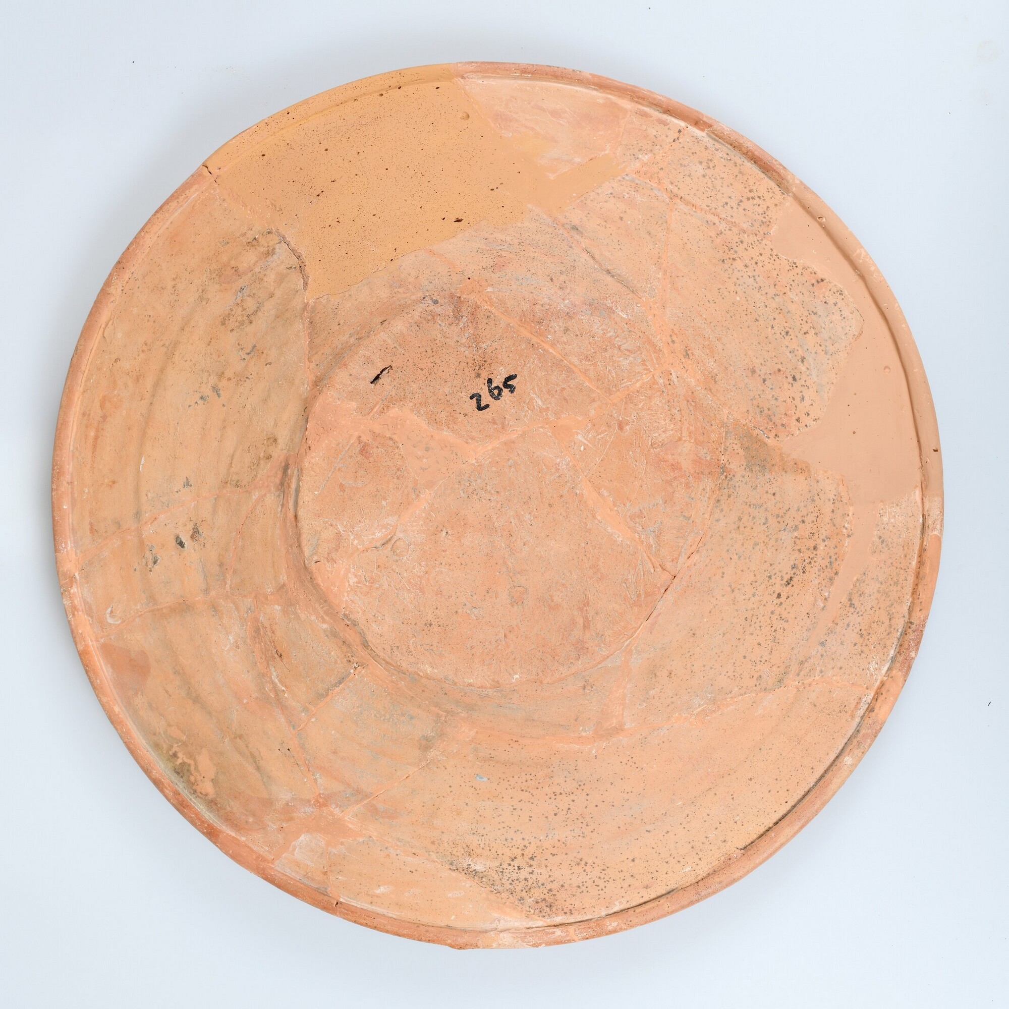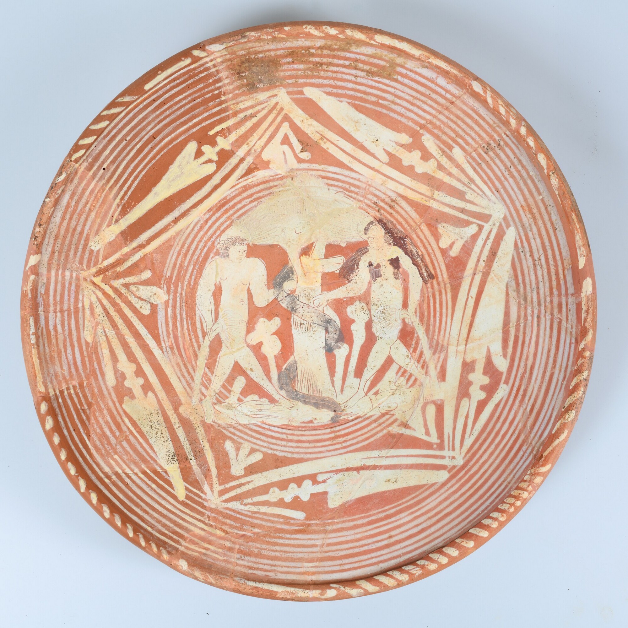 Schotel; wa-bor-1; conisch bord met smalle afgeronde kraagrand, standvlak; roodbakkend Werra-aardewerk; ongeglazuurd, halffabricaat; slibversiering; slib-krastechniek; vlag: concentrische cirkels, stilistische bladmotieven in stervorm, spiegel: Adam en Eva met slang in de hof van Eden; productieplaats: Enkhuizen