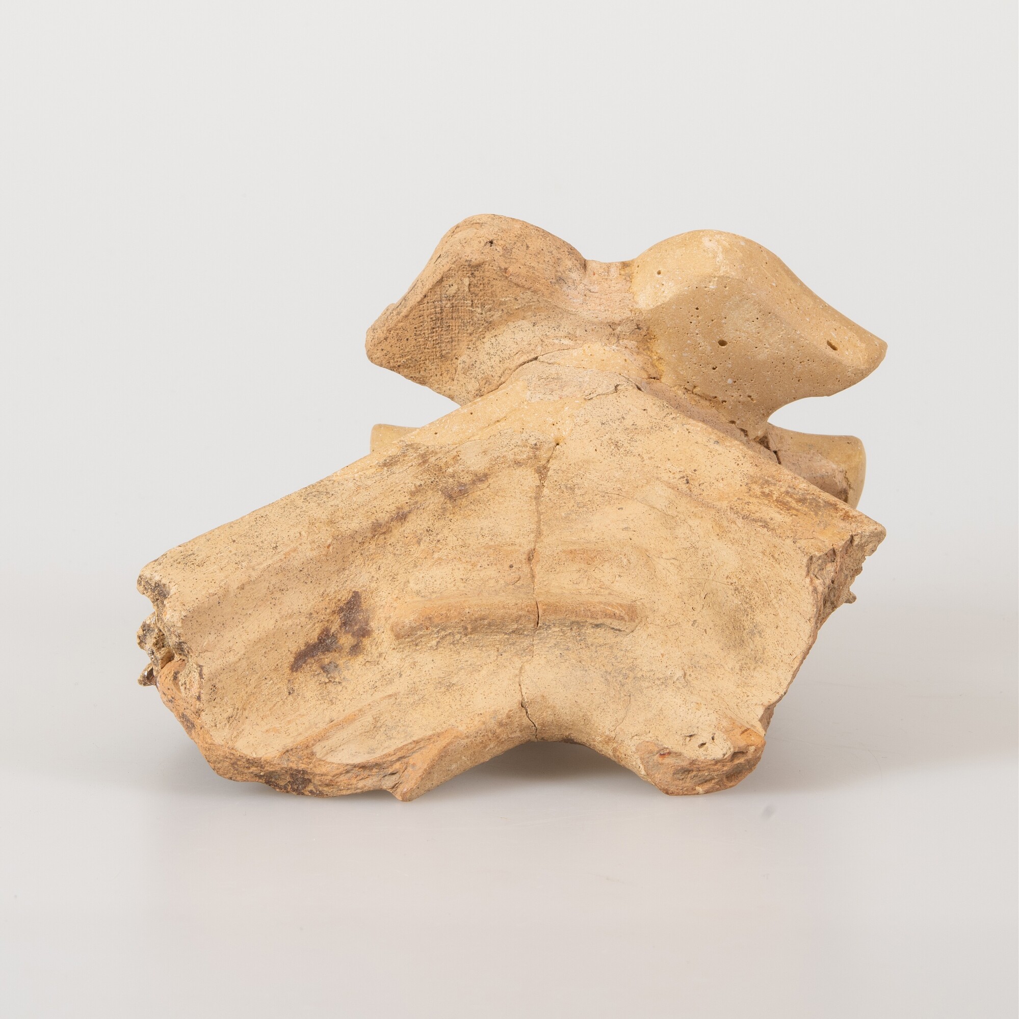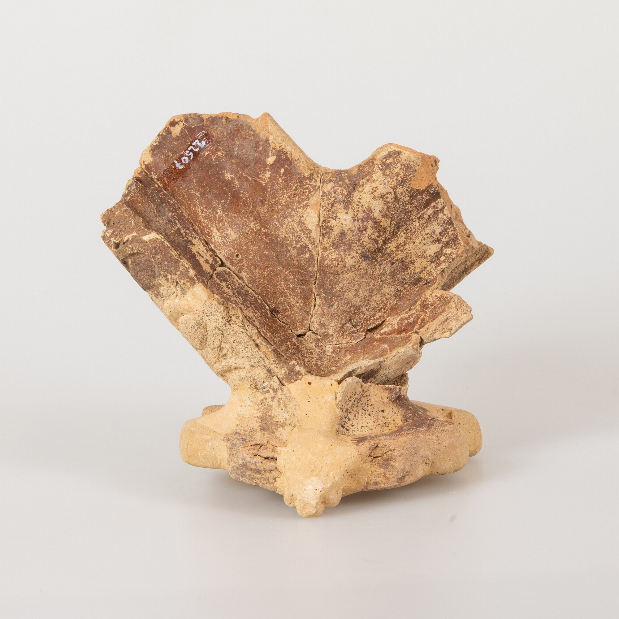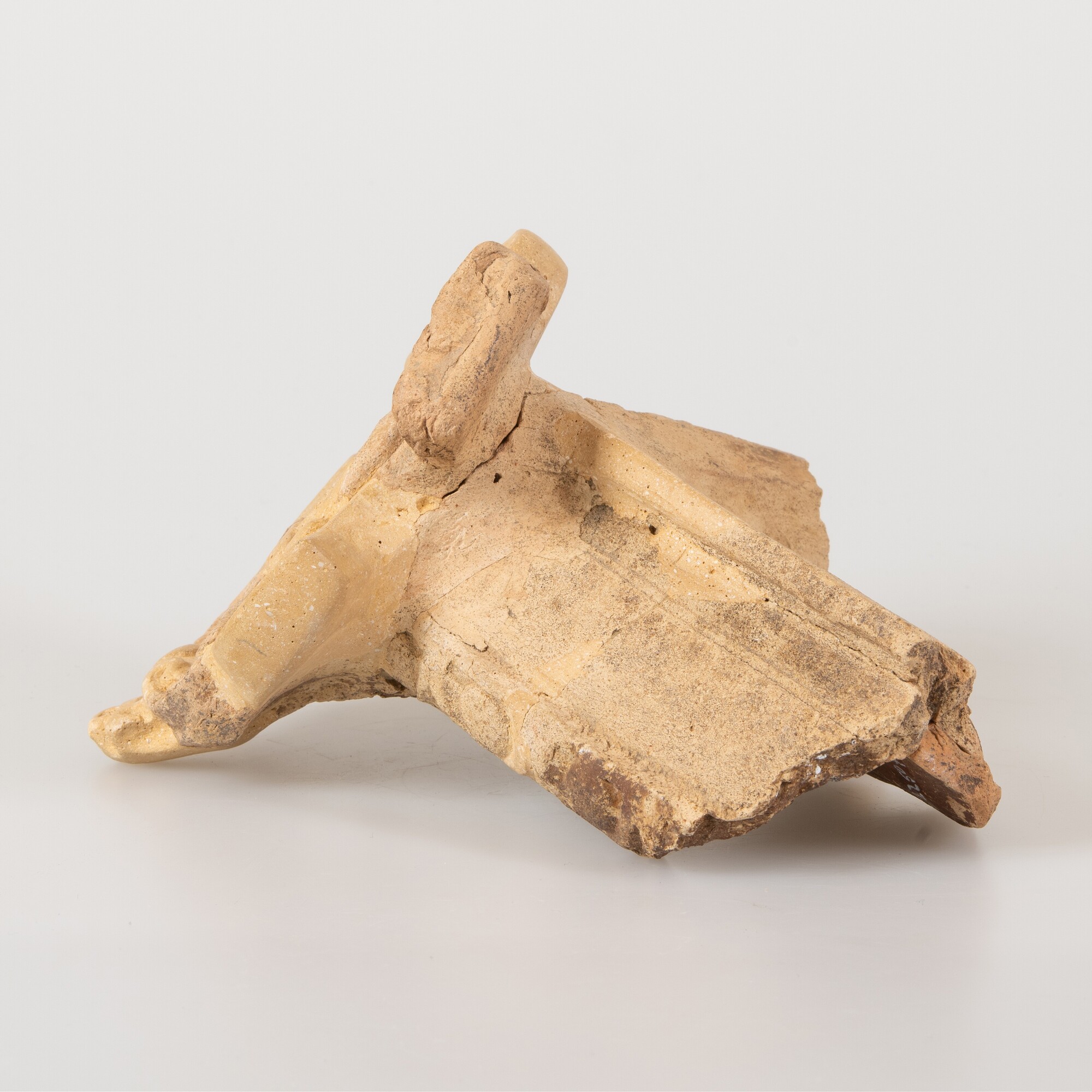 Kacheltegel; hoekelement type E; roodbakkend ongeglazuurd aardewerk; reliëflijst met op de hoek een wapenschild met Franse lelie; productieplaats: Enkhuizen