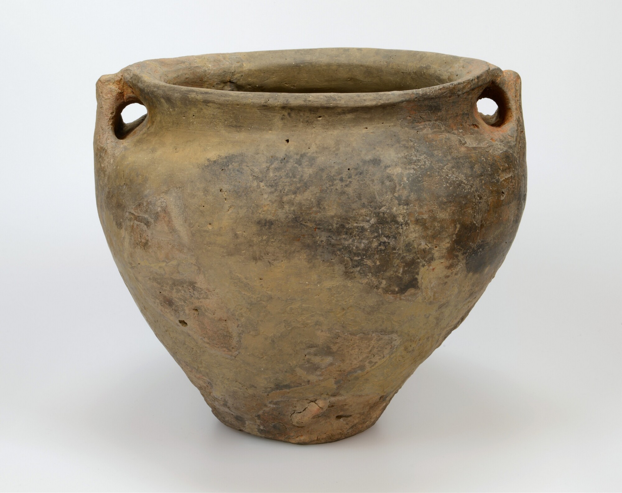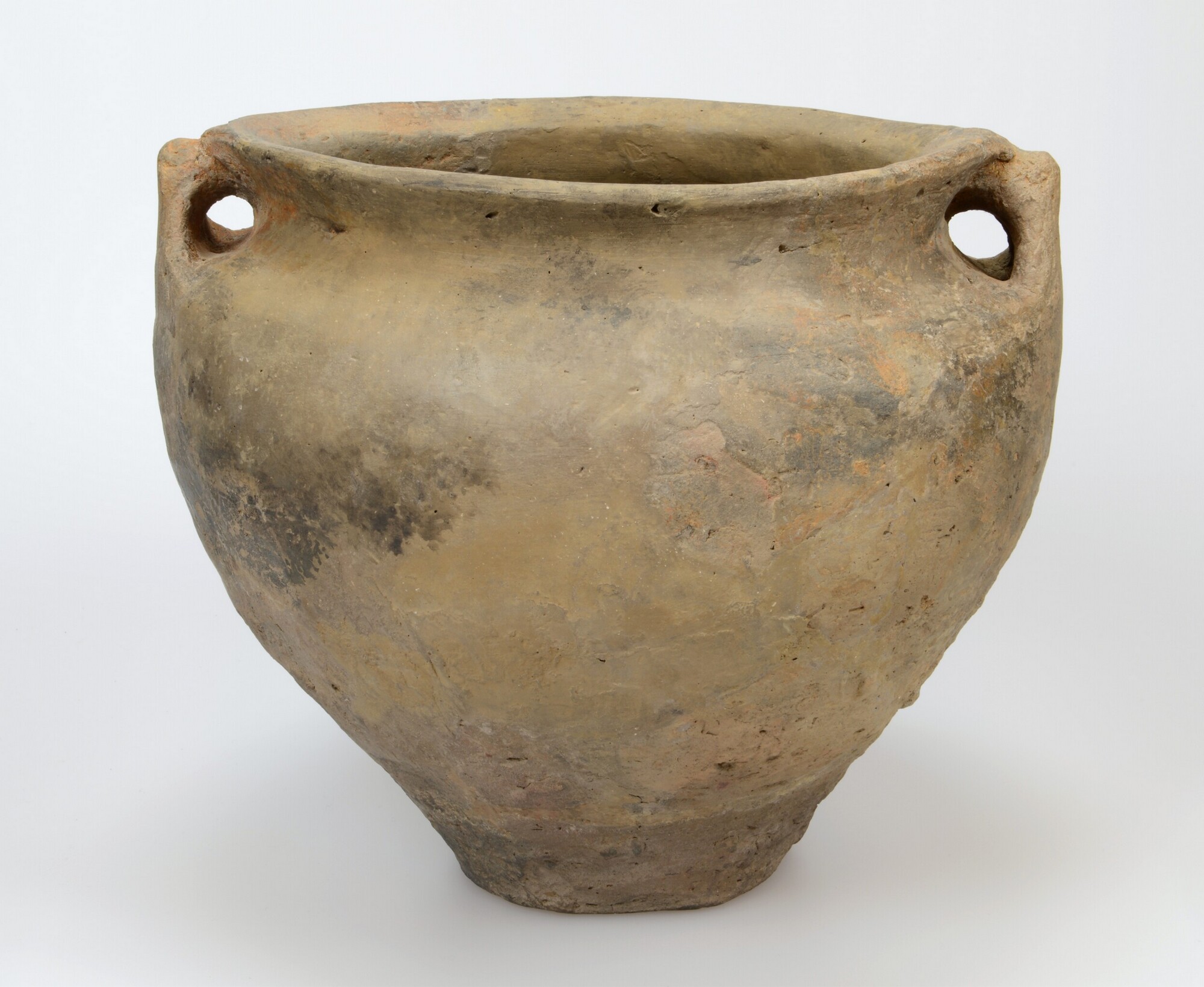 Pot; type Diederik F-II; inheems-Romeins aardewerk; handgevormd; wijdmondige pot met twee knobbeloren en een afgeschuinde rand; standvoet; bovenwand geglad en onderwand besmeten