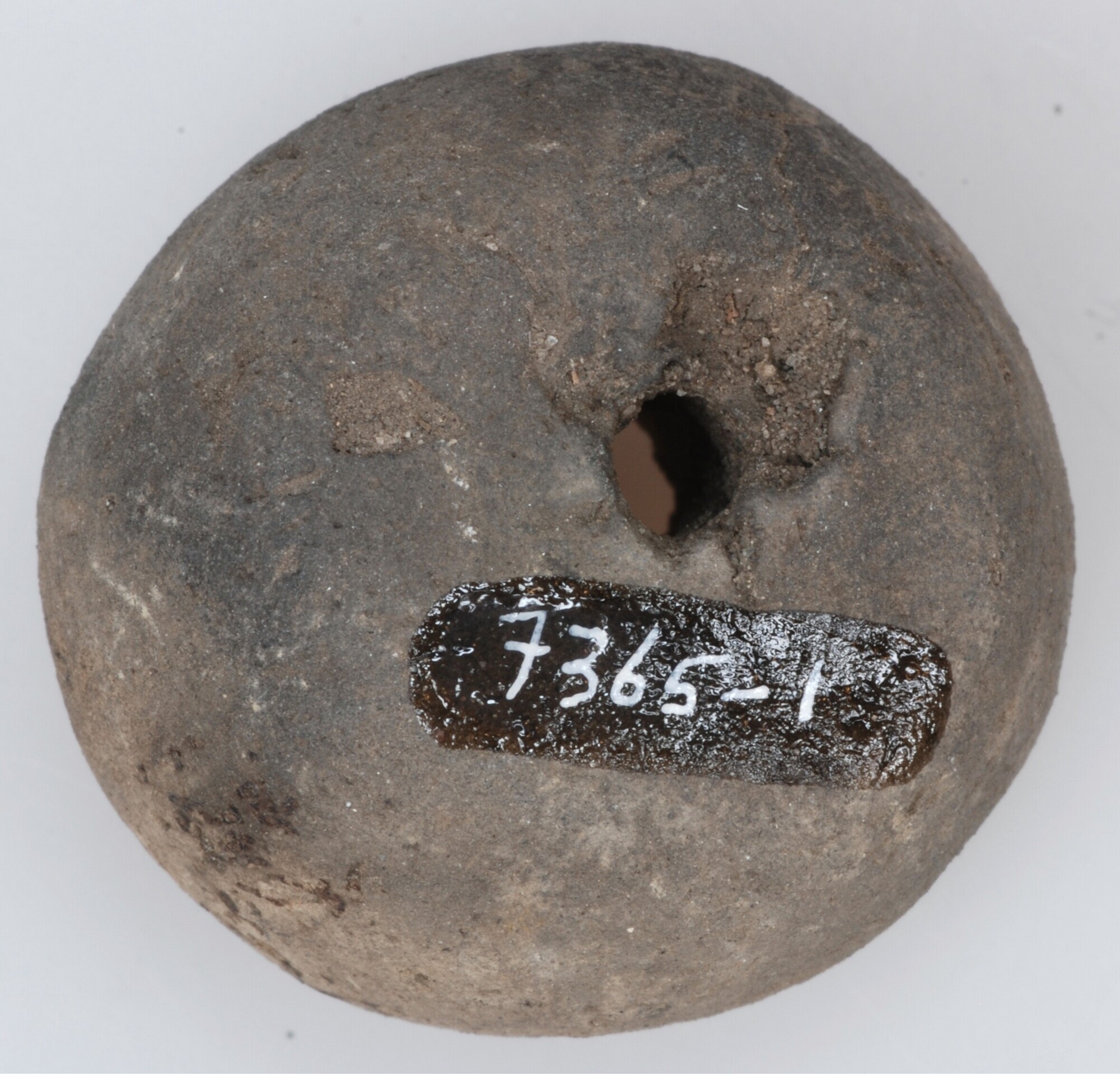 Spinsteen; handgevormd aardewerk; rond met centrale doorboring; afgesleten vlakken