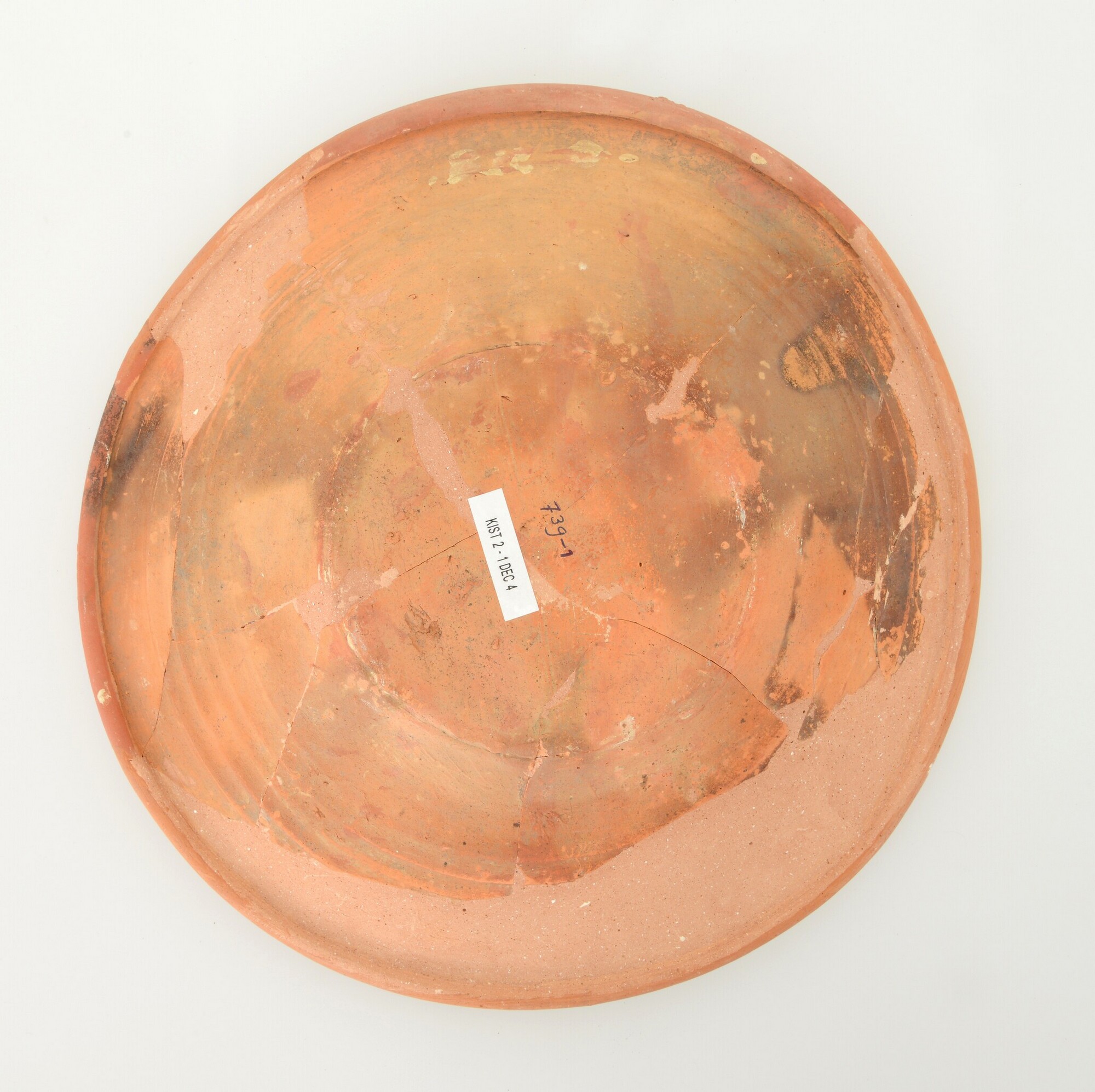 Schotel; wa-bor-1; roodbakkend; halffabricaat; biscuit; slibversiering; sp: kussen, jaartal 1605 en initialen DCS; vl: ornamentbanden; standvlak; productieplaats: Enkhuizen