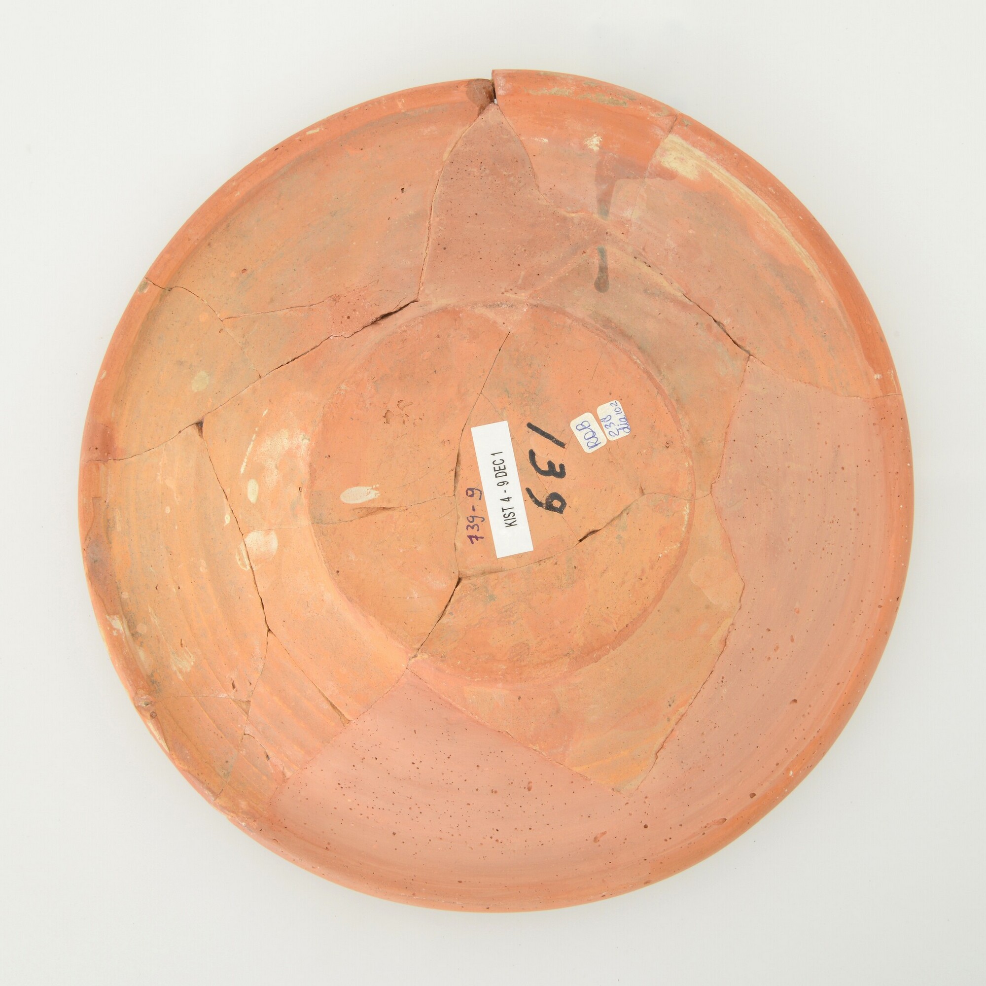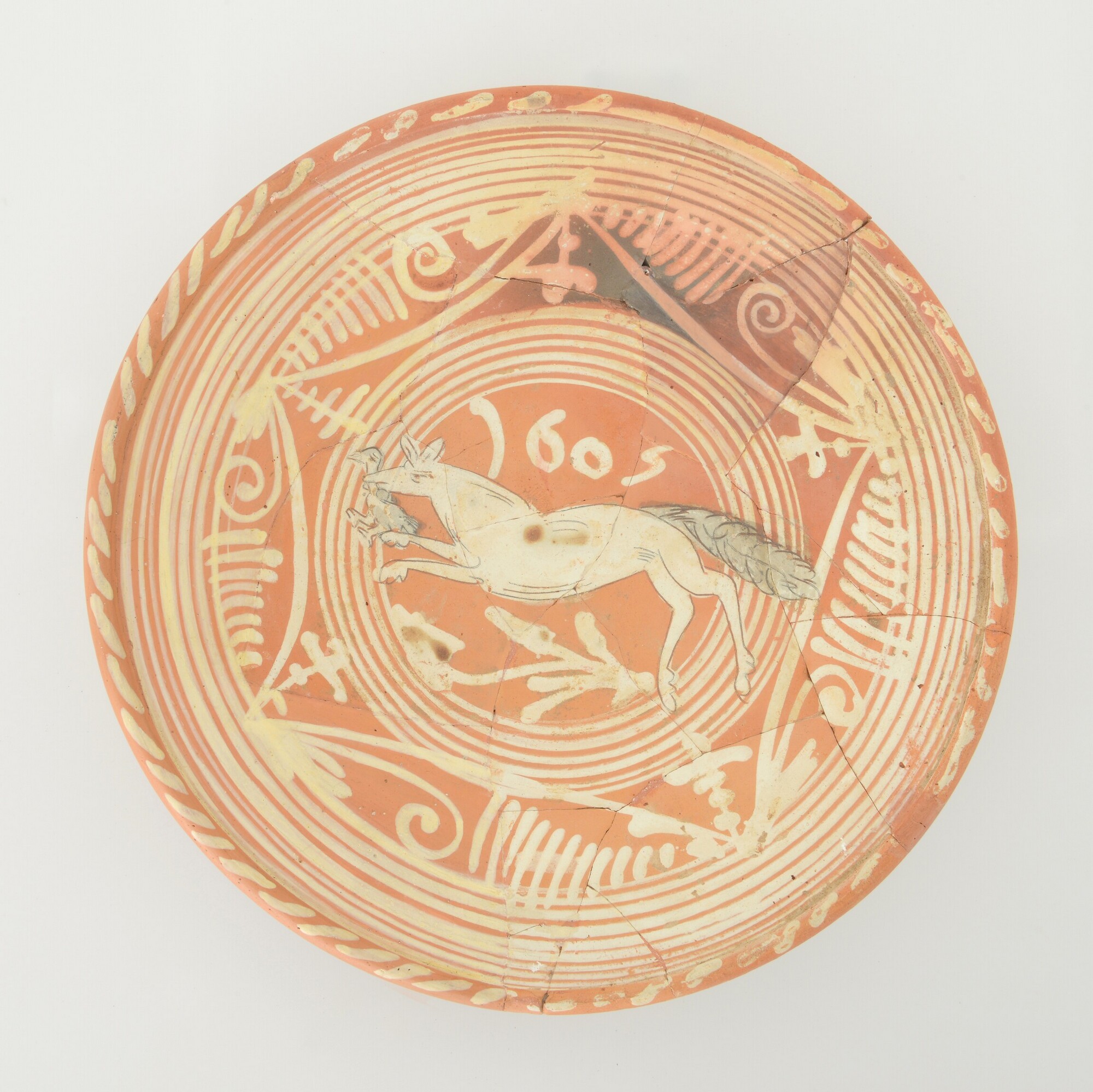 Schotel; wa-bor-1; roodbakkend; halffabricaat, biscuit; slibversiering; sp: vos DCS 1605; vl: ornamentbanden; standvlak; productieplaats: Enkhuizen