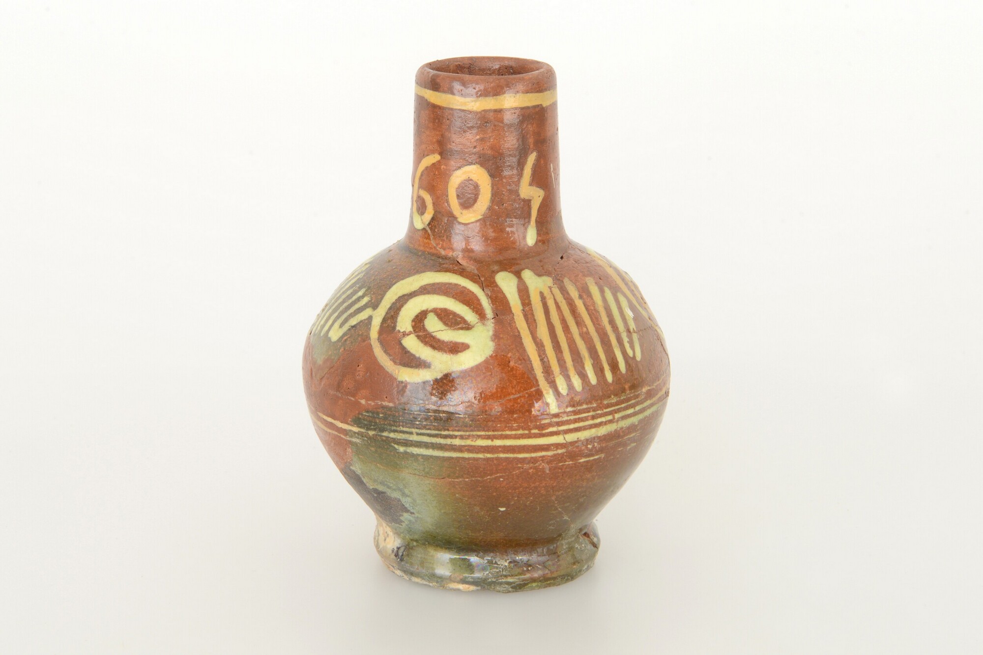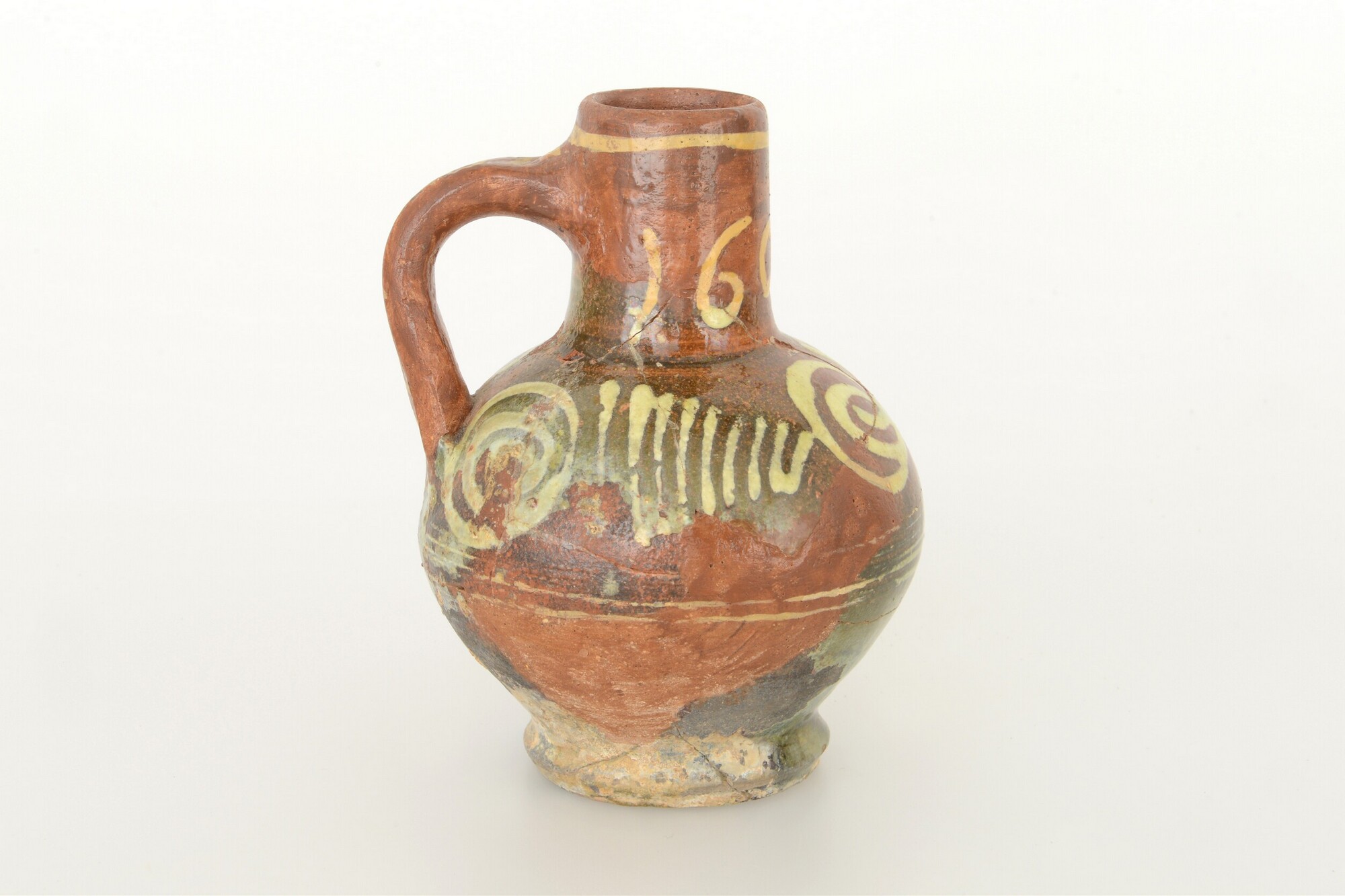 Kan; wa-kan-1; roodbakkend; verbrand; loodglazuur; slibversiering met jaartal 1605; standvlak; verticaal lintoor; productieplaats: Enkhuizen