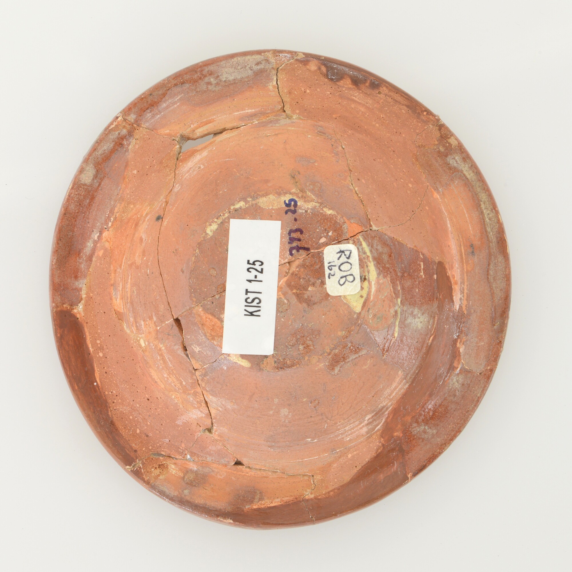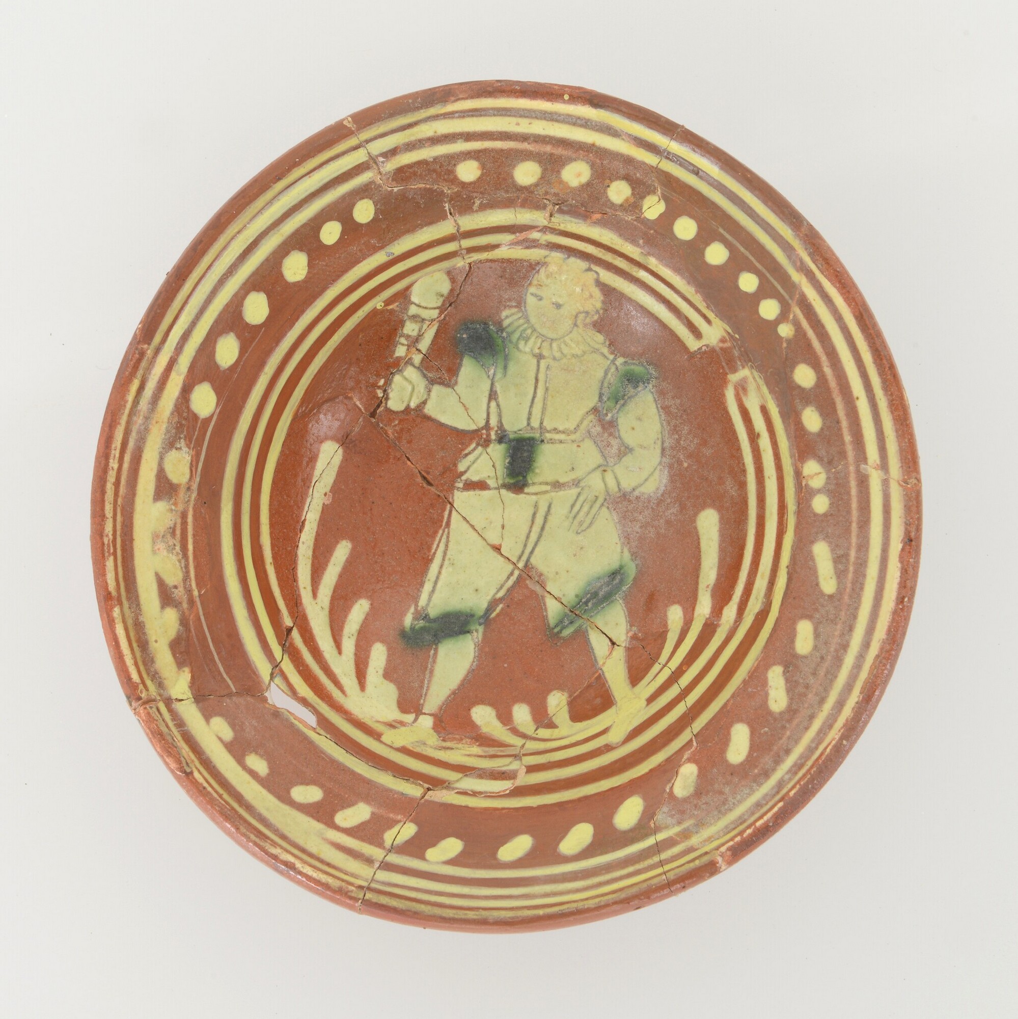 Bord; wa-bor-1; roodbakkend; loodglazuur; slibversiering; slib-krastechniek; vlag: concentrische cirkels en stippen, spiegel: jongeman met hoog cilindrisch pasglas; standvlak; productieplaats: Enkhuizen
