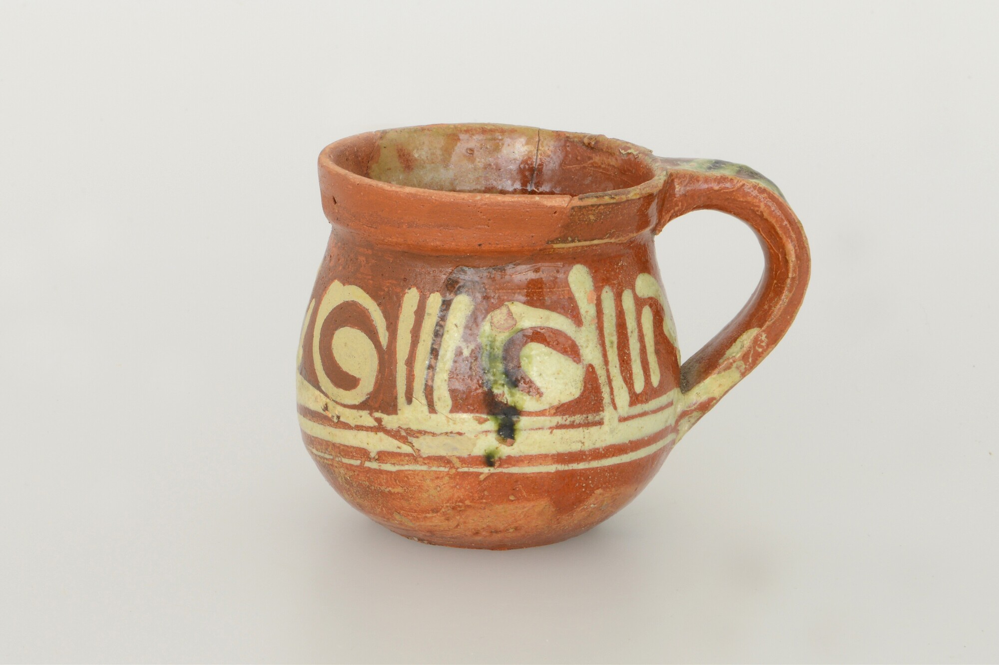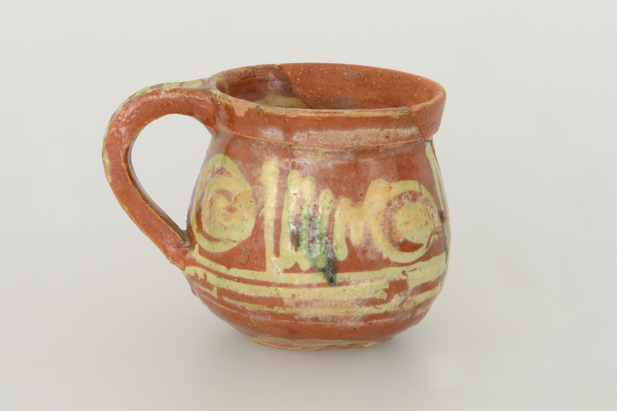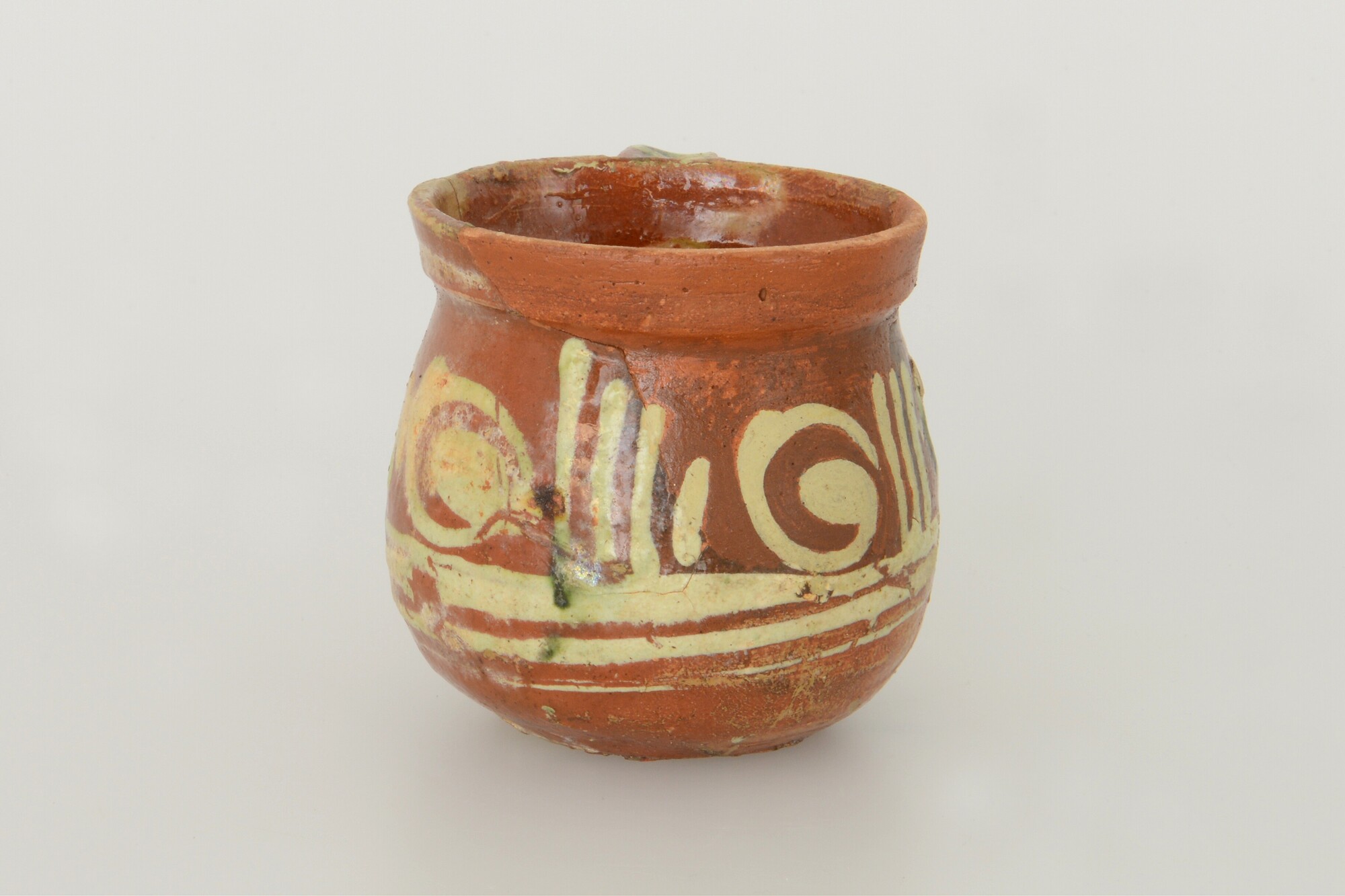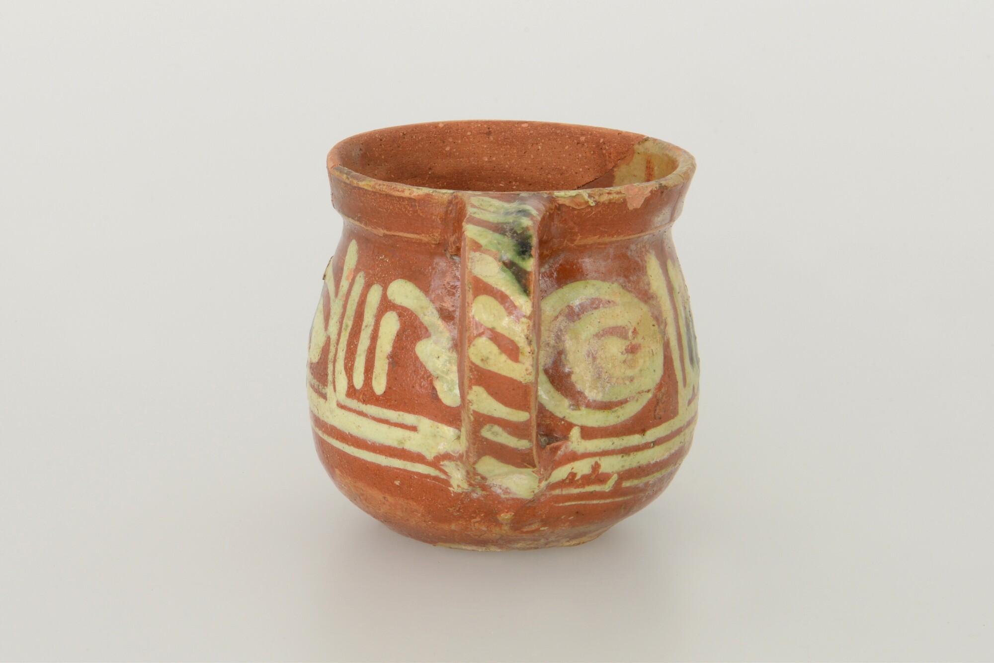 Kop/drinkvorm; r-kop; roodbakkend aardewerk; in- en uitwendig loodglazuur; uitwendige slibversiering: spiralen, concentrische cirkels, begrensd door een drietal horizontale spiraalwindingen; verticaal lintoor; standvlak; productieplaats: Enkhuizen