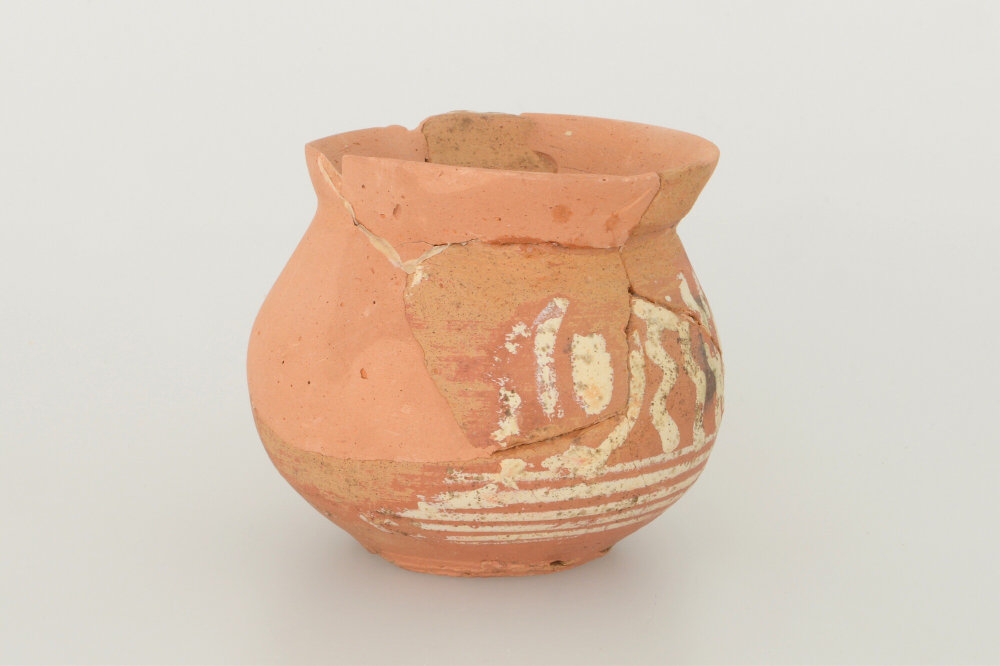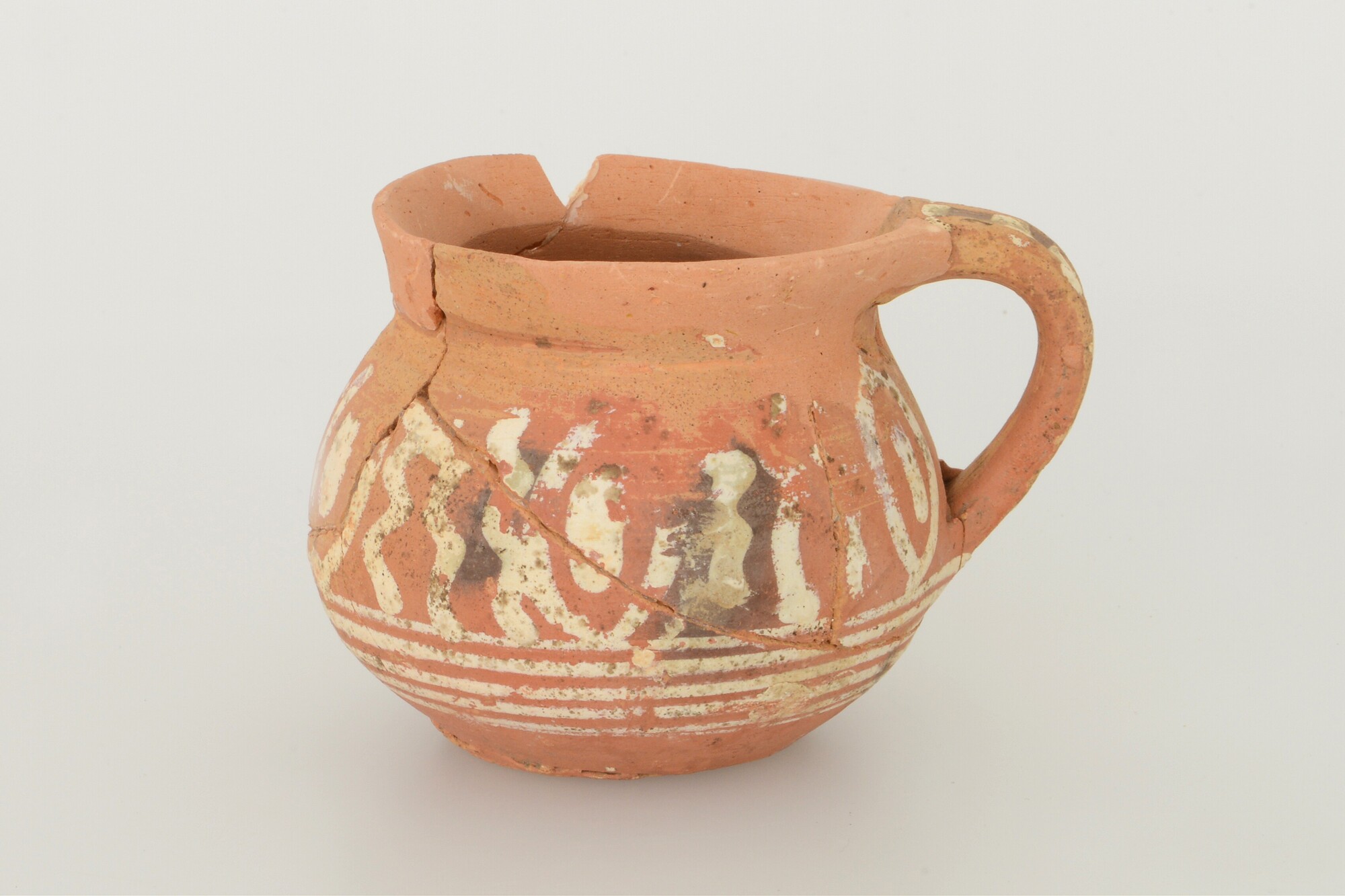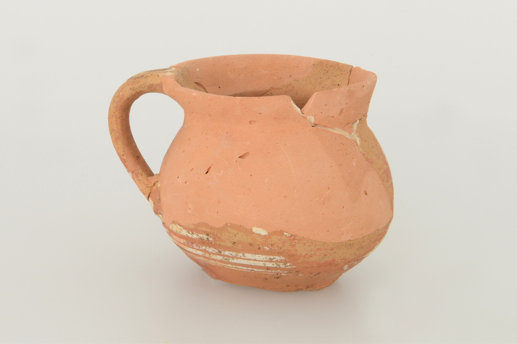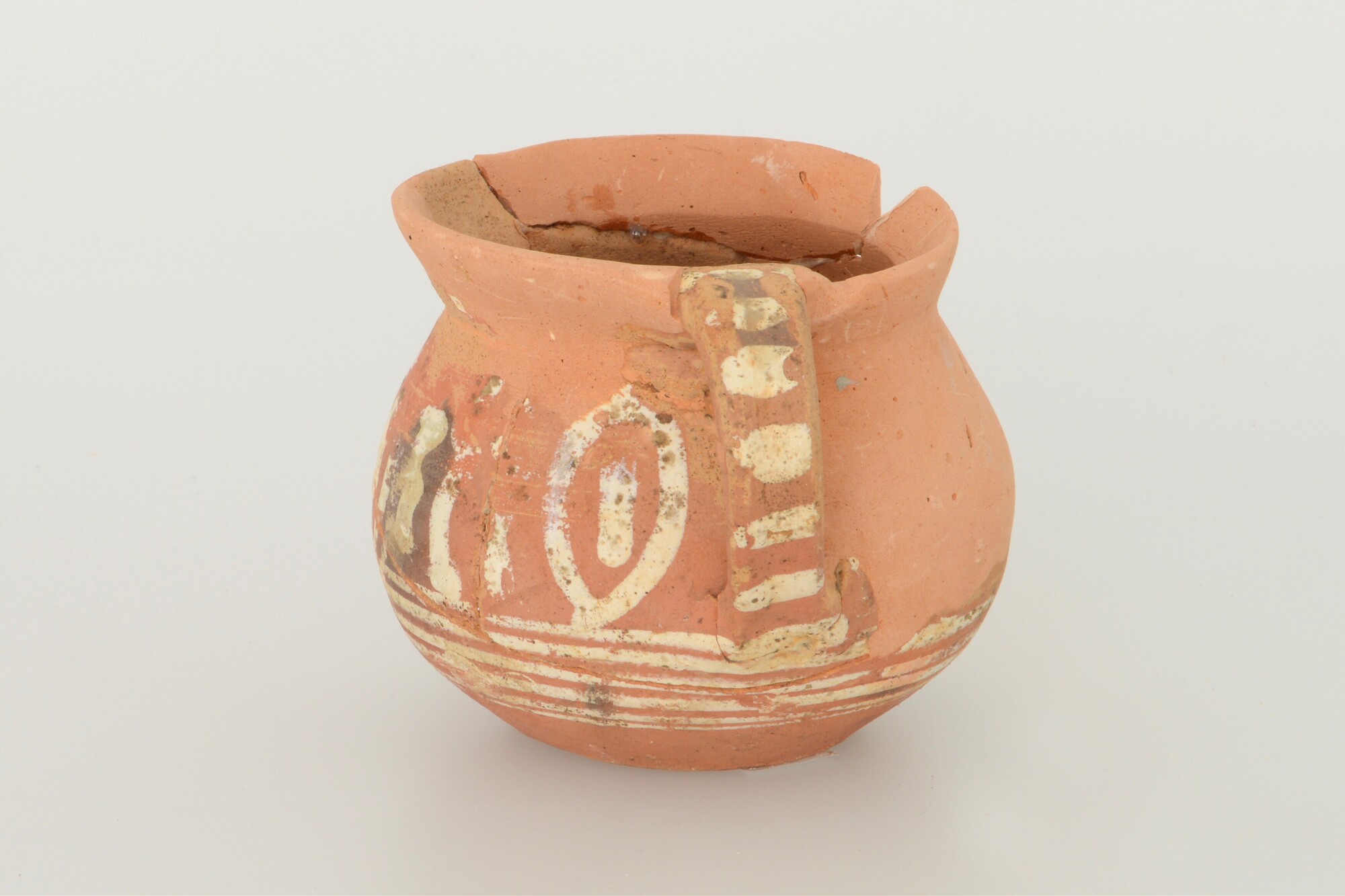 Kop/drinkvorm; r-kop; roodbakkend aardewerk; halffabricaat, biscuit; slibversiering: spiralen, concentrische cirkels, begrends door een drietal horizontale spiraalwindingen; verticaal lintoor; standvlak; productieplaats: Enkhuizen