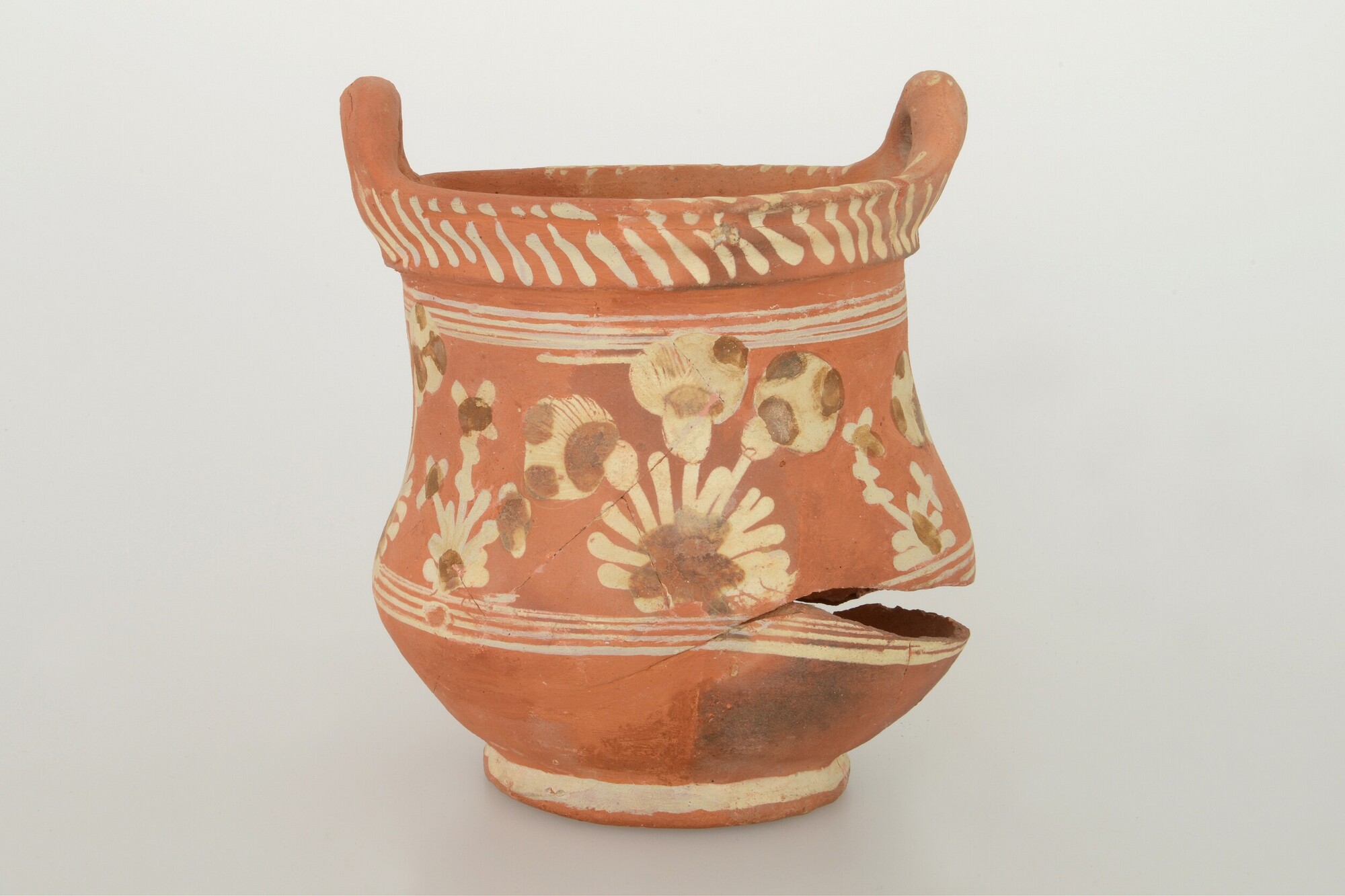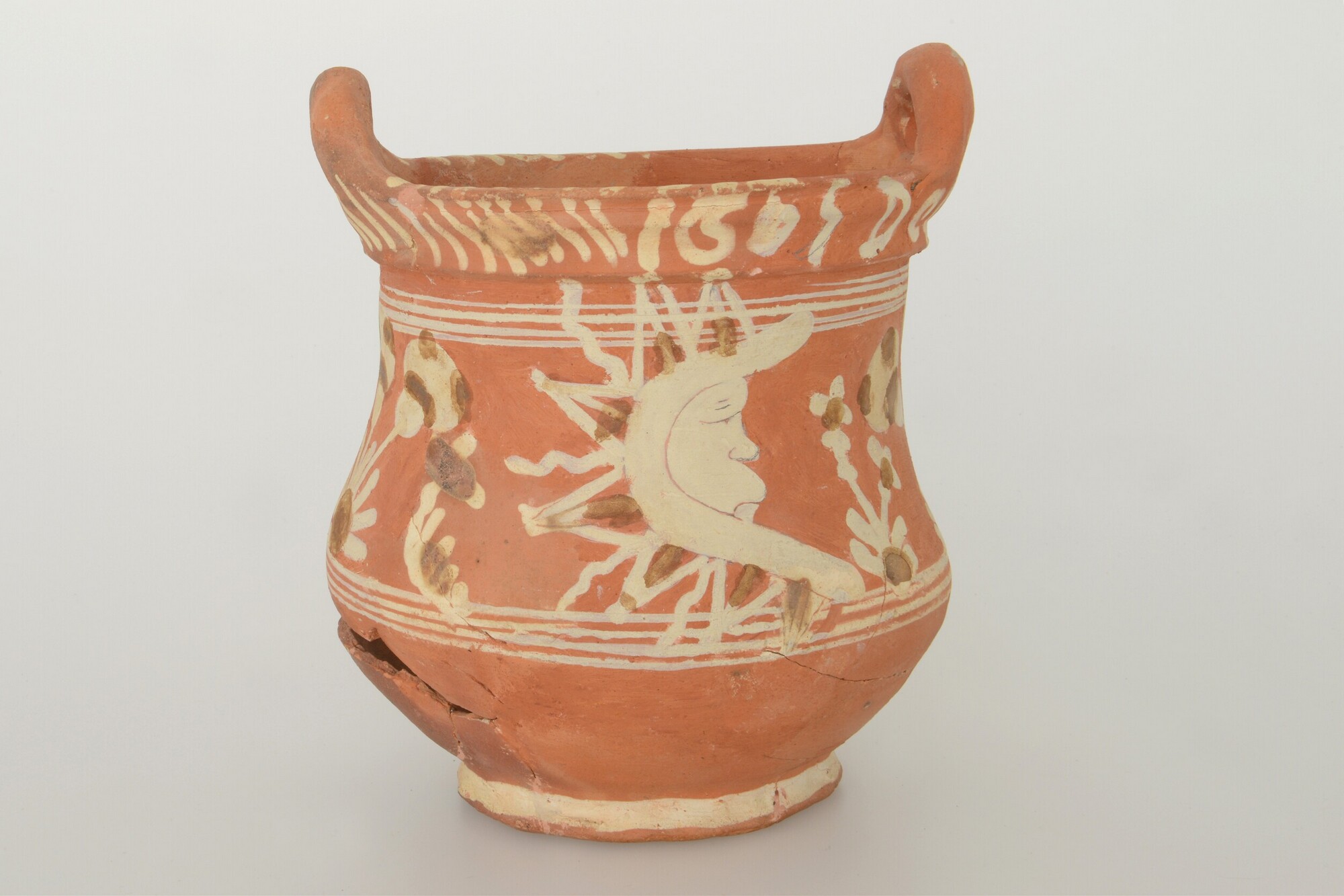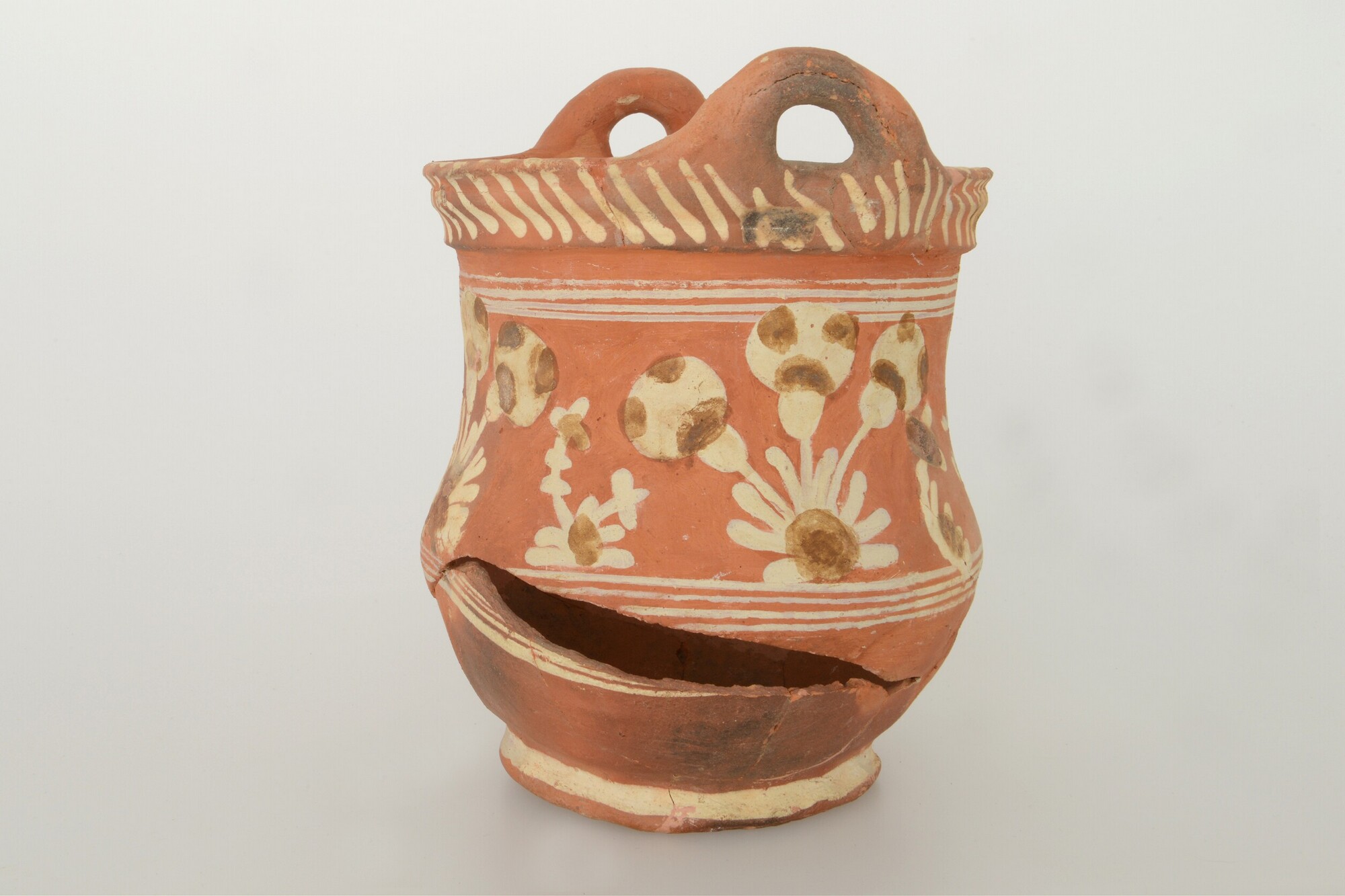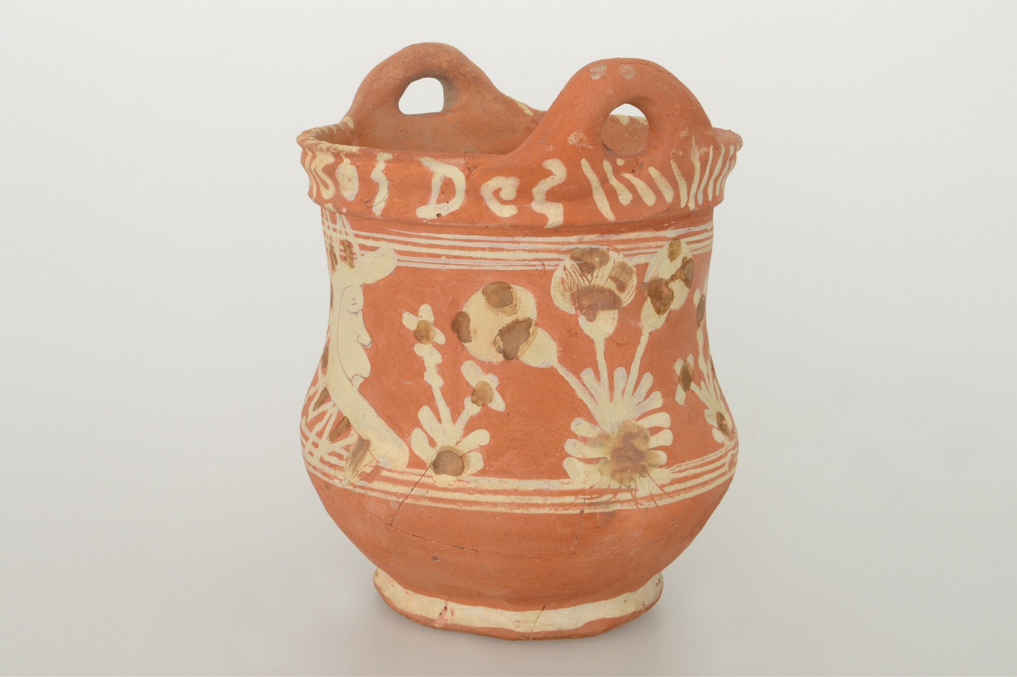 Oorpot; wa-pot-2; roodbakkend, halffabricaat, biscuit; slibversiering; slib-krastechniek; somber kijkende maan met distelbloemen, initialen DCS en jaartal 1605; standvlak, twee verticale worstoren op de rand; productieplaats: Enkhuizen