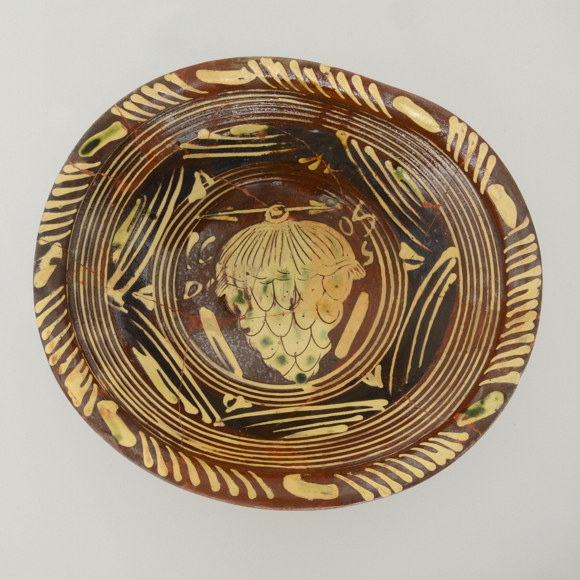 Kom; wa-kom-2; roodbakkend, verbrand en vervormd; loodglazuur, slibversiering; slib-krastechniek; vl: concentrische cirkels, ornamentbanden, sp: druiventros, initialen DCS en jaartal 1605; standvlak; productieplaats: Enkhuizen