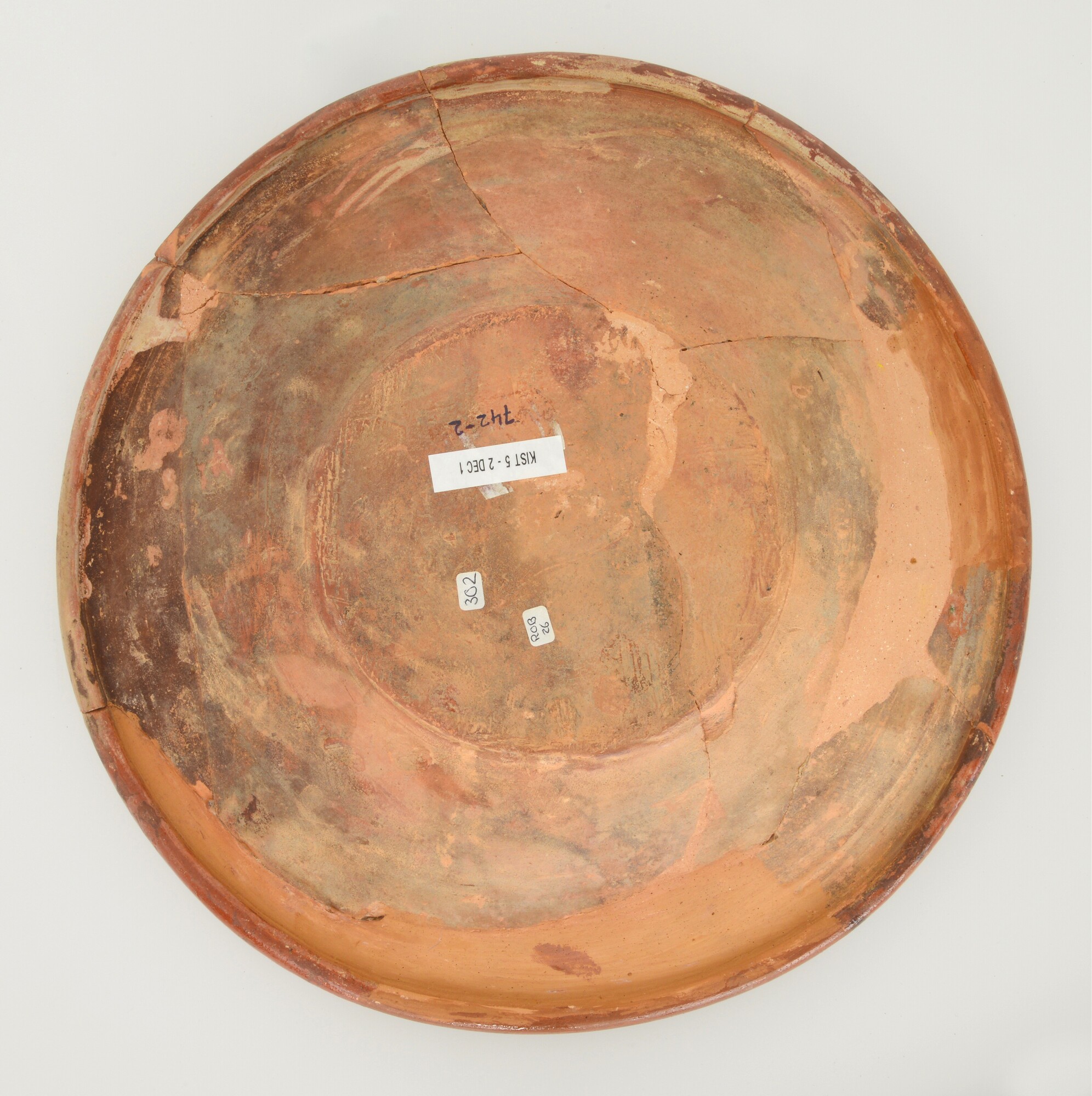 Bord; wa-bor-1; roodbakkend, loodglazuur, slibversiering; slib-krastechniek; vl: concentrische cirkels, ornamentbanden, sp: jongeman met beker, initialen DCS en jaartal 1605; standvlak; productieplaats: Enkhuizen