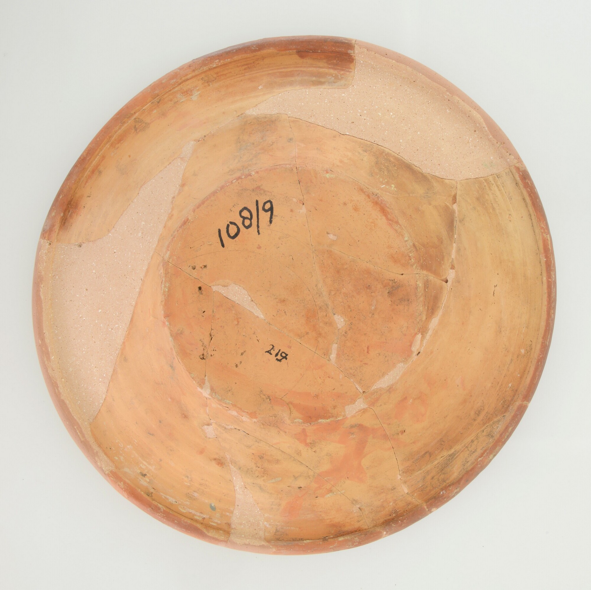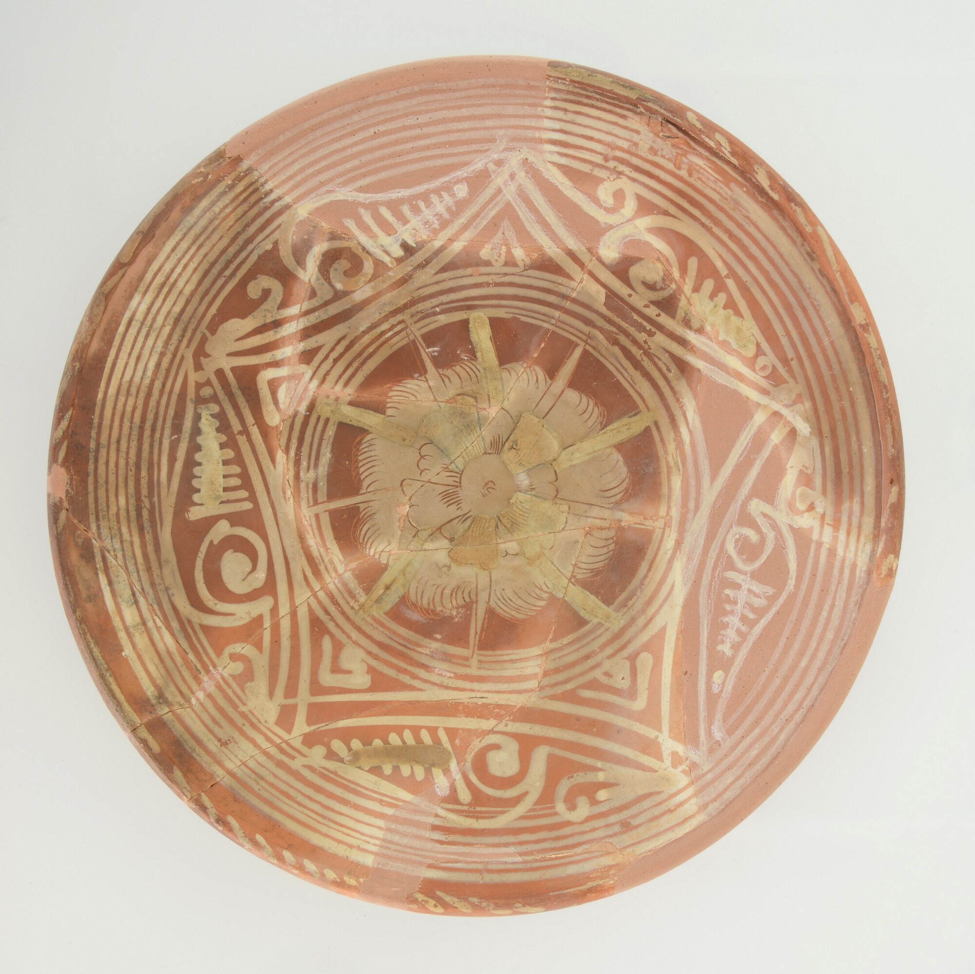 Schotel; wa-bor-1; roodbakkend; halffabricaat, biscuit; slibversiering, slib-krastechniek; vl: concentrische cirkels, ornamentbanden, sp: bolderik; standvlak; productieplaats: Enkhuizen