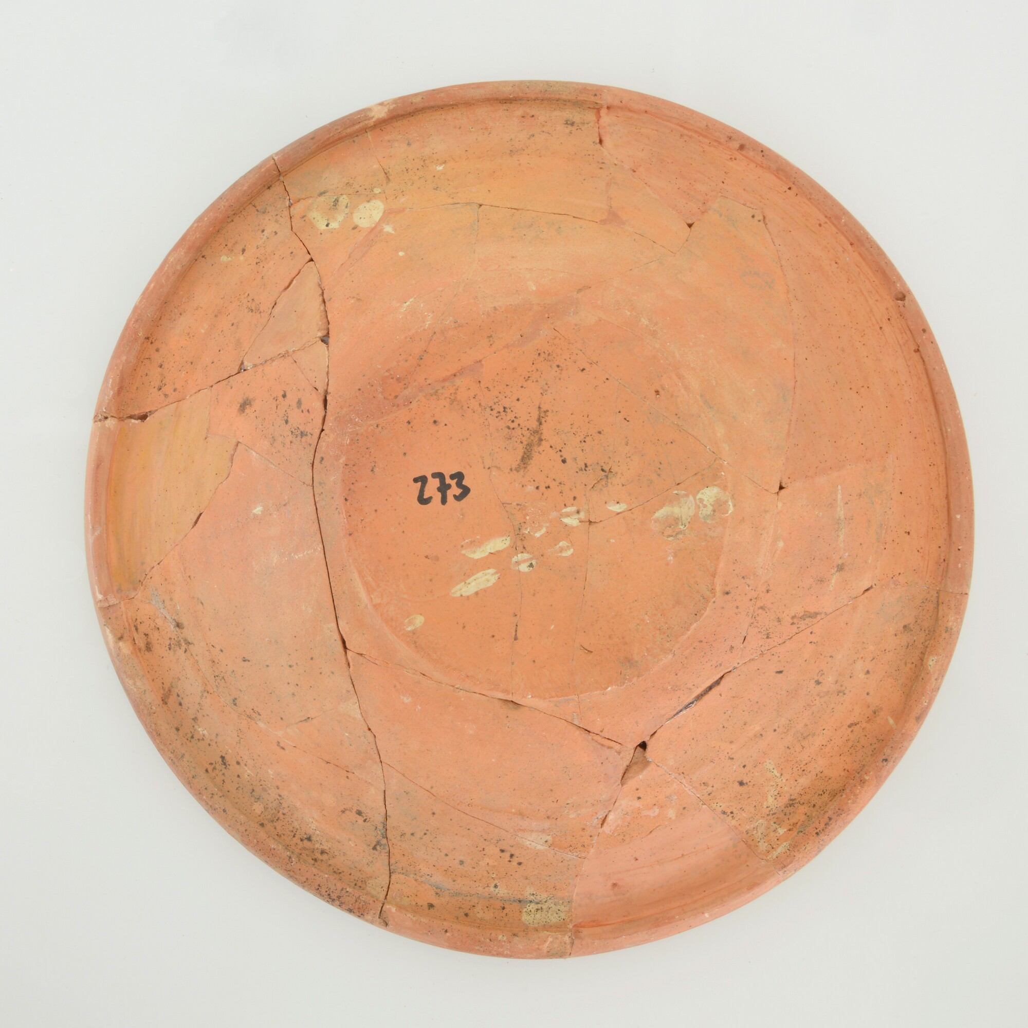Schotel; wa-bor-1; roodbakkend; halffabricaat, biscuit; slibversiering, slib-krastechniek; vlag: concentrische cirkels, ornamentbanden, spiegel: danspaar en jaartal 1605 en onder het pasglas het jaartal 160(?); standvlak; productieplaats: Enkhuizen