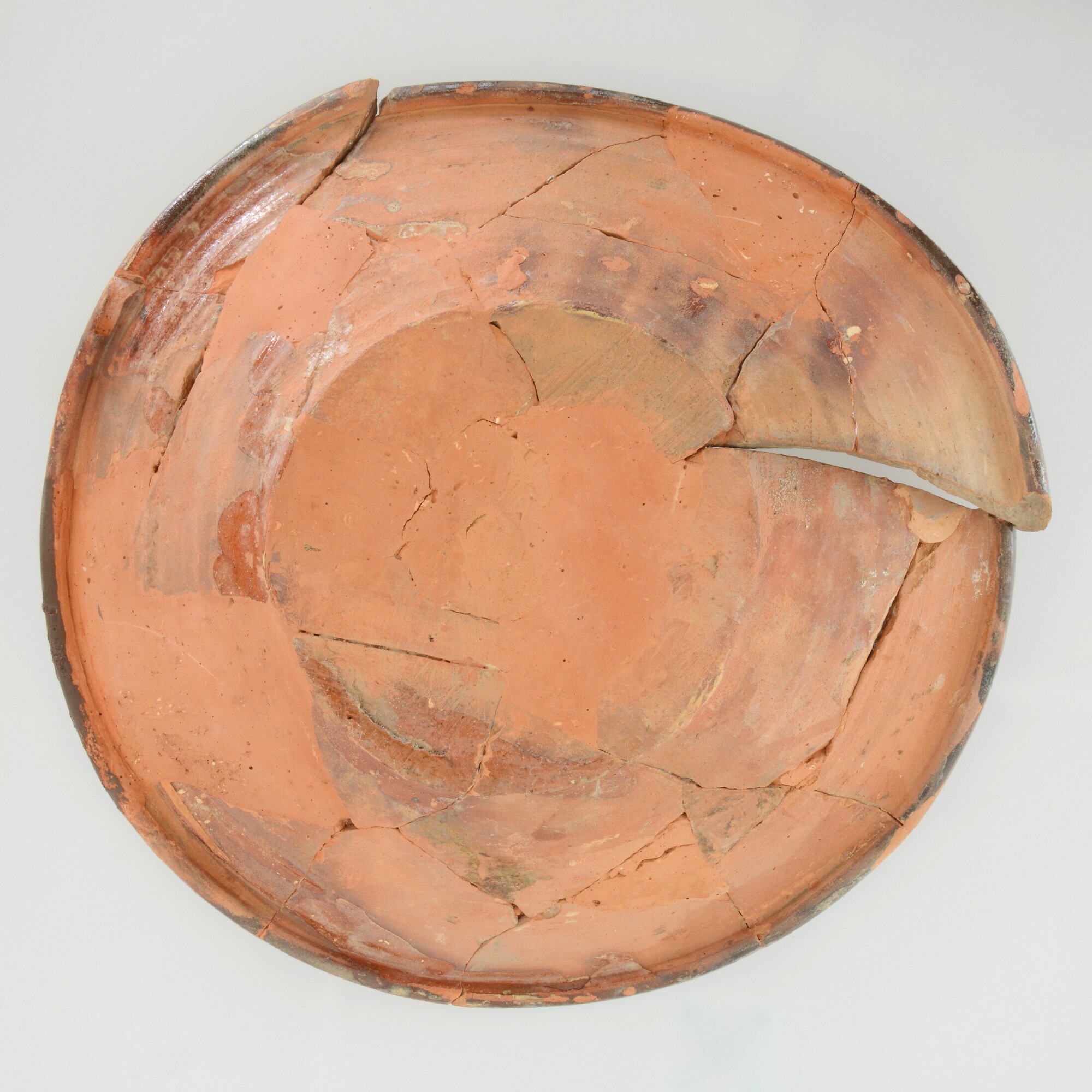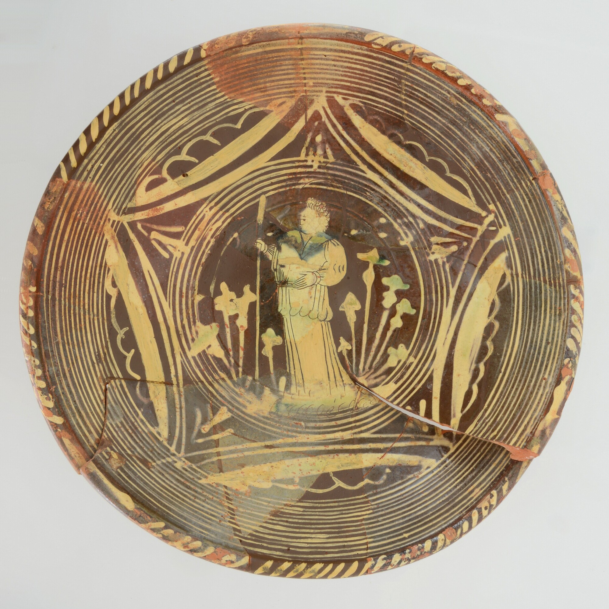 Schotel; wa-bor-1; roodbakkend; loodglazuur; slibversiering, slib-krastechniek; vl: concentrische cirkels, ornamentbanden, sp: Heilige Thomas, initialen DCS en jaartal 1605; standvlak; productieplaats: Enkhuizen