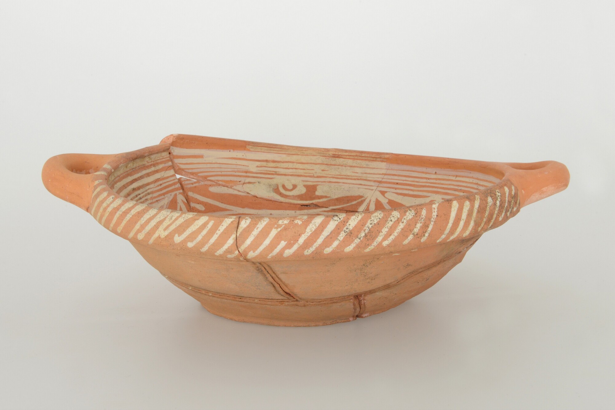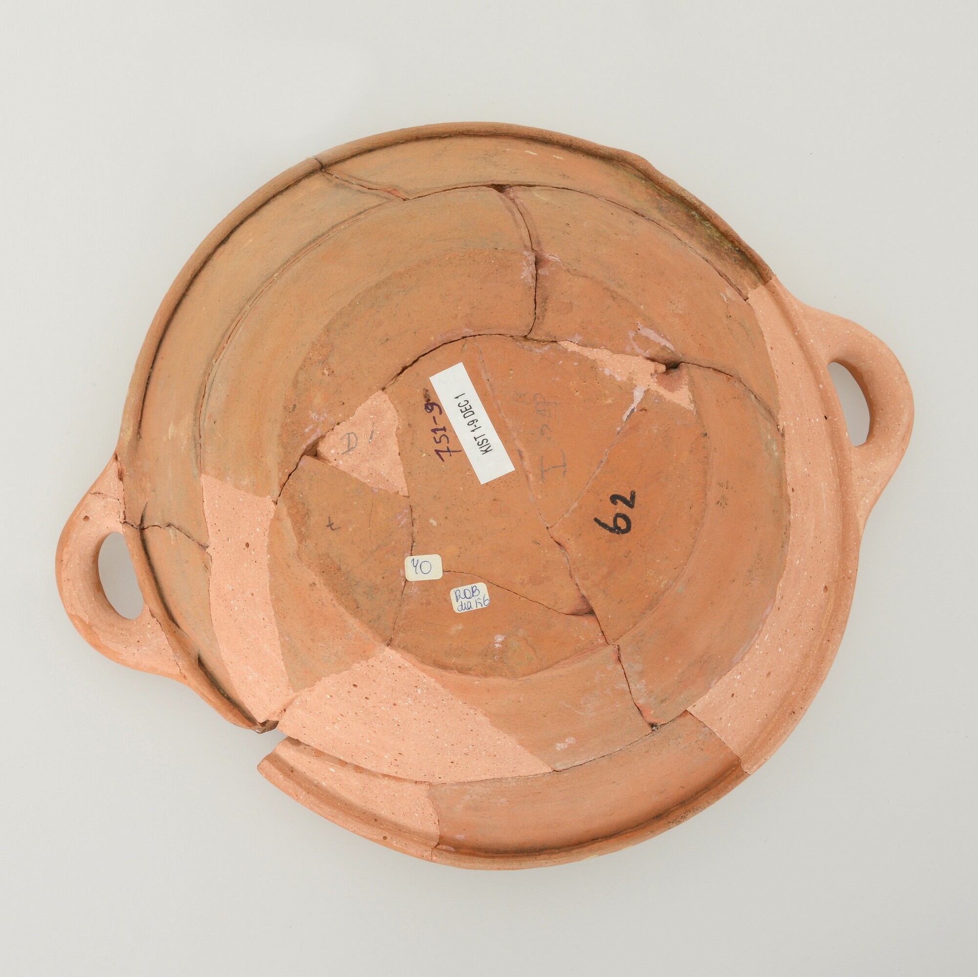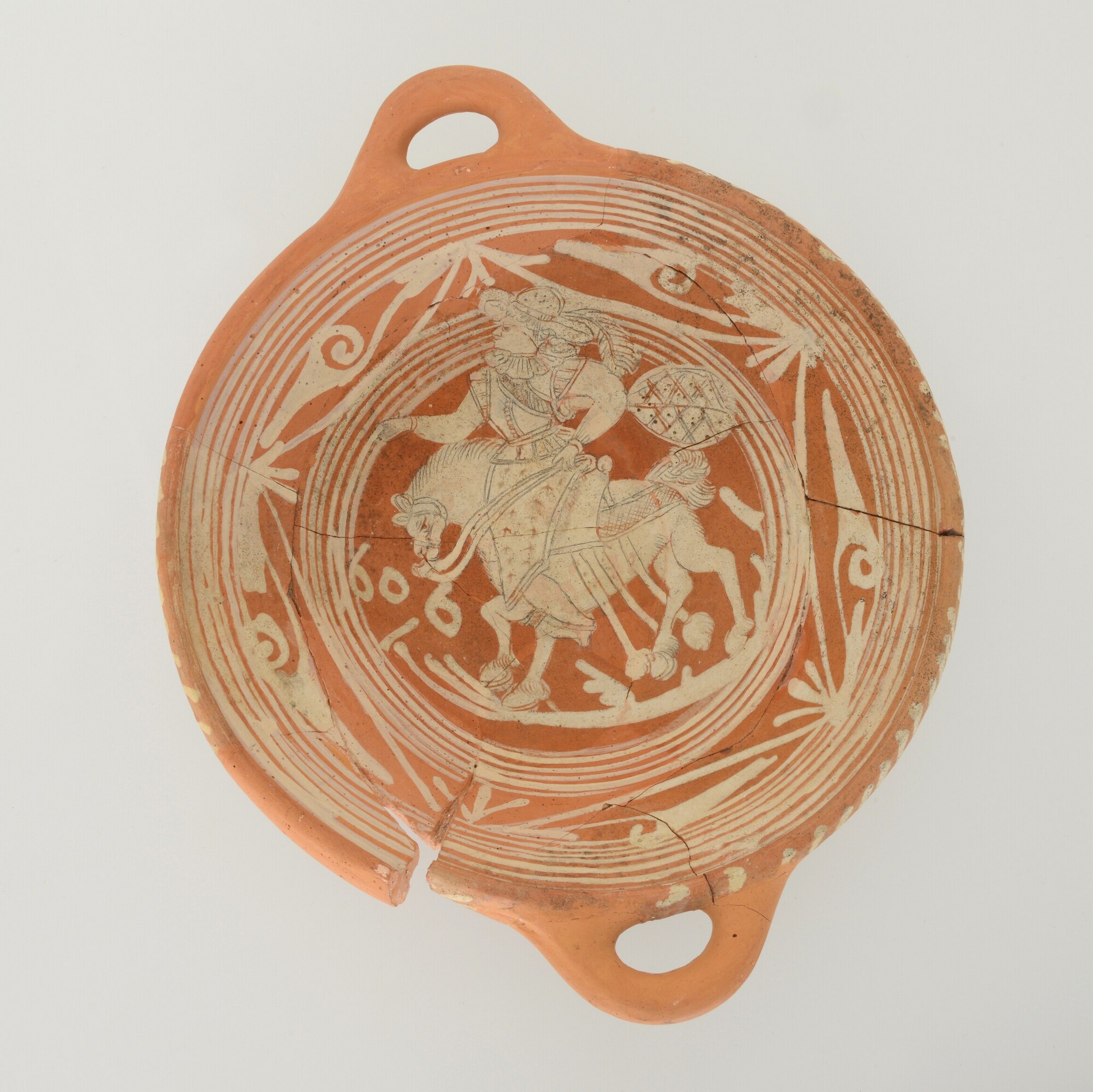Kom; wa-kom-1; roodbakkend, halffabricaat; biscuit; slibversiering; vl: concentrische cirkels; sp: krijgsman met hoed en kuras te paard, 1606; standvlak; twee horizontale worstoren; productieplaats: Enkhuizen