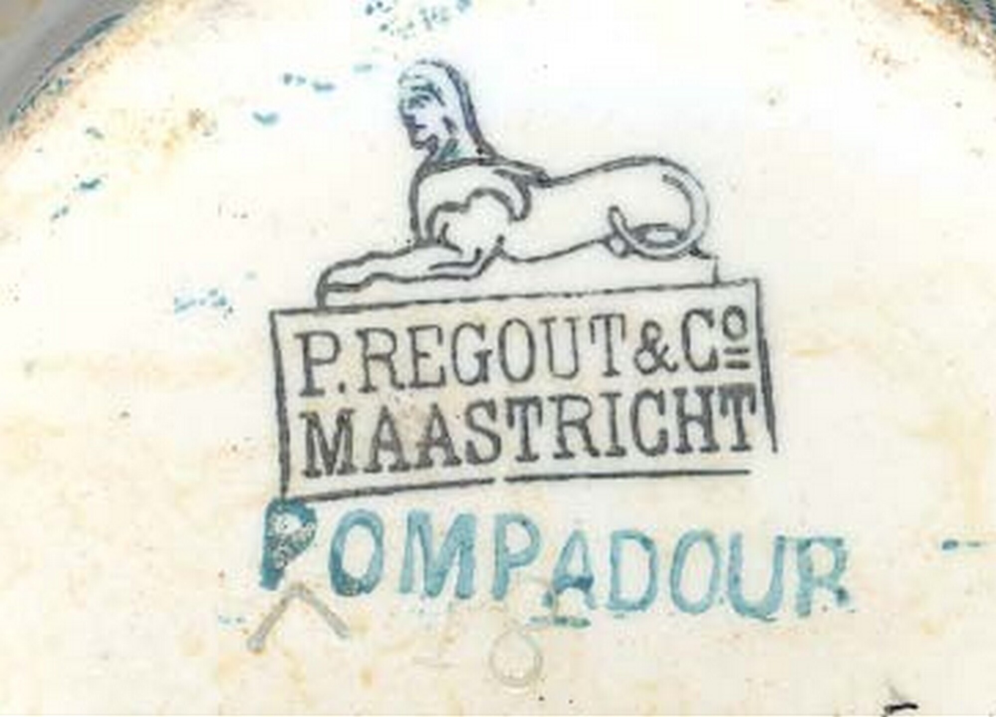 Kan / melkkan; iw-kan-5; peervormige kan met S-vormig uitgebogen hals en rand, met in model gesneden bovenrand, standring, verticaal lintoor; industrieel wit aardewerk (witgoed); loodglazuur; onderglazuur turqoisekleurig drukdecor 'Pompadour': bladertakken; herkomst: Maastricht, P. Regout & Co