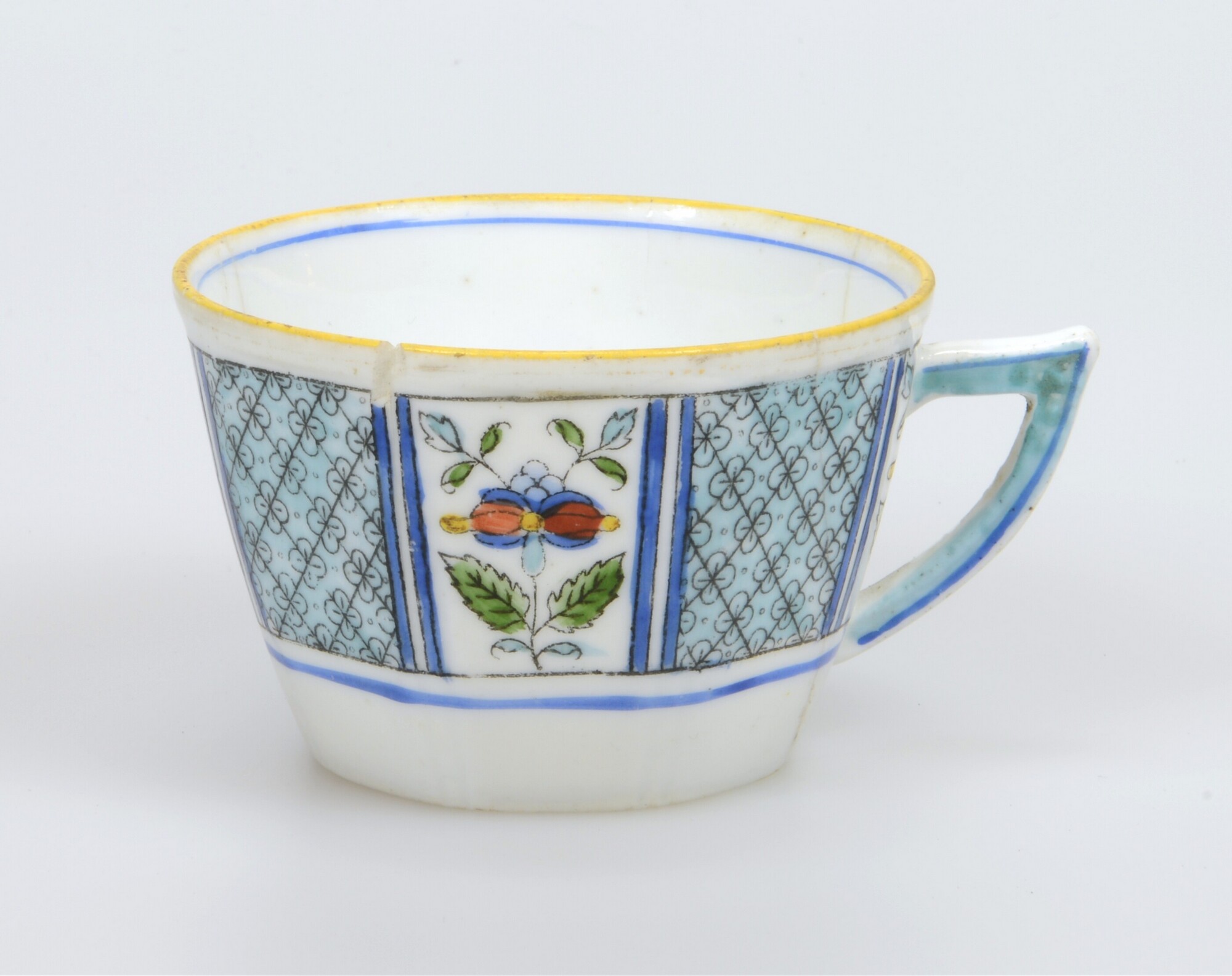 Kop; ep-kop-; achtzijdige conische kop met rechte rand, standring, verticaal puntig vormoor; Europees porselein; veldspaatglazuur; uitwendig overglazuur zwart drukdecor met polychrome beschildering: vlakken met servetwerk afgewisseld met florale motieven; blauwe biezen en gele rand; herkomst: West-Europa, mogelijk Maastricht, firma MOSA