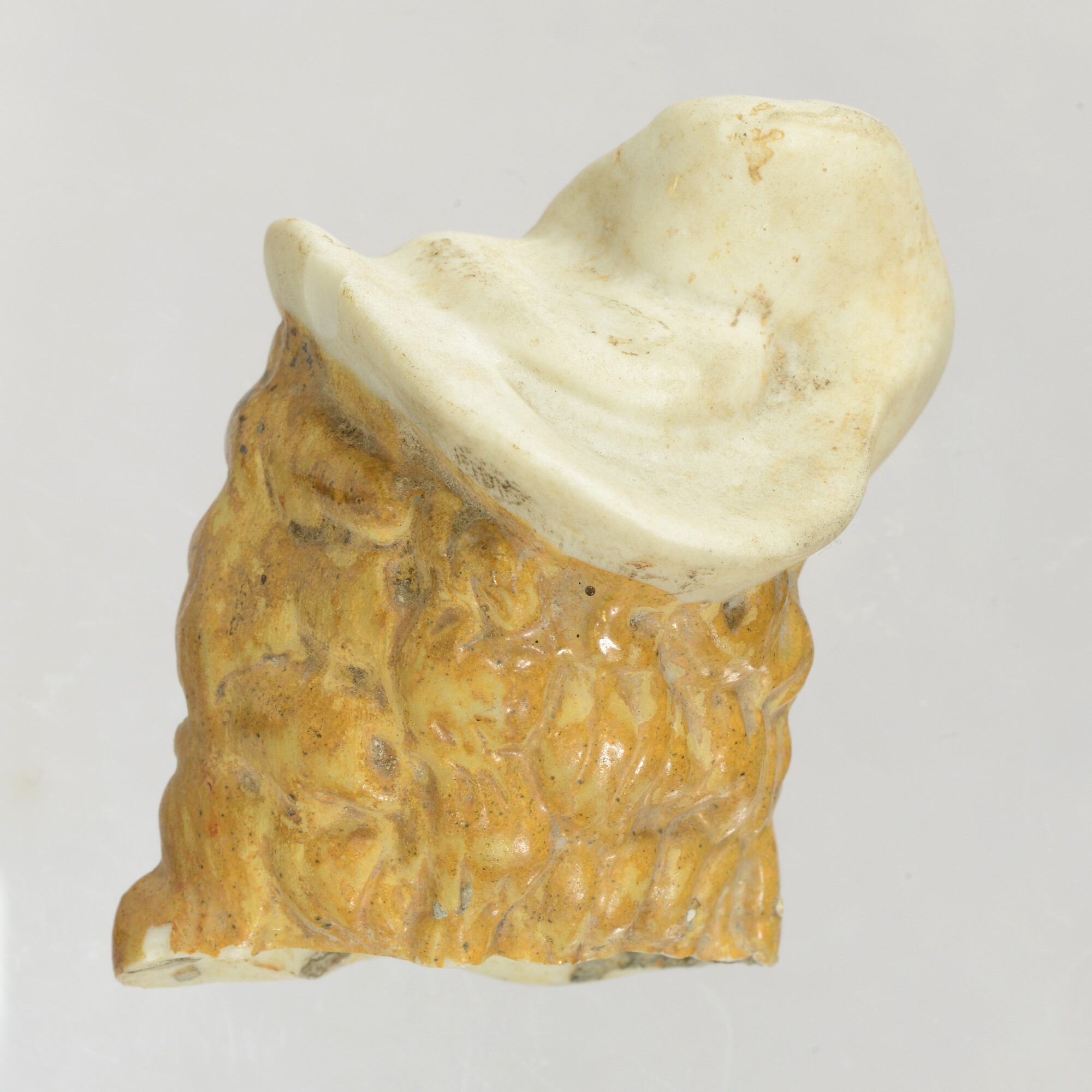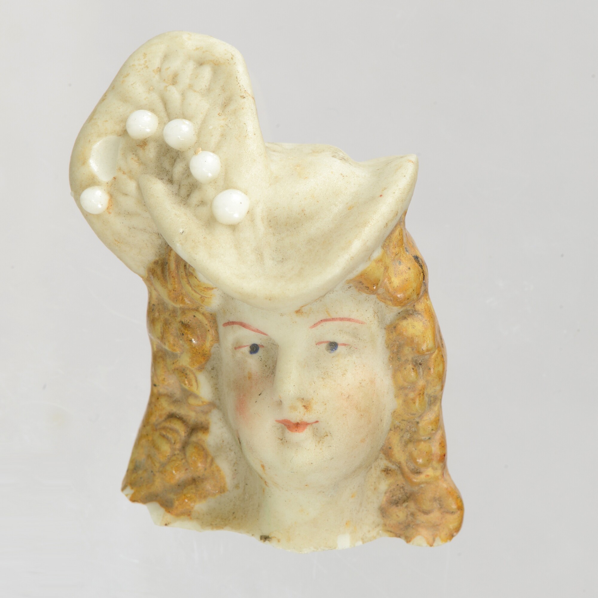 Beeld (fragment); vrouwenkop met hoed en veer; biscuit porselein met overglazuur polychrome beschildering; herkomst: Duitsland